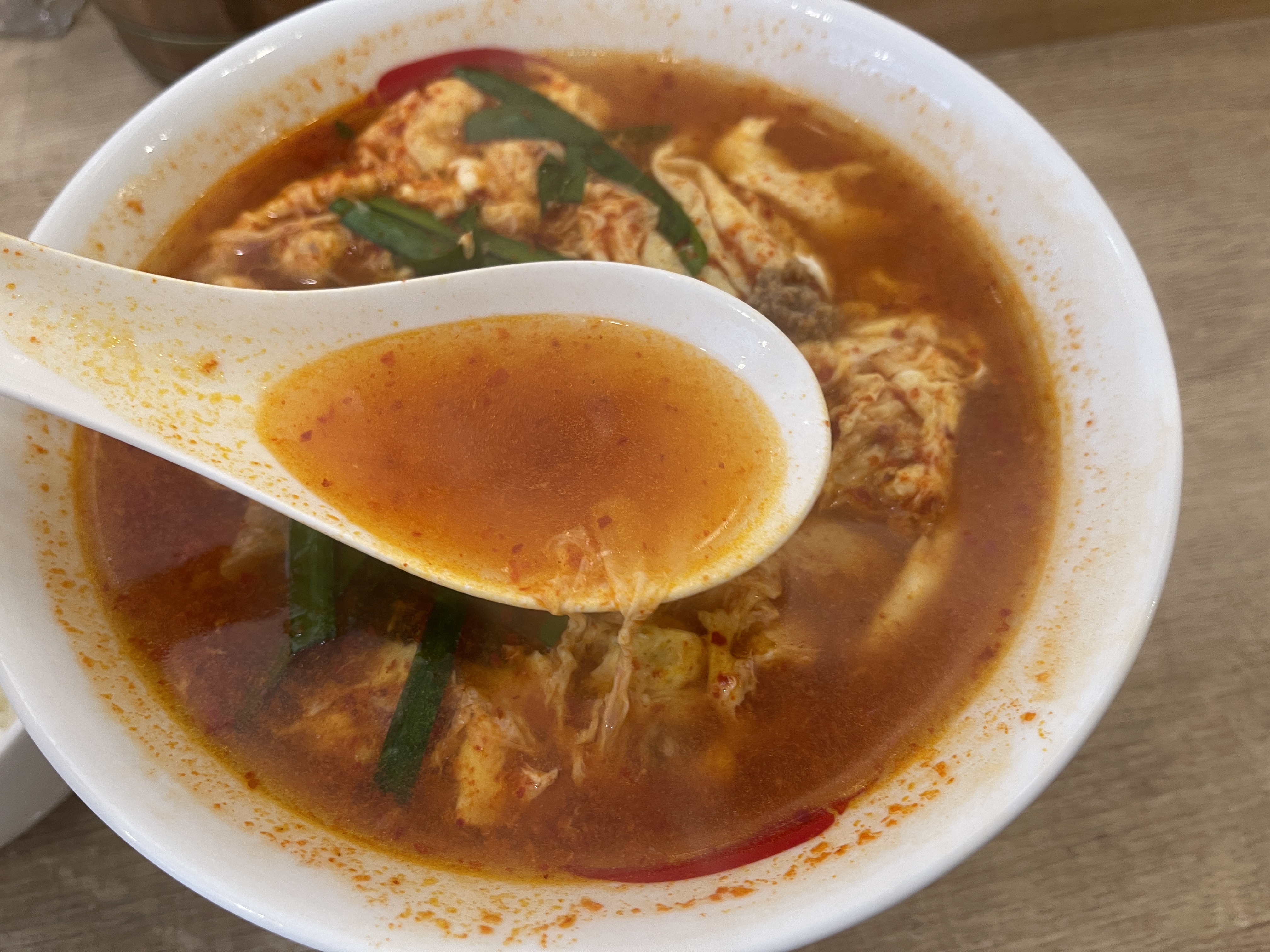 먼저 국물을 한 국자 떠서 먹어보니 전반적으로 얼큰합니다.