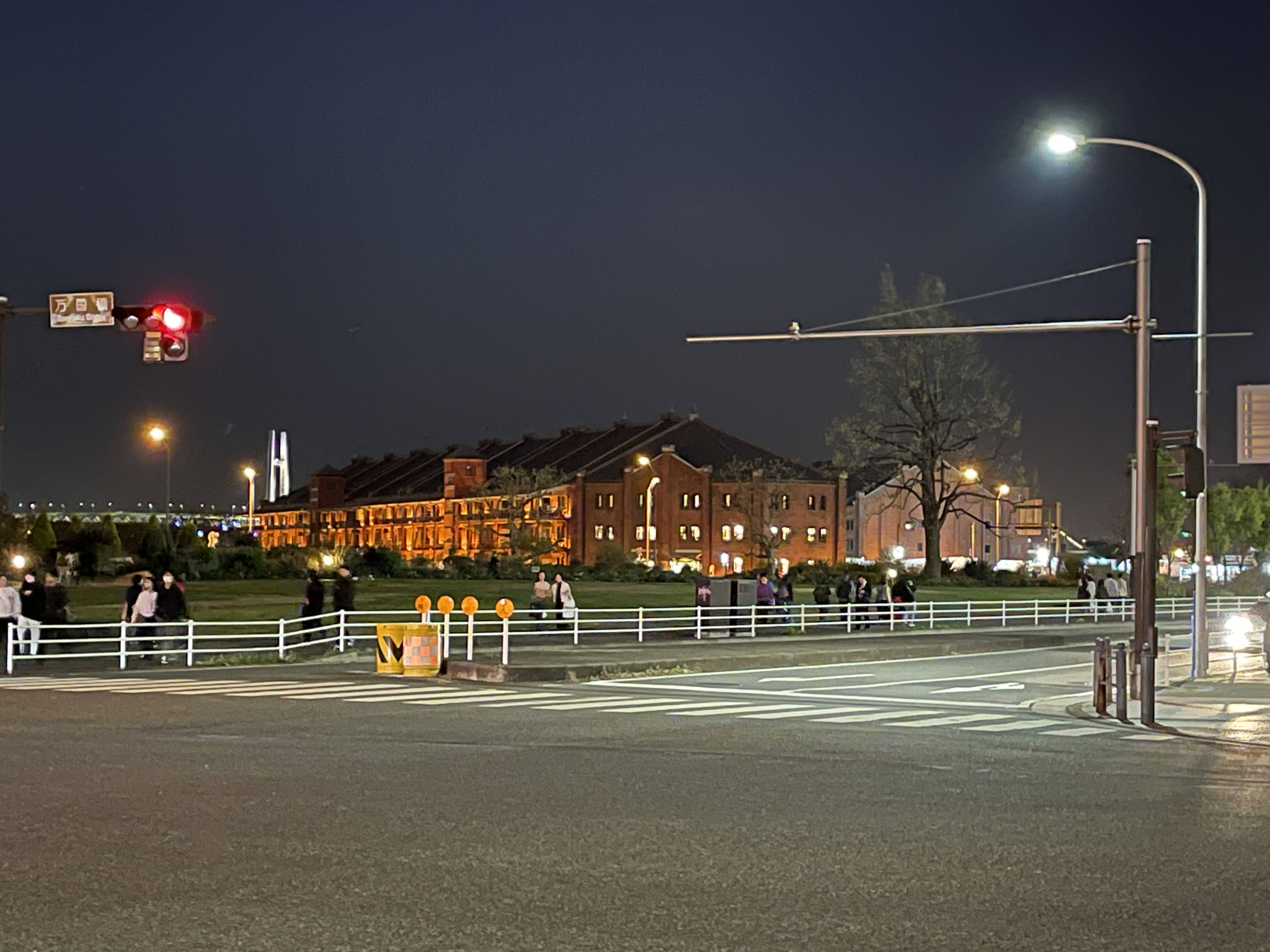불이 들어온 아카렌가 창고를 지나