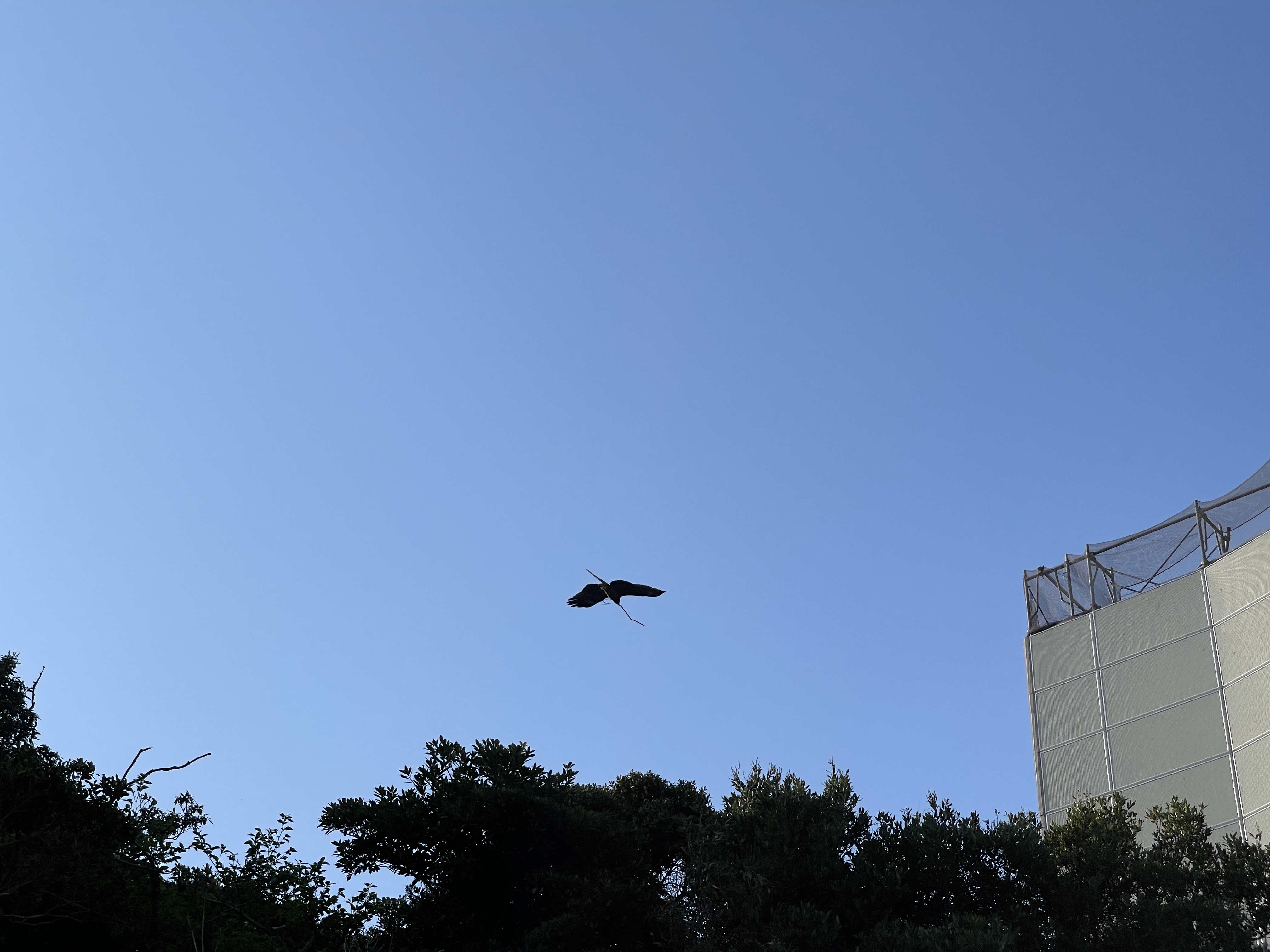 나뭇가지를 입에 물고 나는 새를 바라보고