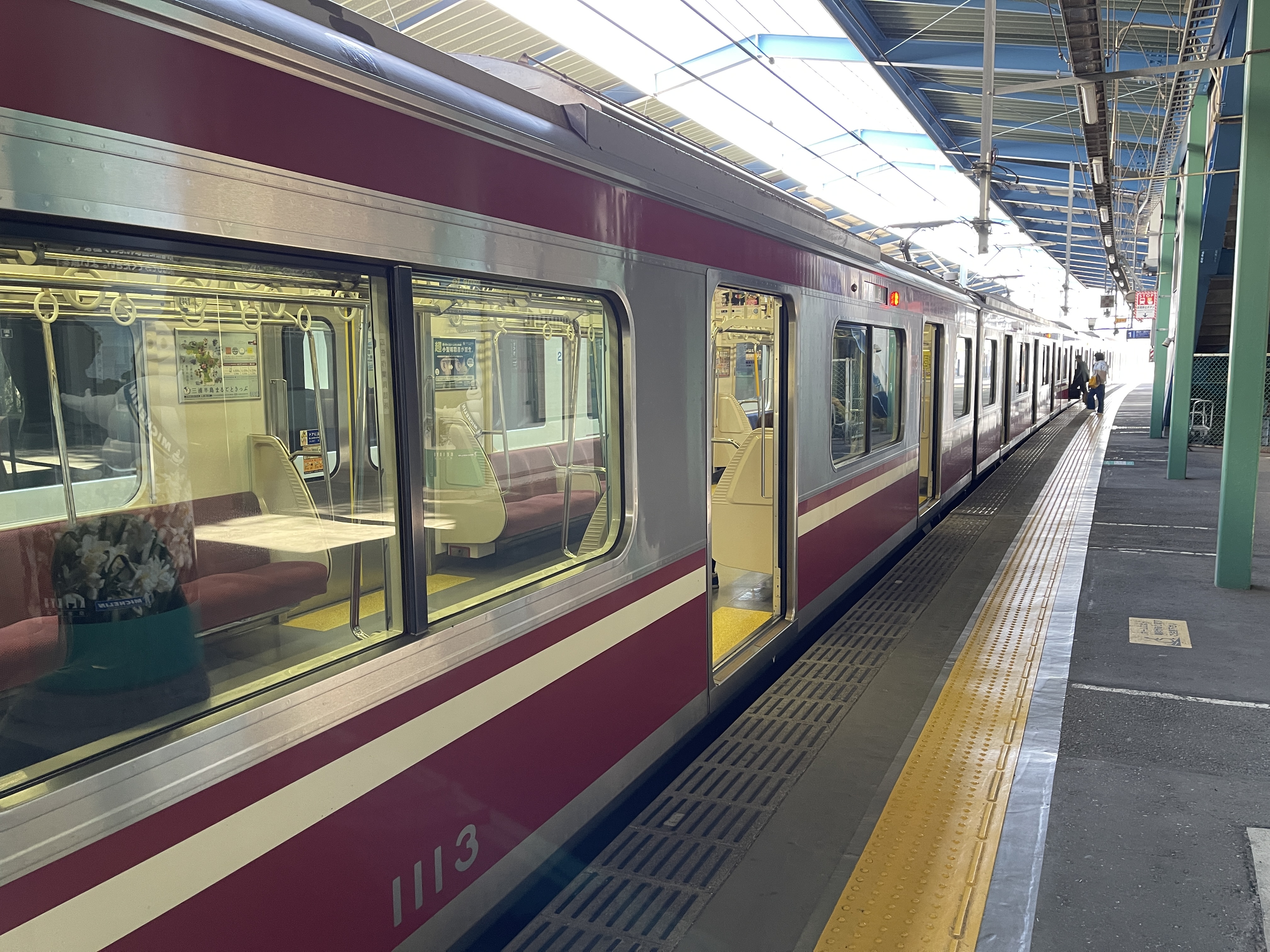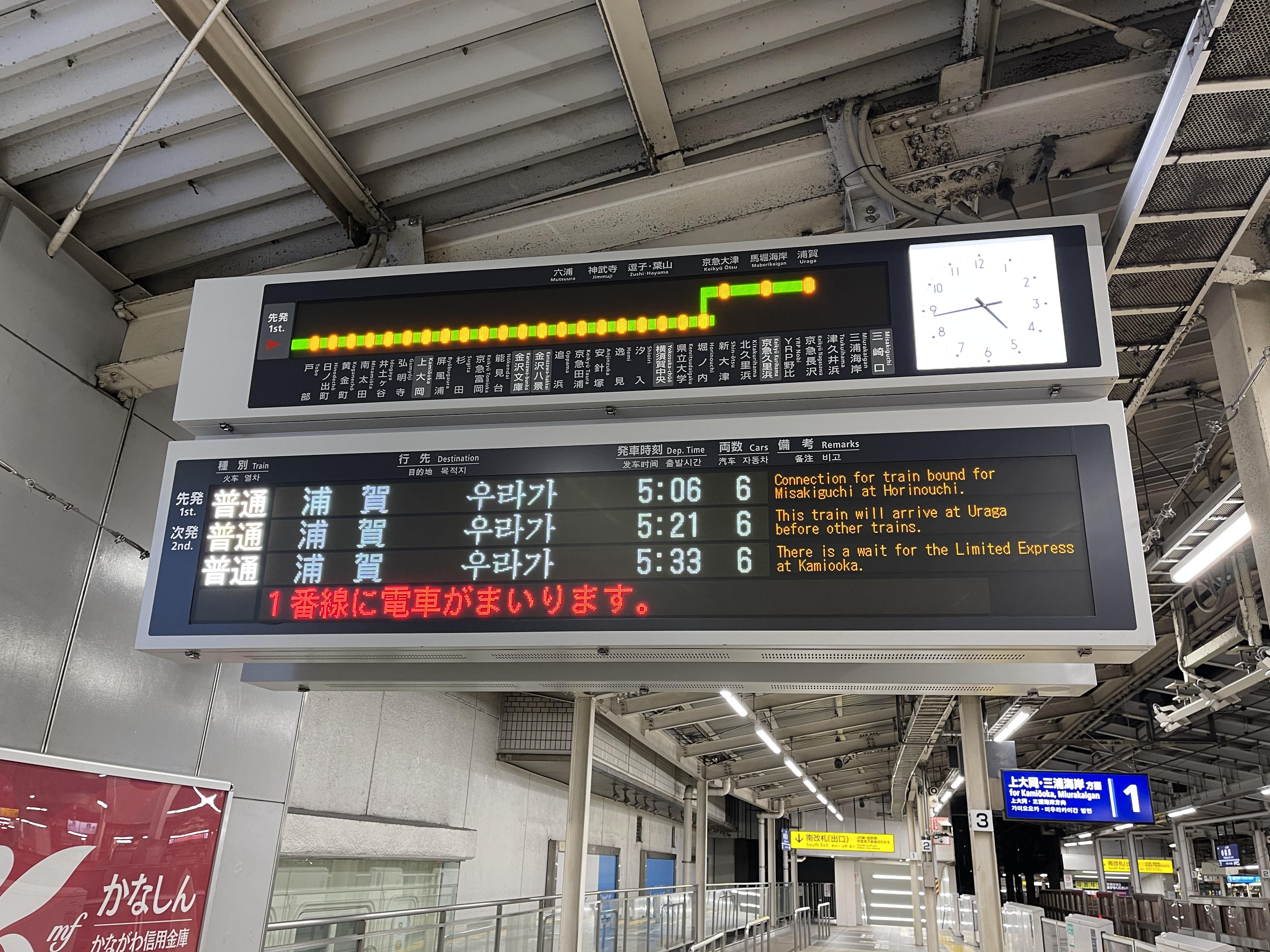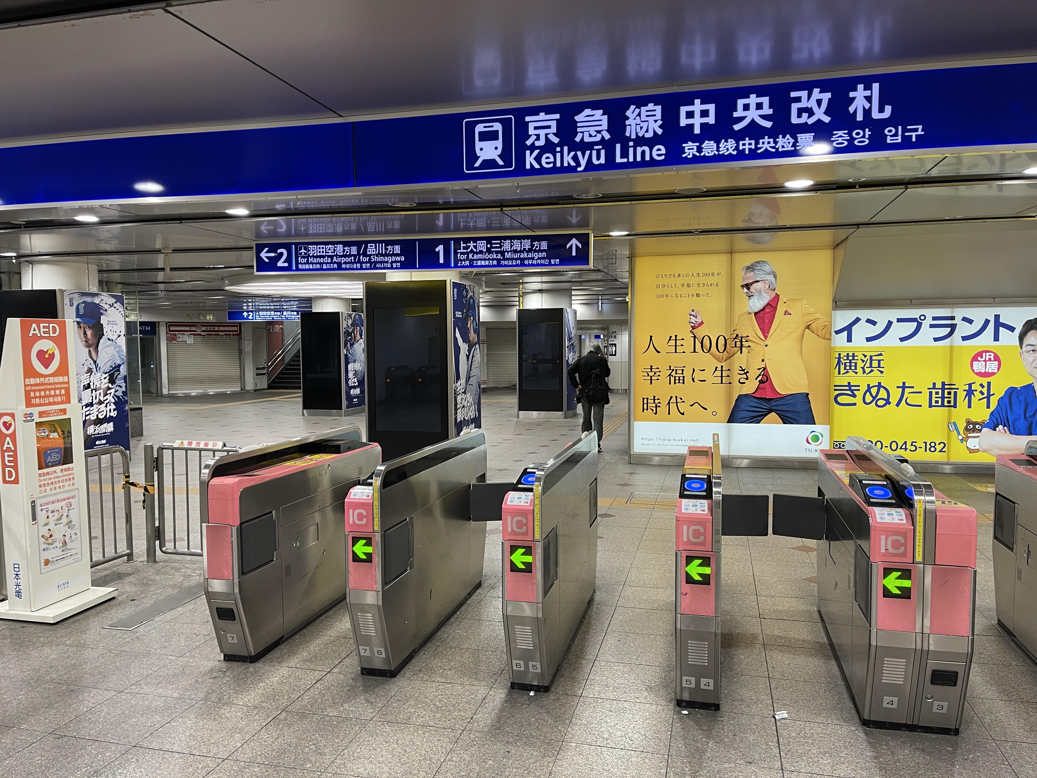 오전 5시 6분에 요코하마역을 출발하는 케이큐 첫차를 탑니다.
