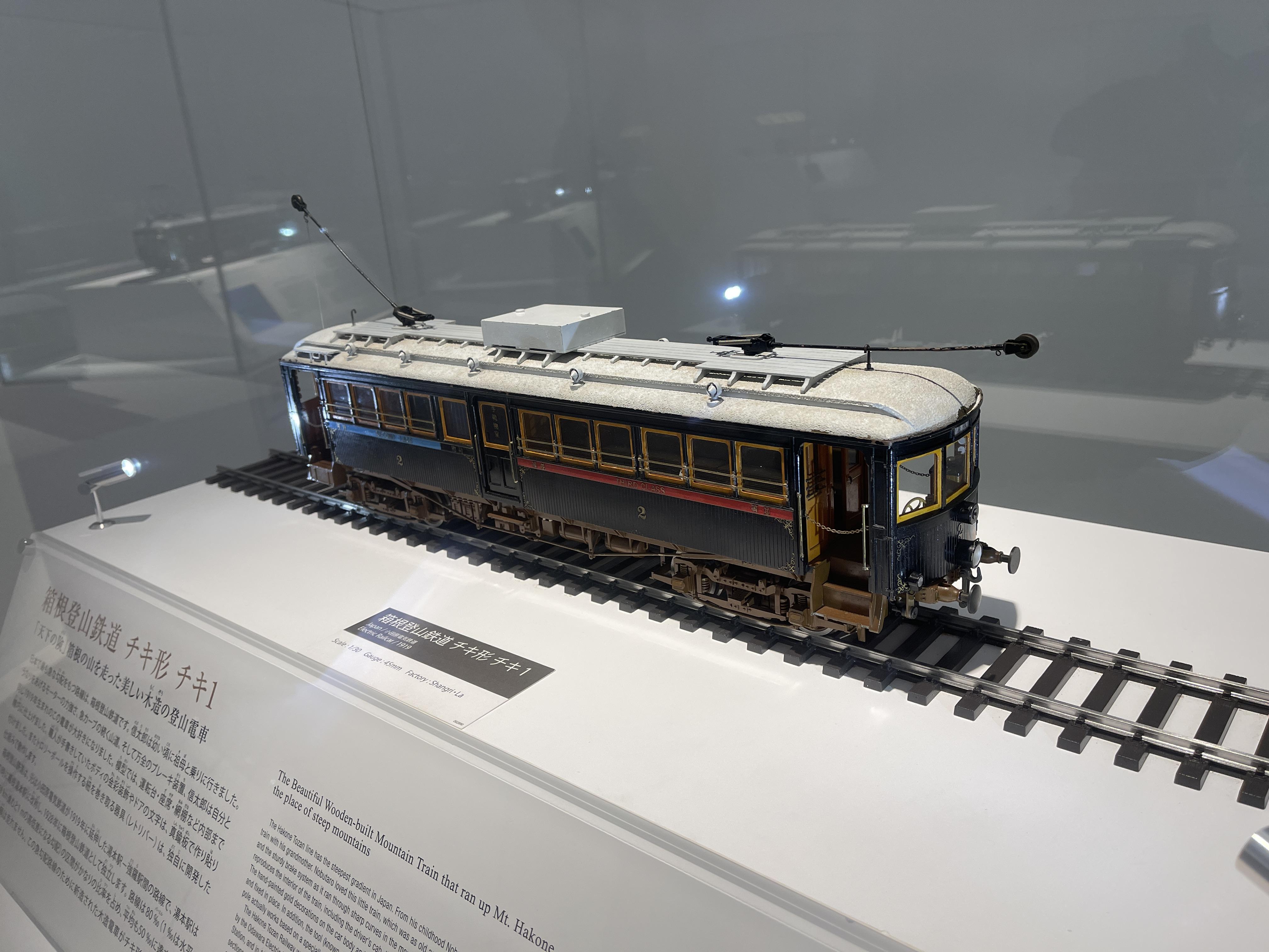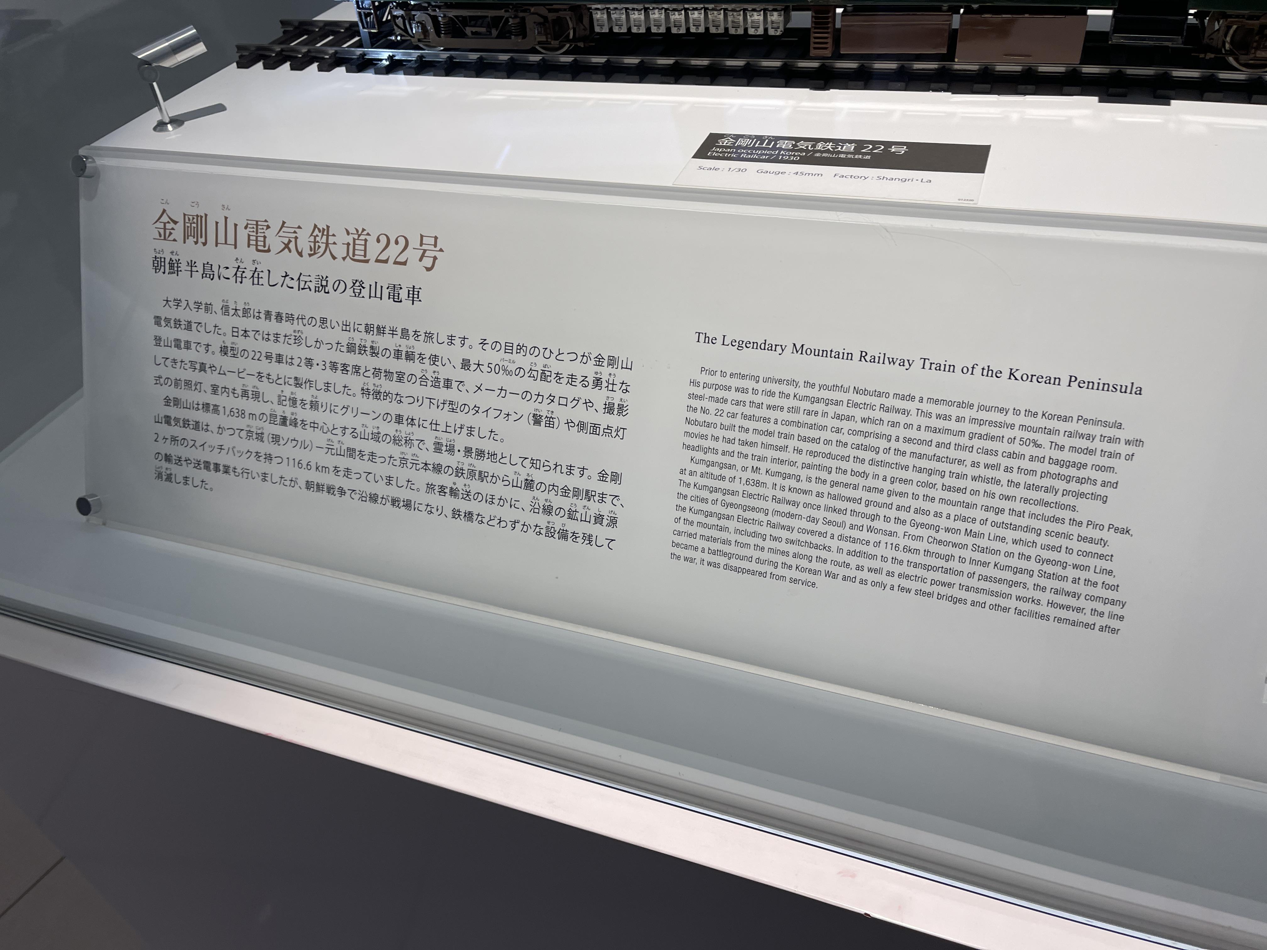 모형 앞에 붙은 이름표에 적힌 글자는 金剛山電気鉄道22号.