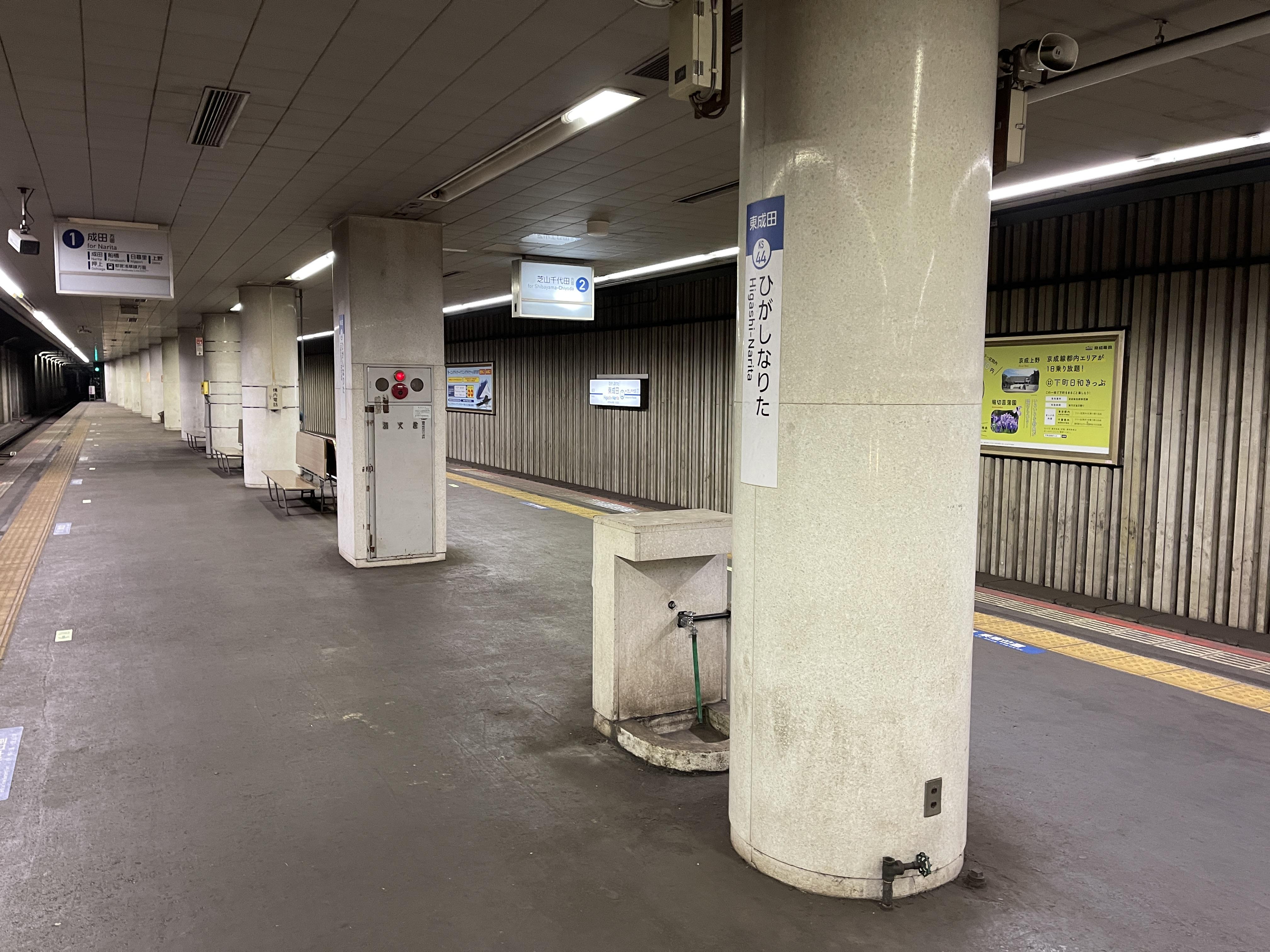 흐릿하게 보이는 역명판을 보면 역명이 히가시나리타가 아닌 나리타쿠코,