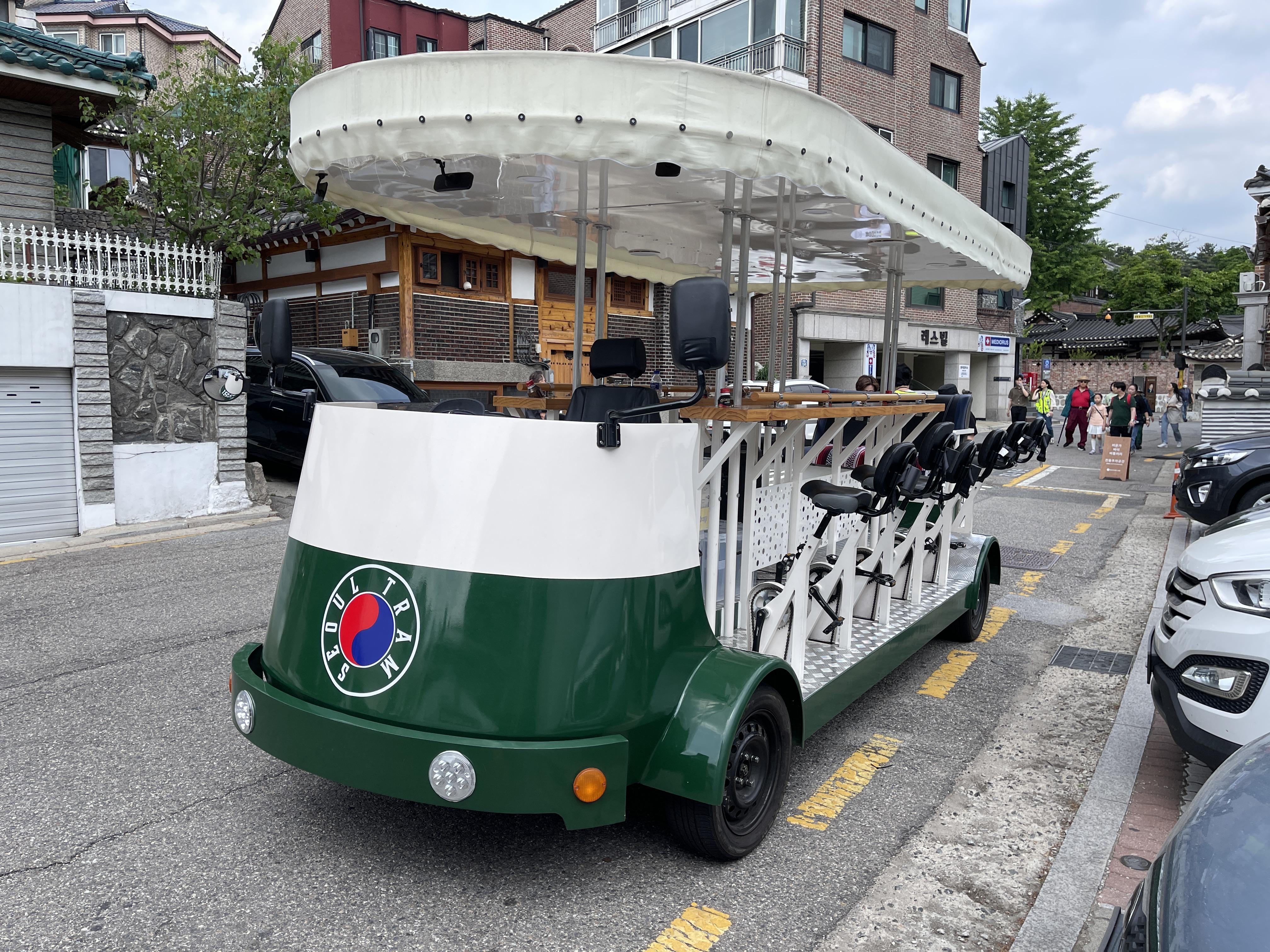 서울역사박물관에 놓인 옛 서울전차 381호의 모습을 본떠 만든 전기차를 타고