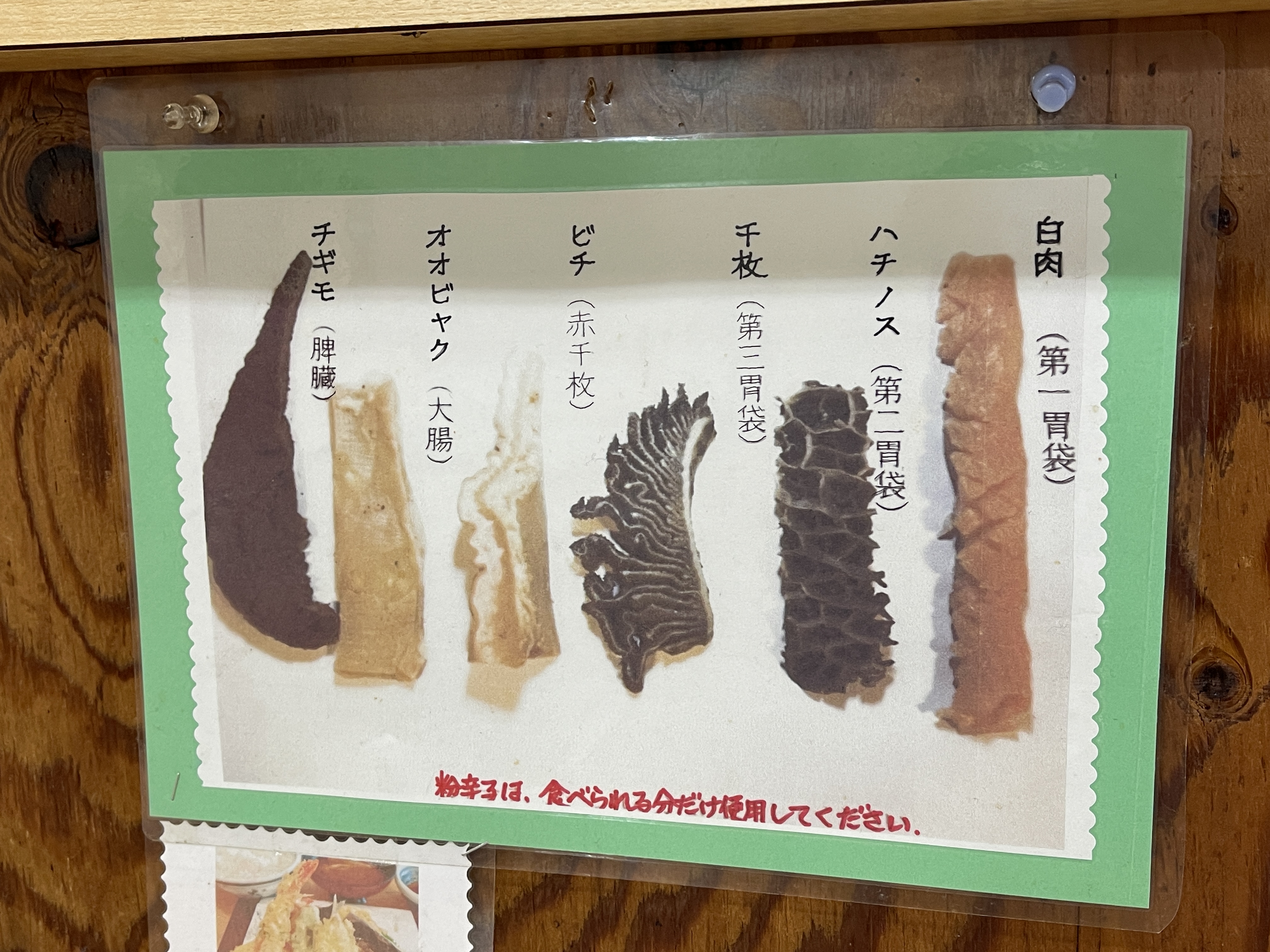 제공하는 부위는 사진 오른쪽부터 양, 벌집, 천엽, 막창, 대장, 비장입니다.