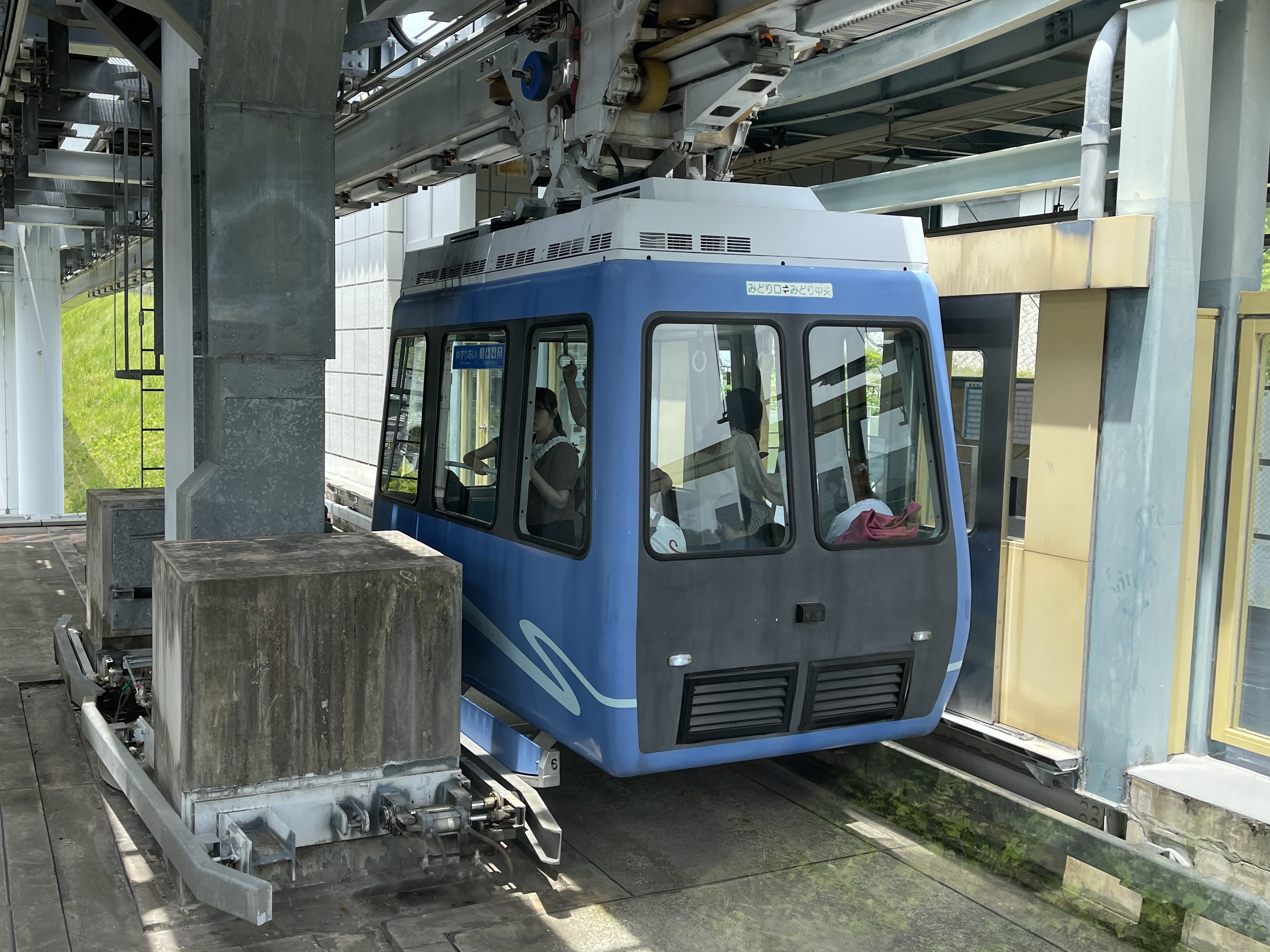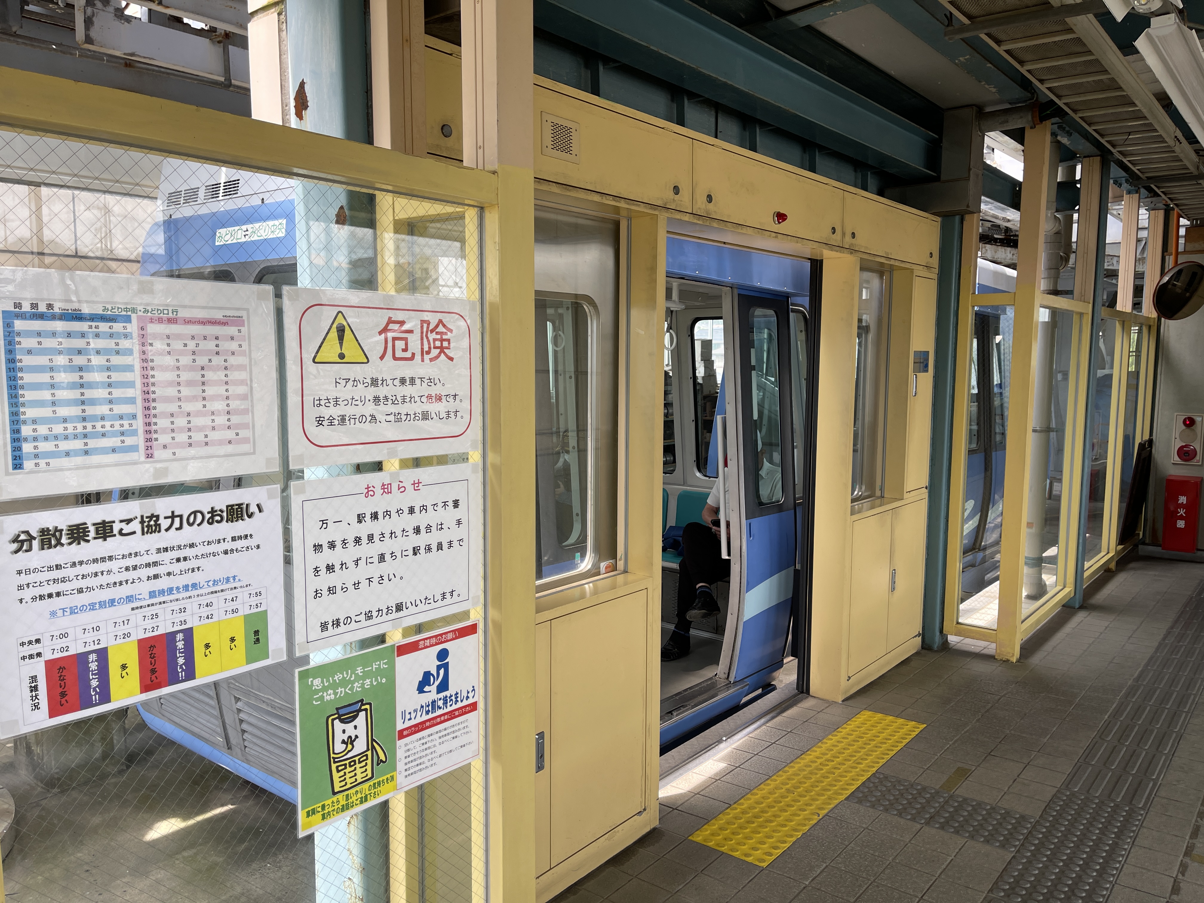 차량 위로 놓인 레일에 매달린 채로 미도리구치역을 출발하는데
