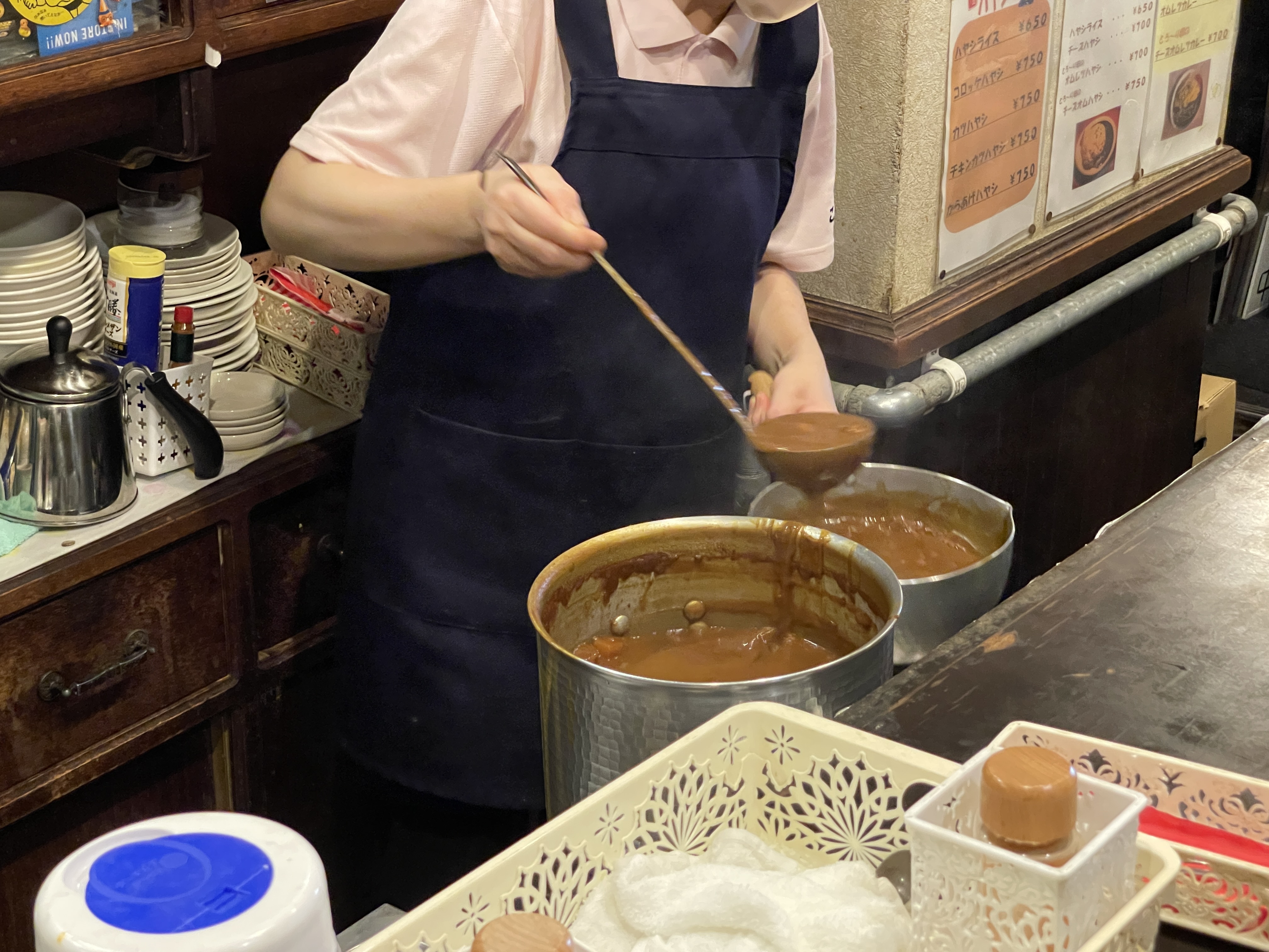 카레를 주문하면 커다란 냄비에 데운 카레를 조금 덜어 주방으로 가져가 야키카레로 만들어주는데