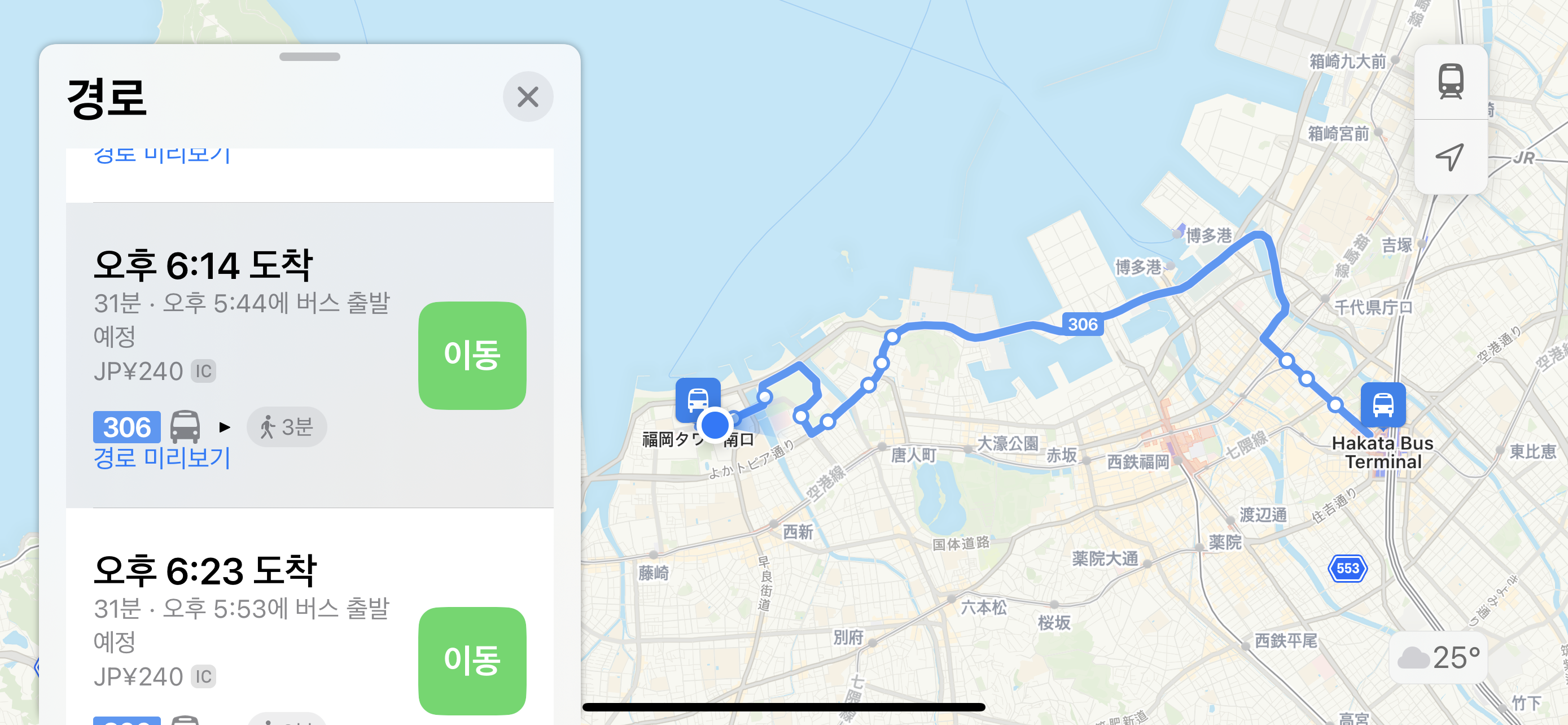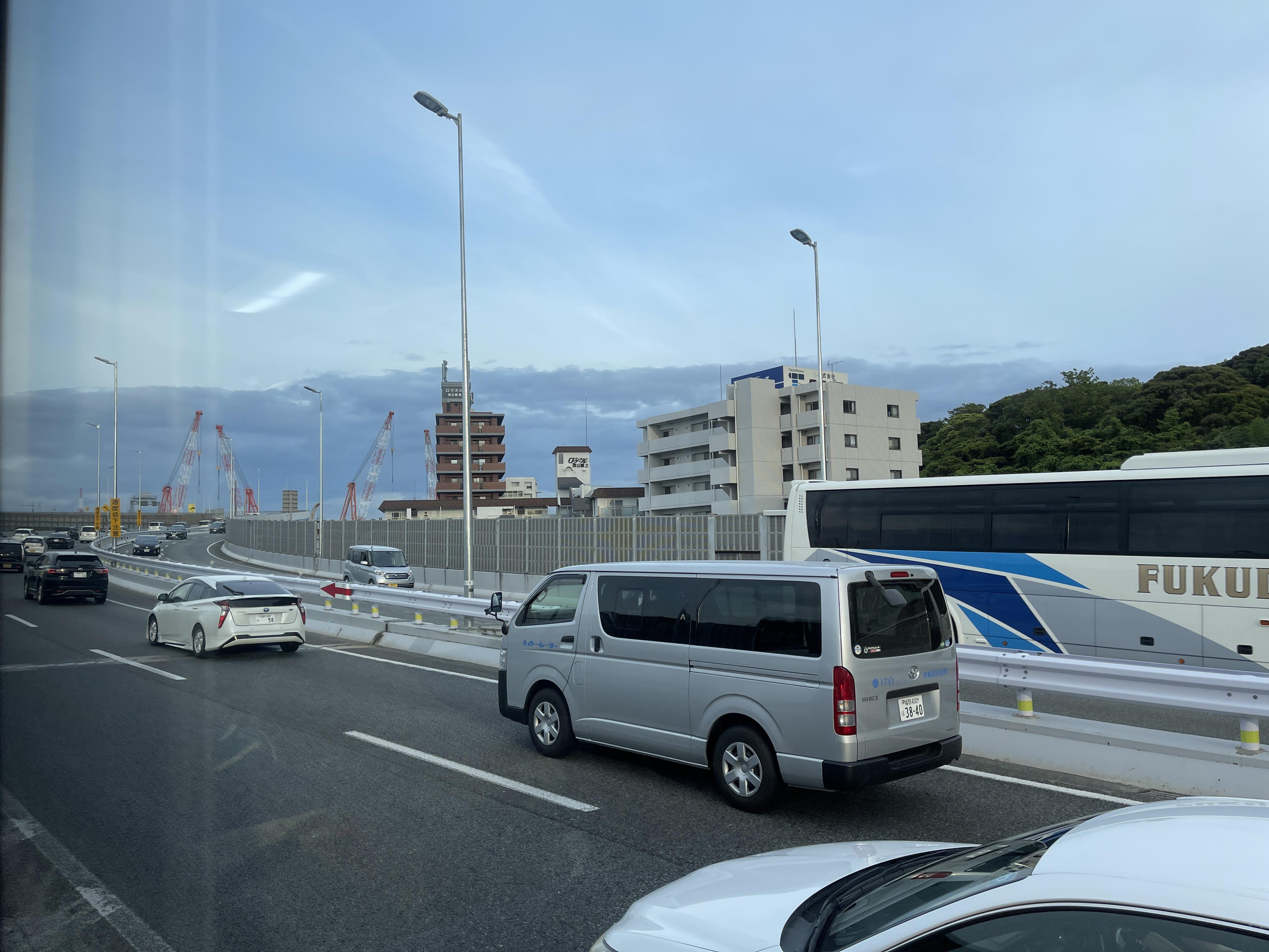 후쿠오카 타워에서 후쿠오카 도시 고속도로를 달려 하카타역까지 가는 306번 버스를 타고 이동합니다.