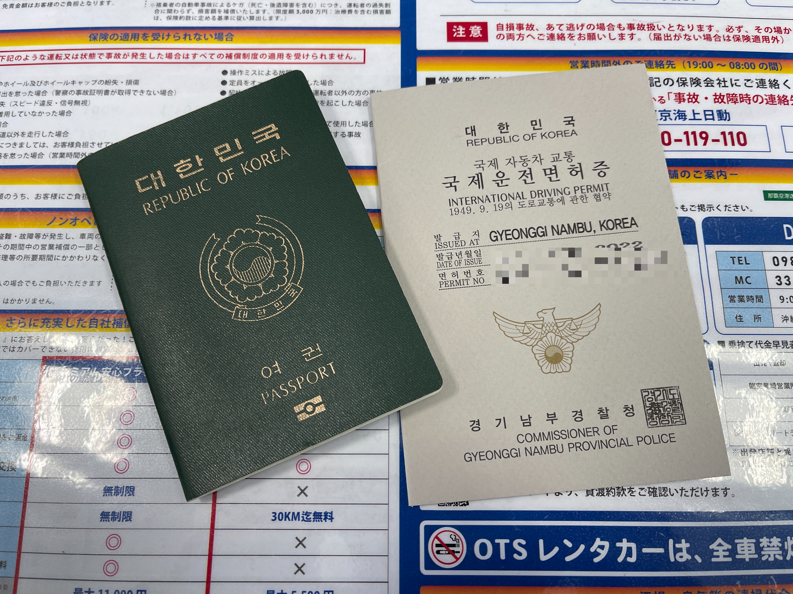여권과 운전면허증, 국제운전면허증을 꺼내 카운터에 보여줍니다.
