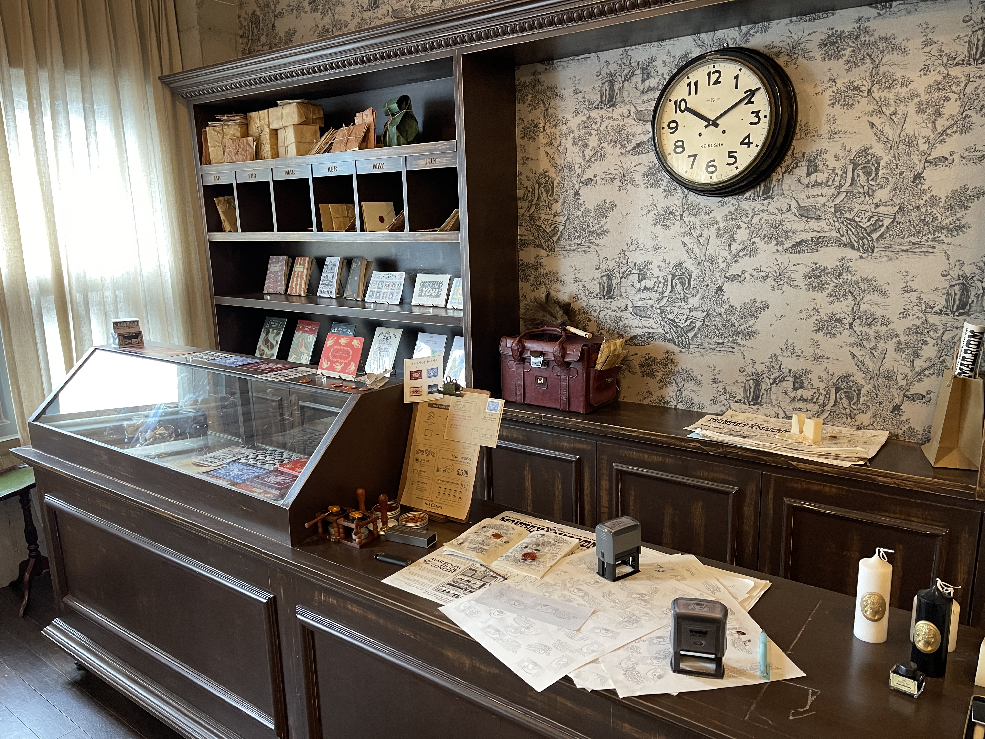 오래전 유럽의 우체국 카운터 분위기로 꾸민 공간이 나오네요.