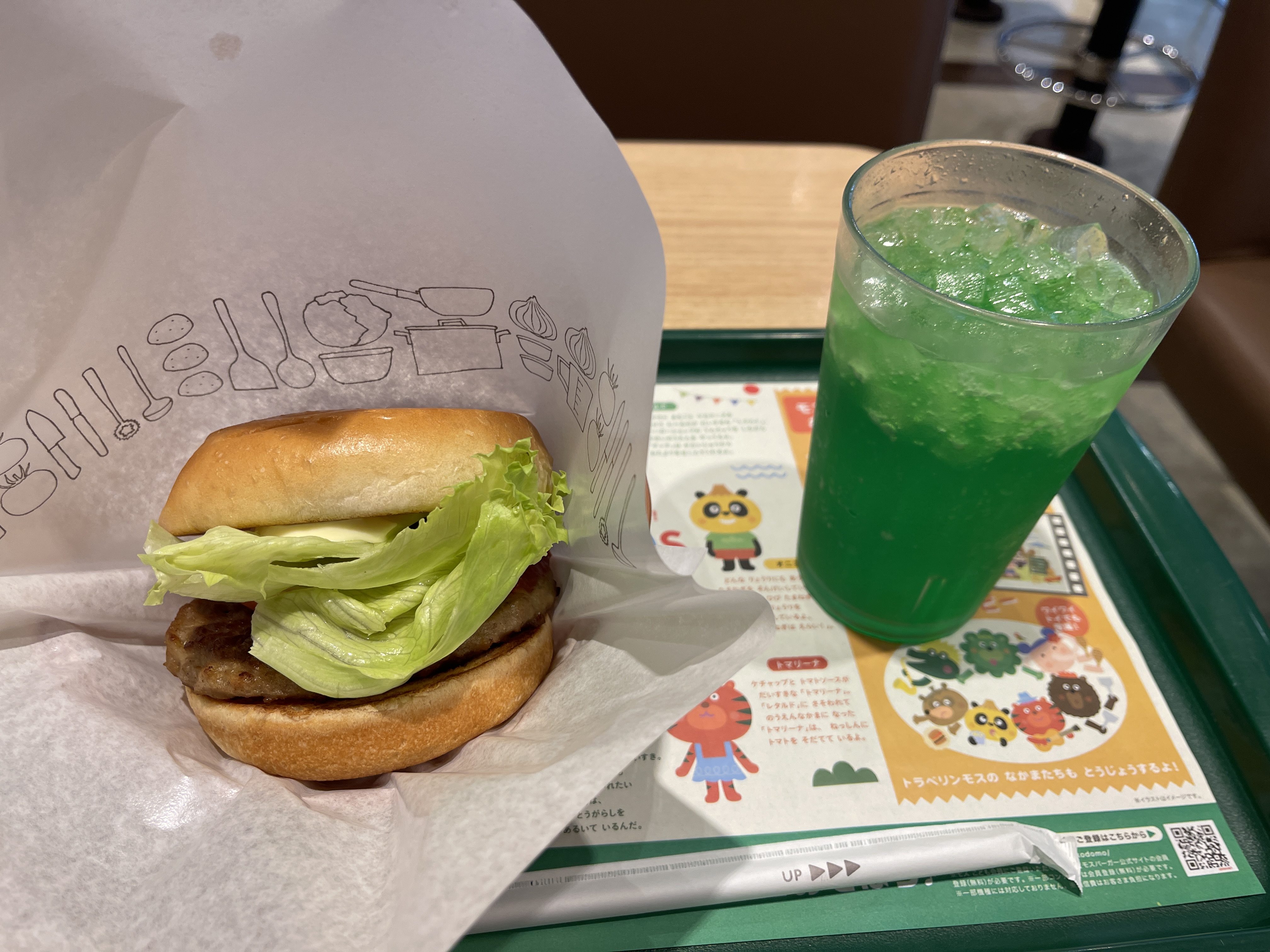 아침 한정 메뉴인 모닝 야채버거와 멜론소다 세트로 배를 채우고