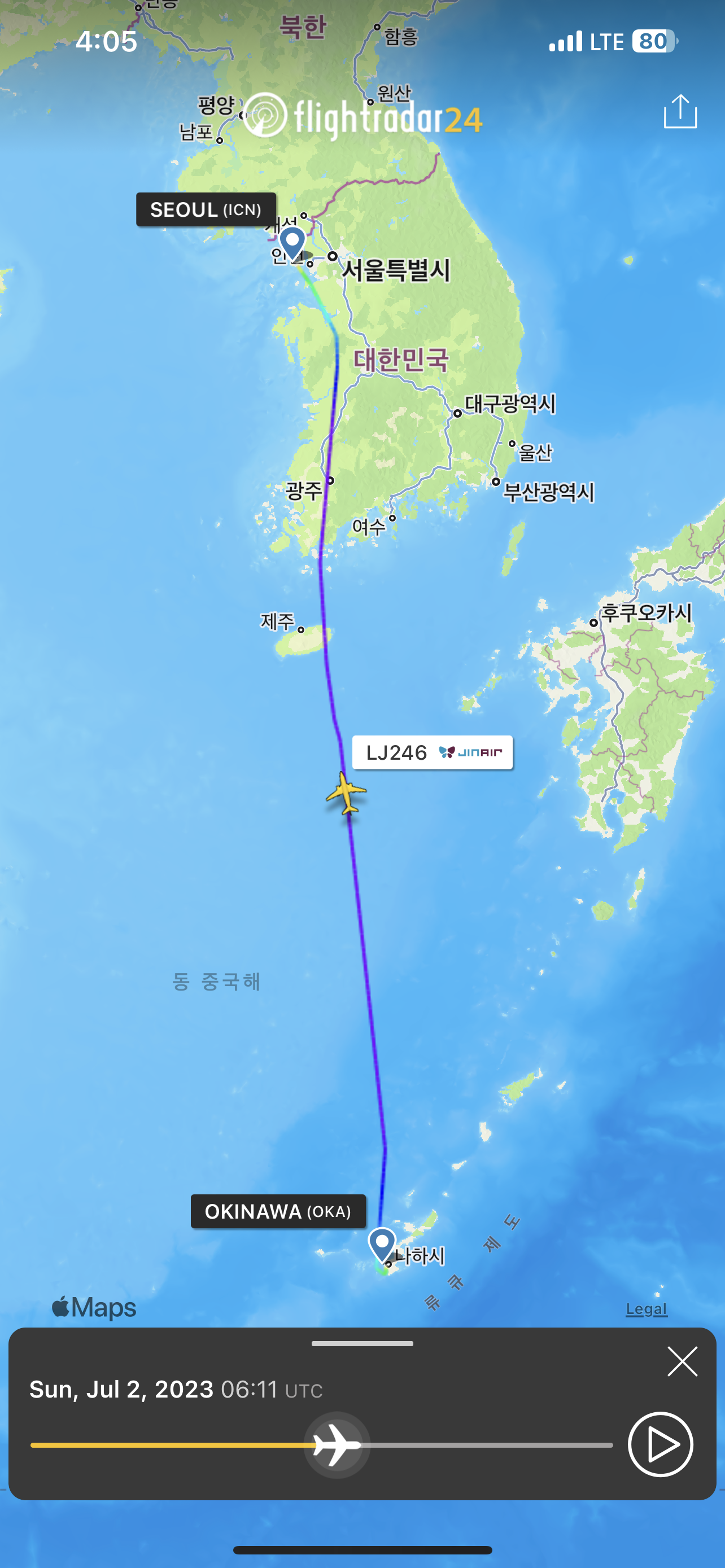 오키나와를 출발해 인천으로 날아가는 비행기는