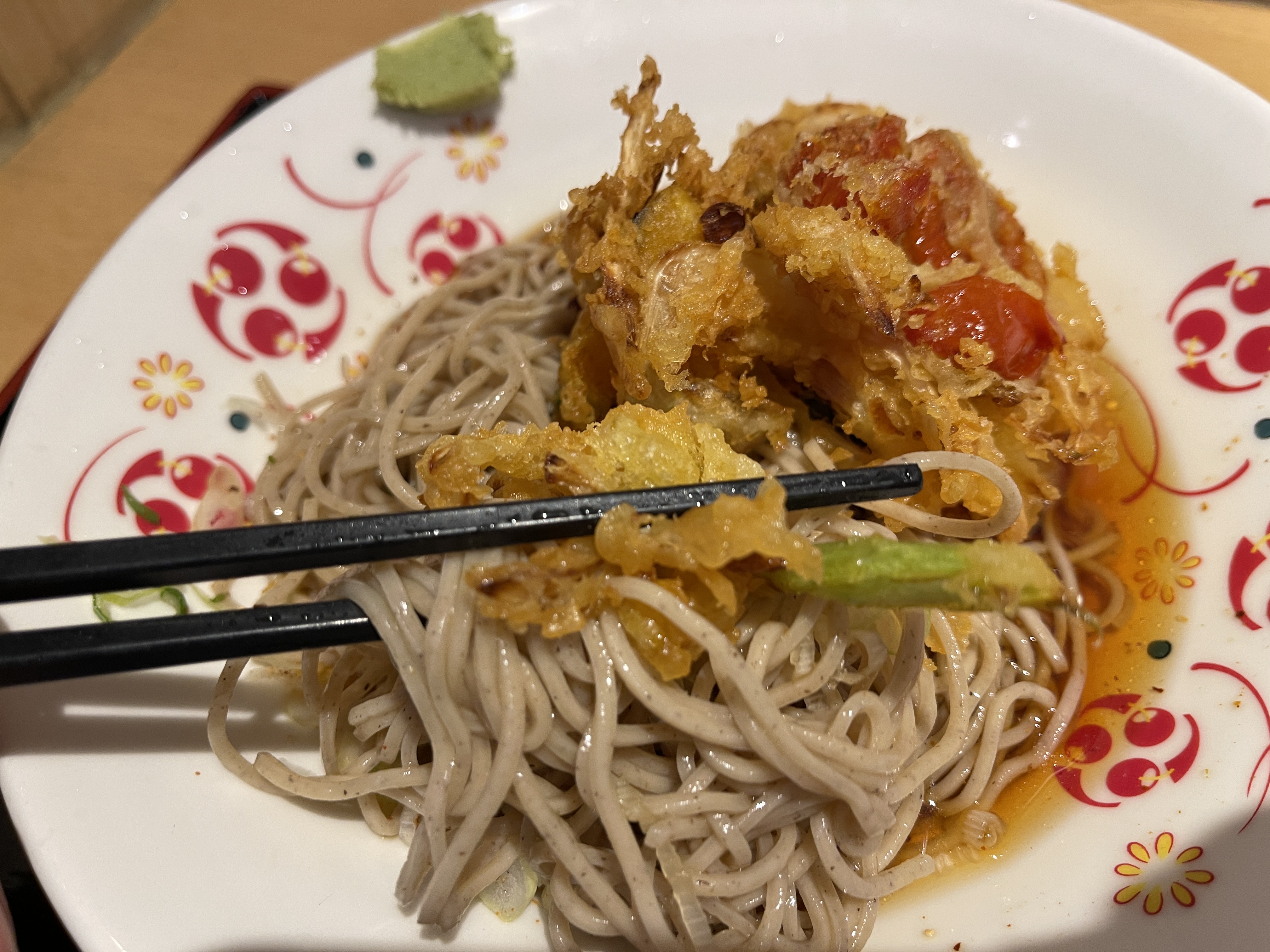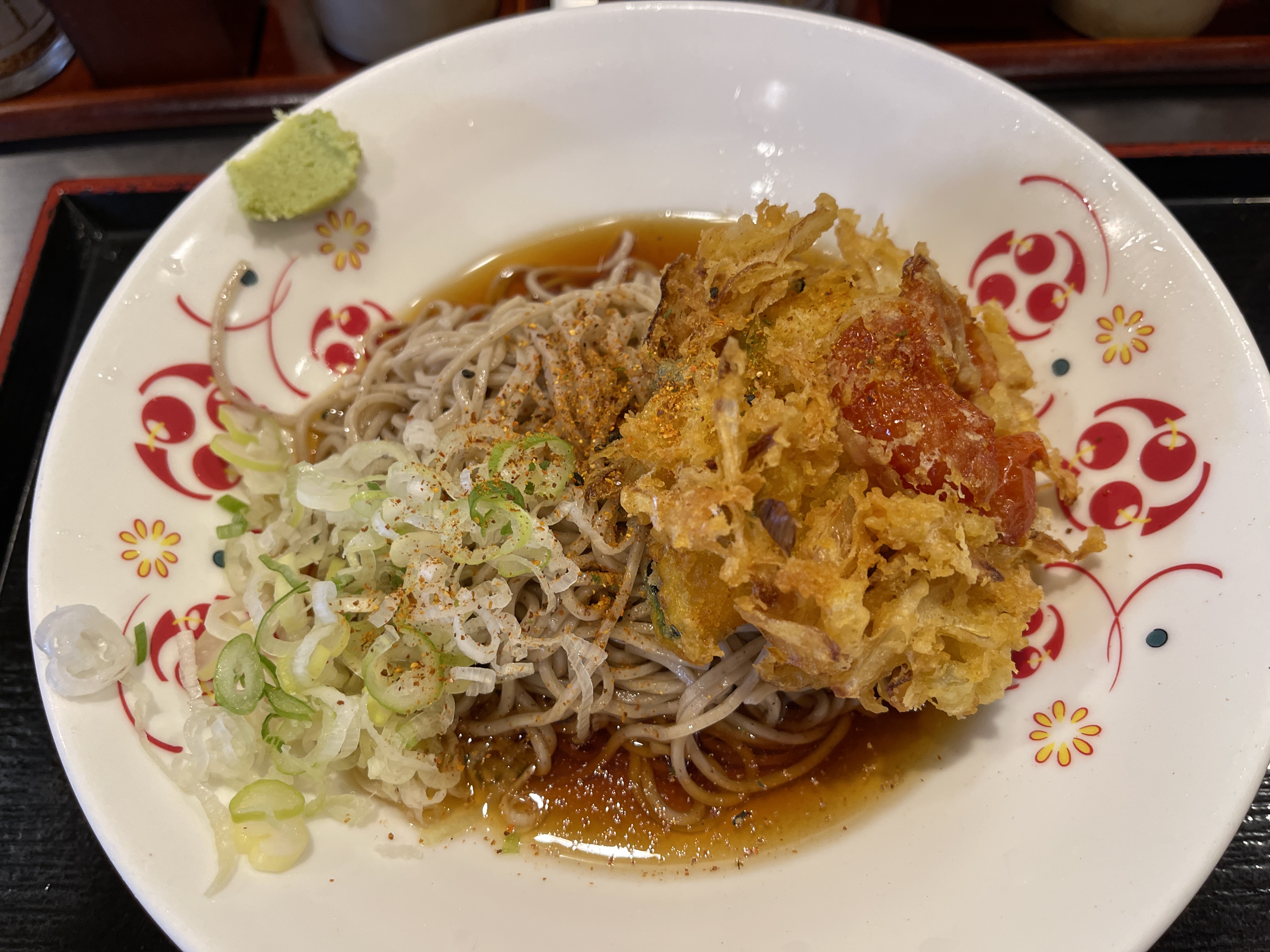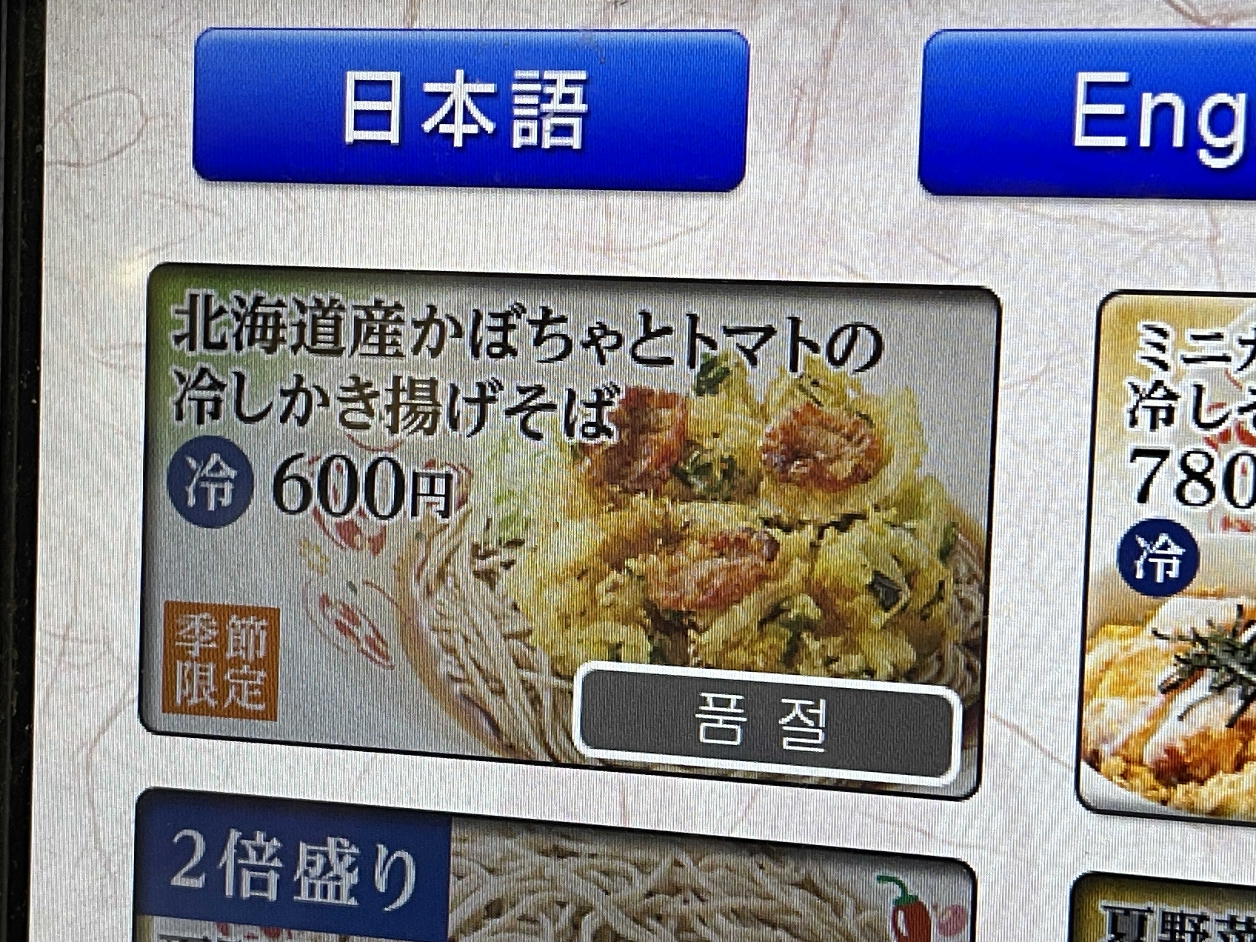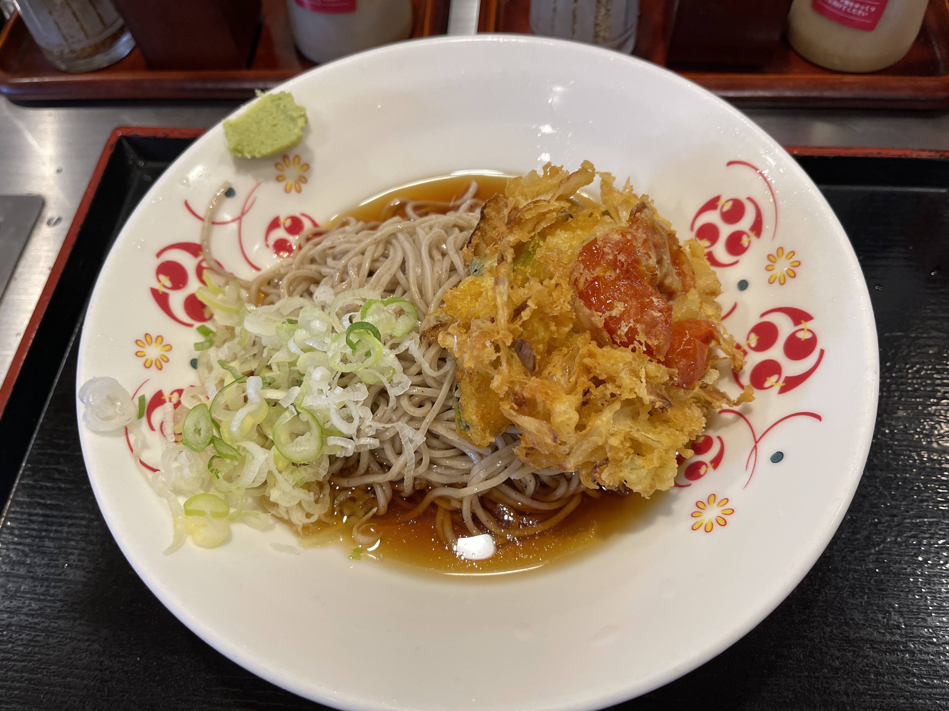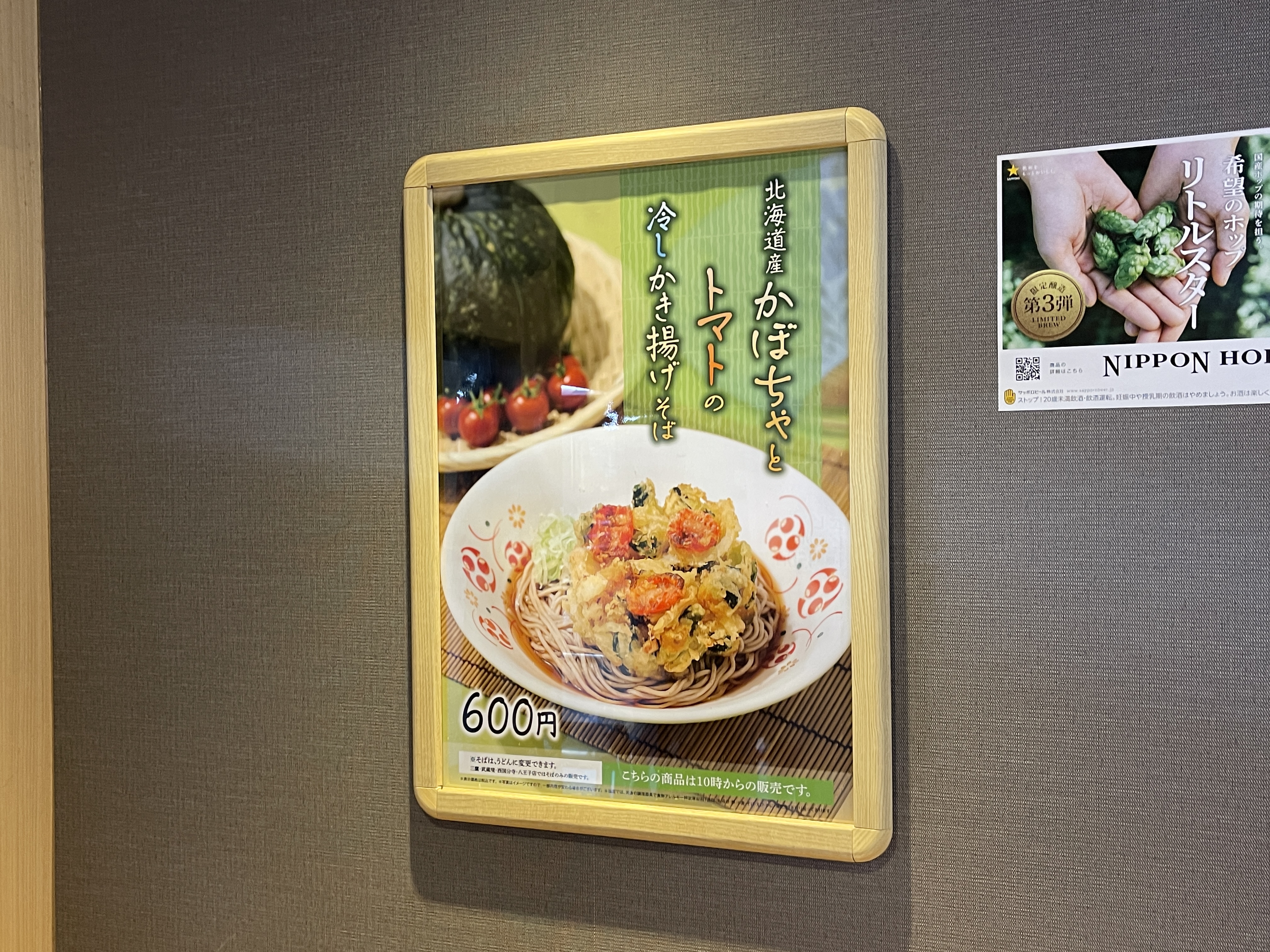 홋카이도산 호박과 토마토로 만든 차가운 튀김 소바(北海道産かぼちゃとトマトの冷しかき揚げそば)라는