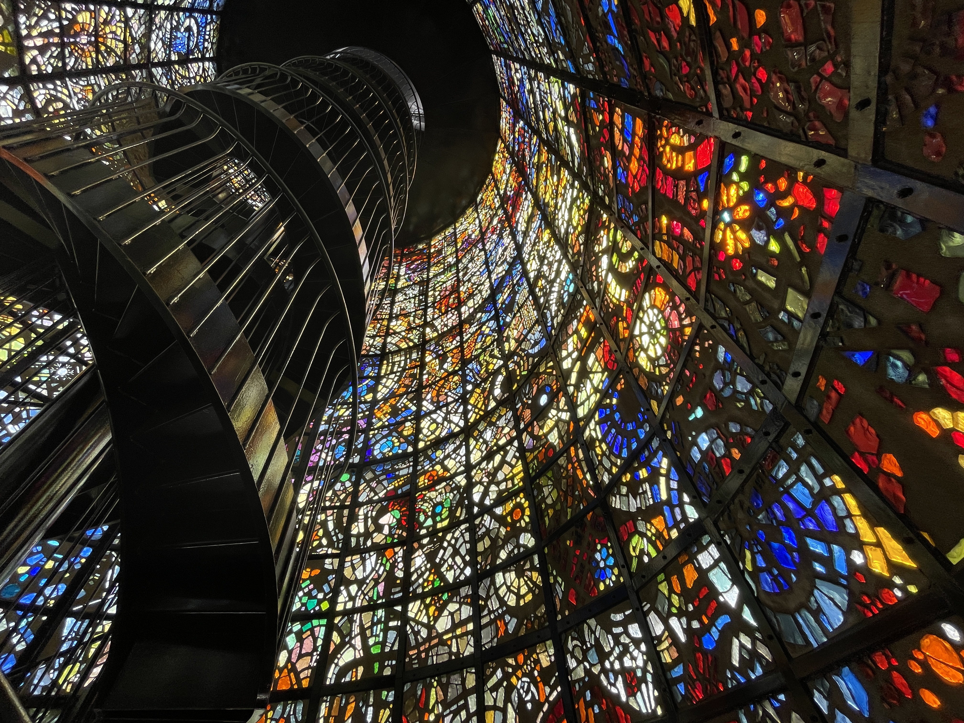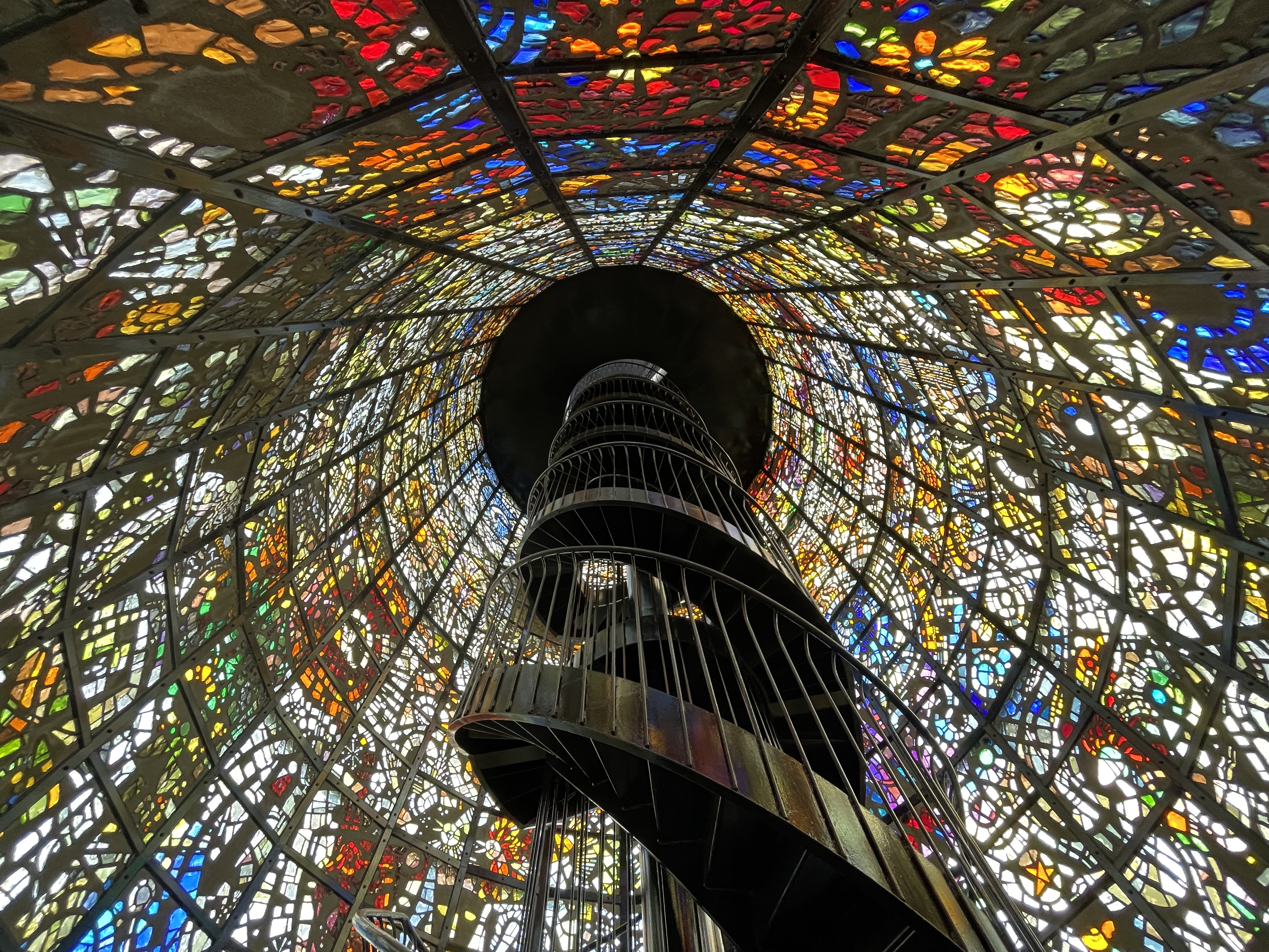 나선형 계단을 중심으로 사방을 감싸는 스테인드 글라스를 보면