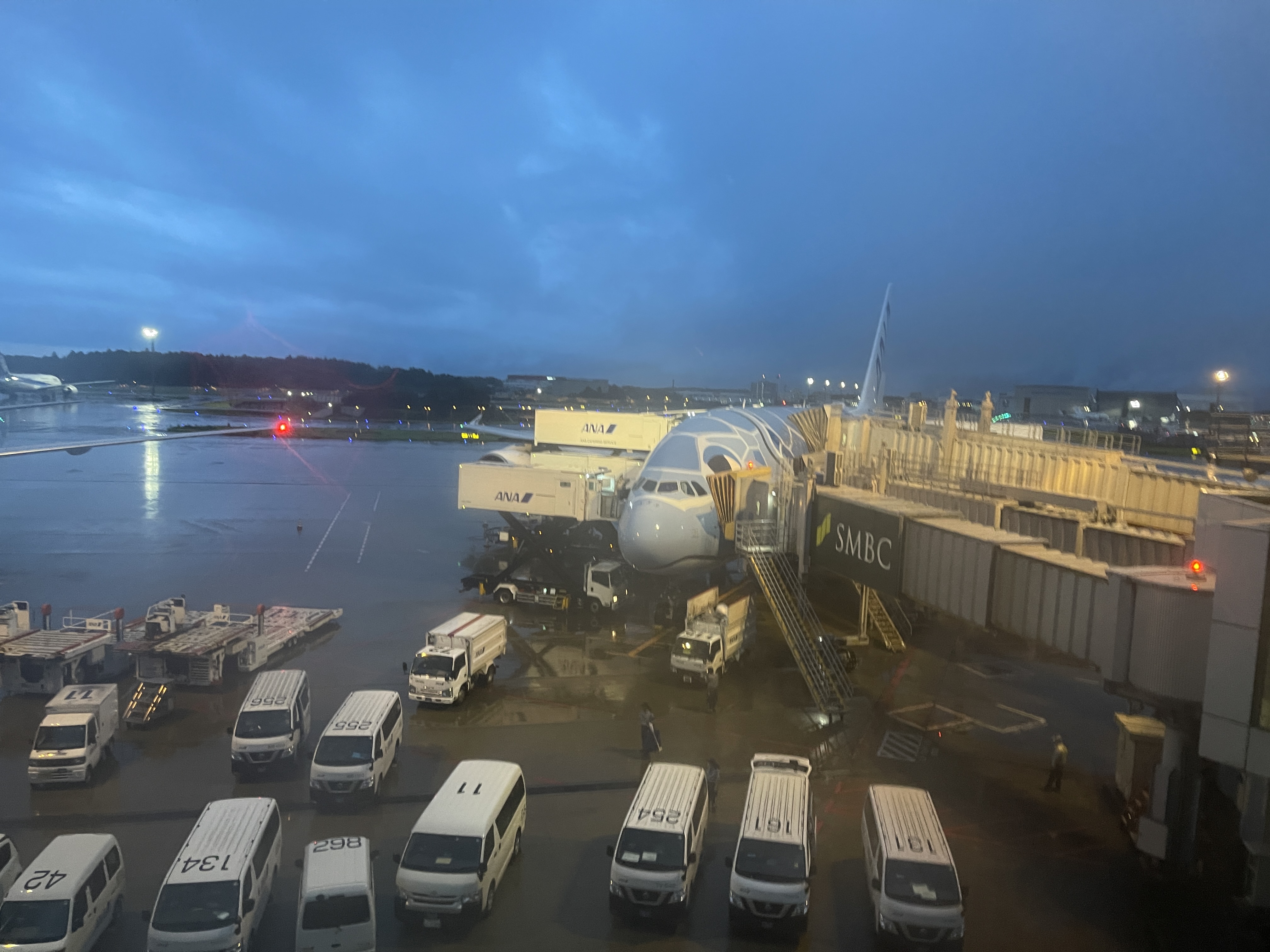 이미 나리타에 도착했어야 할 비행기가 이제 막 보딩 브리지를 연결하고 있는데