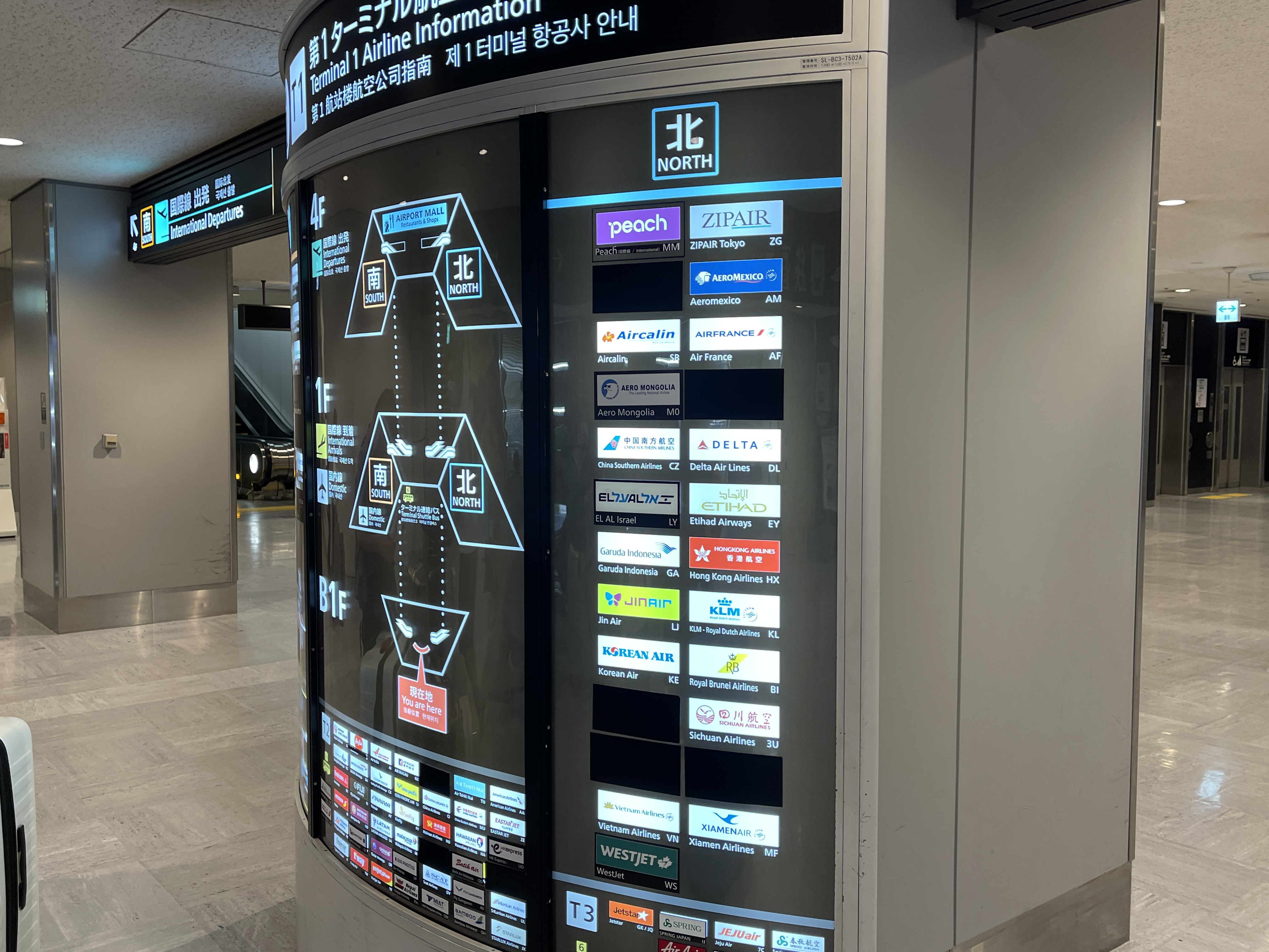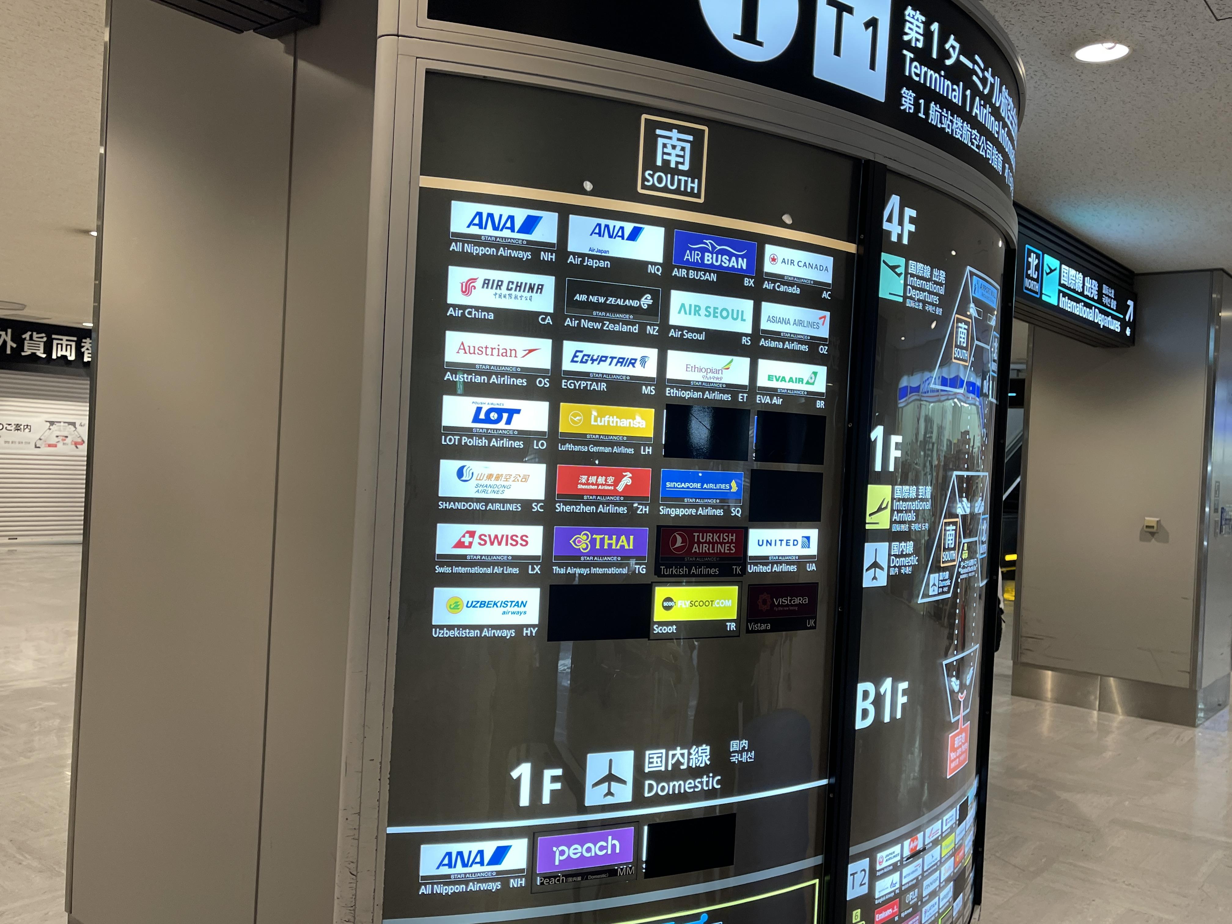북쪽 윙과 남쪽 윙으로 가는 길이 갈라지는 곳에 항공사 안내도가 붙어있지만