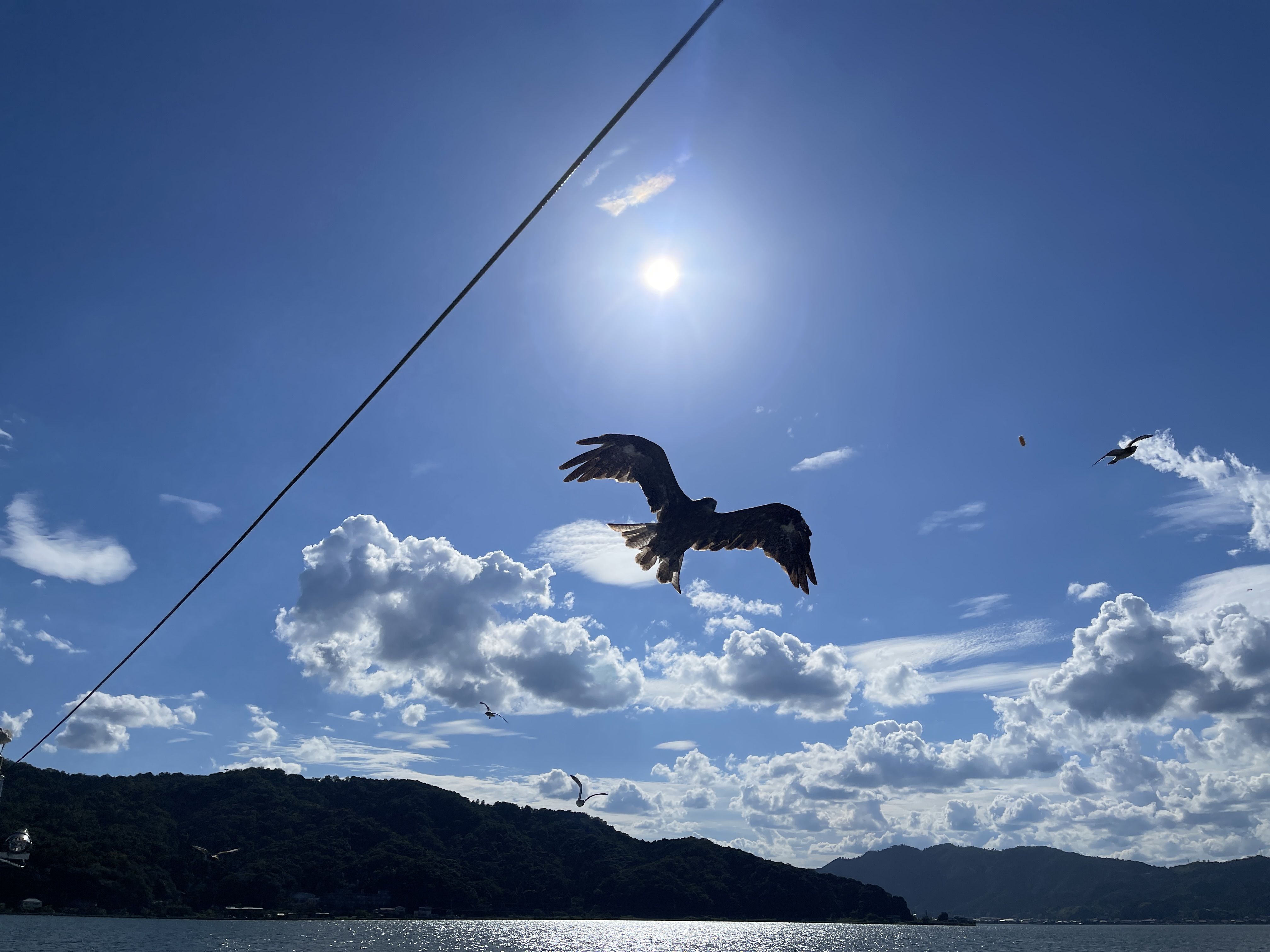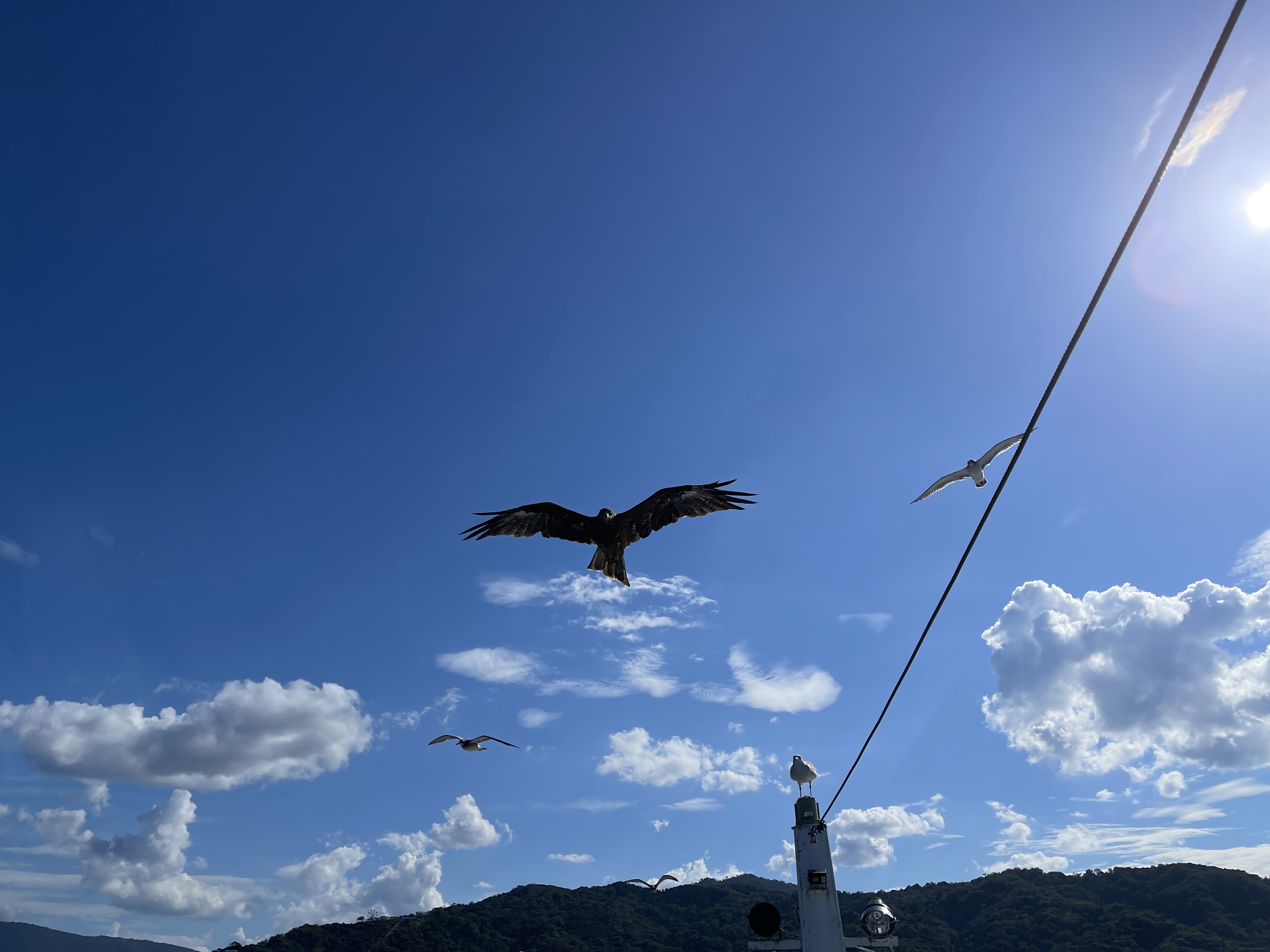 배에 같이 탄 승객이 새우깡의 원조격 과자 에비센을 들고 타서 갈매기에게 던지고 있네요.