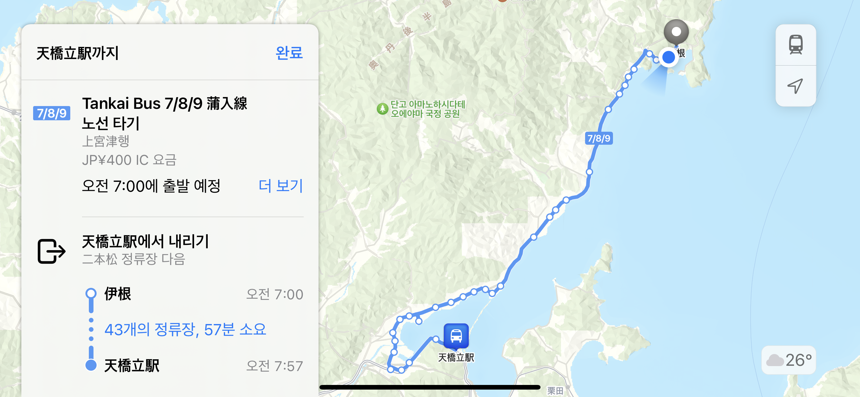 7시에 아마노하시다테 방향으로 가는 5번 버스에 탑니다.
