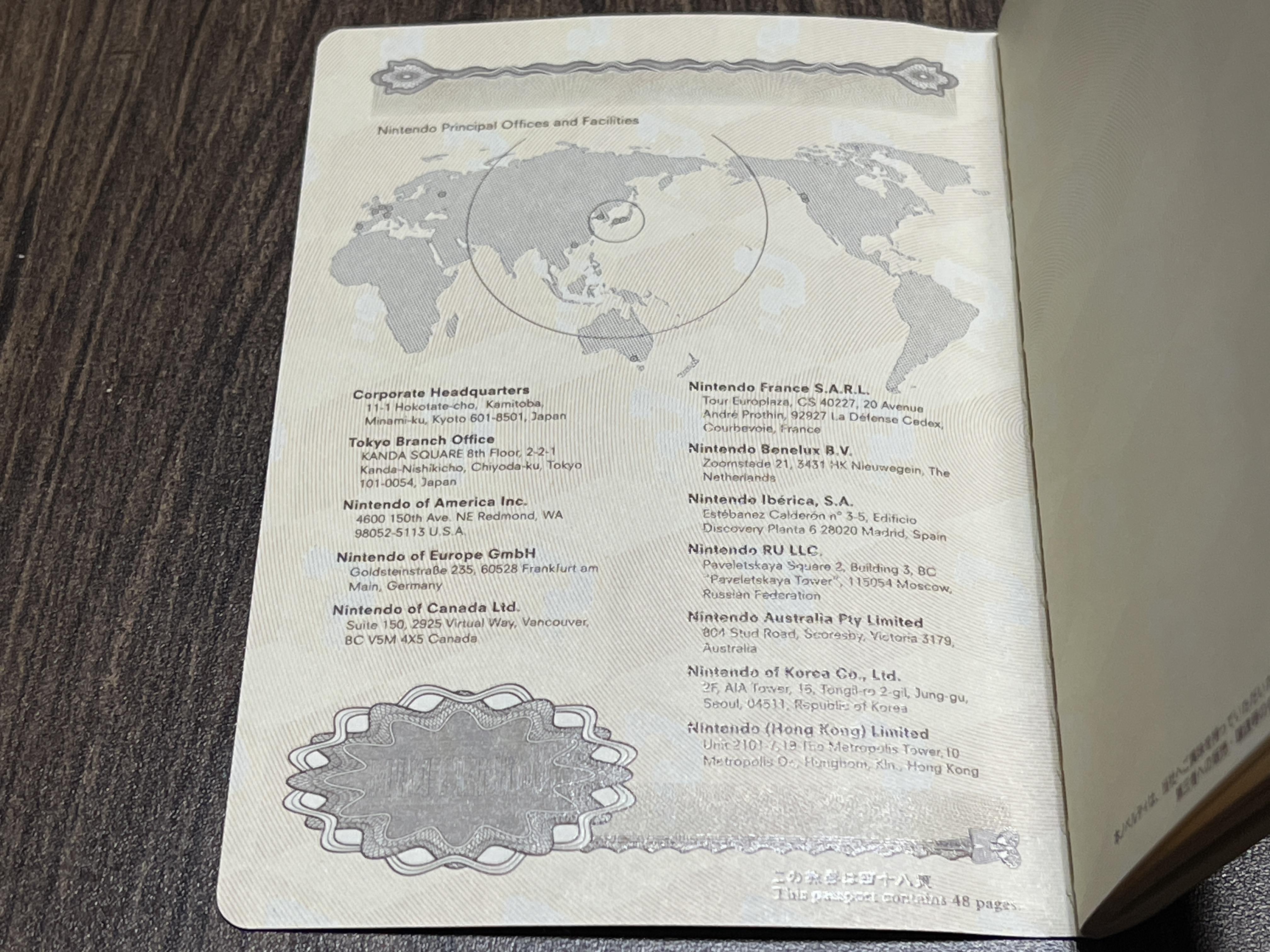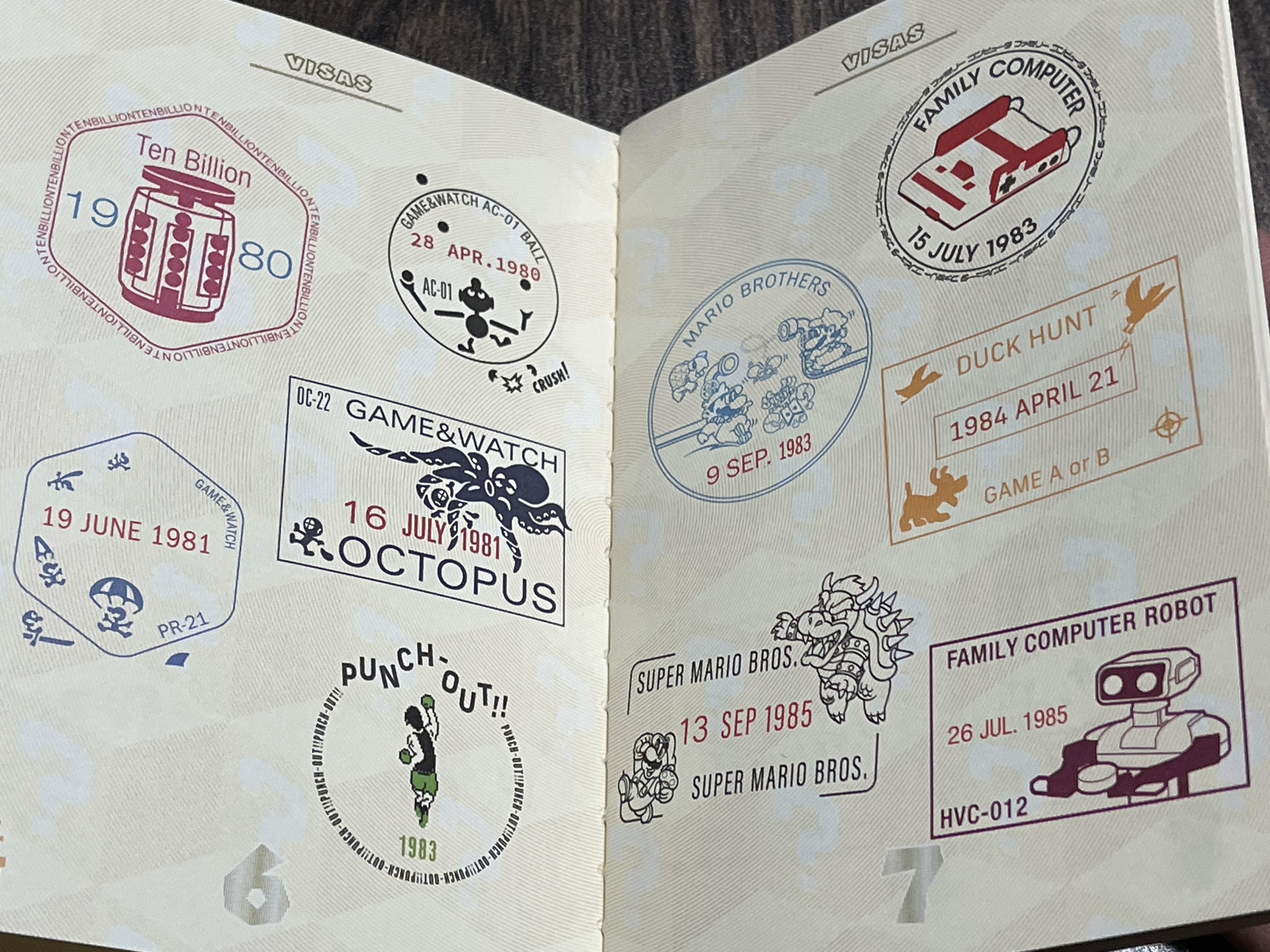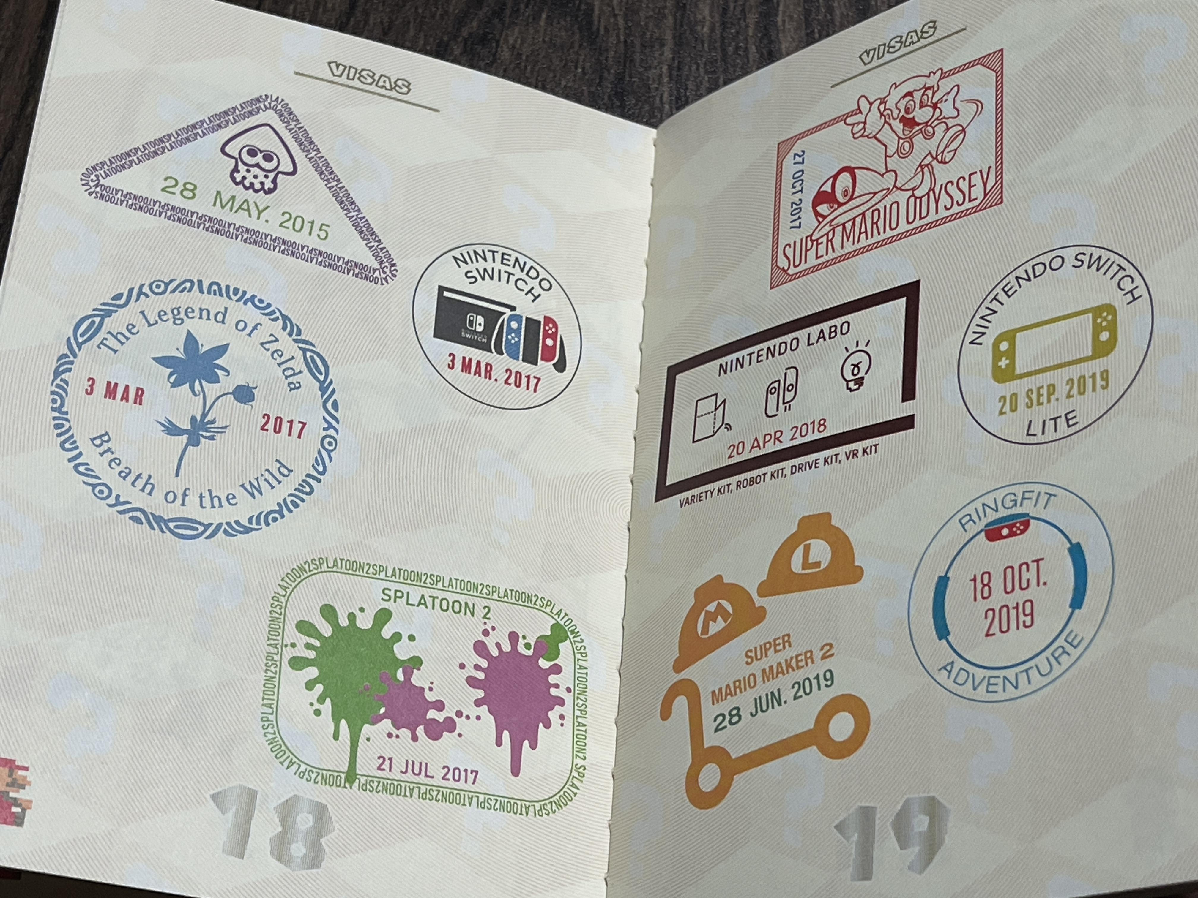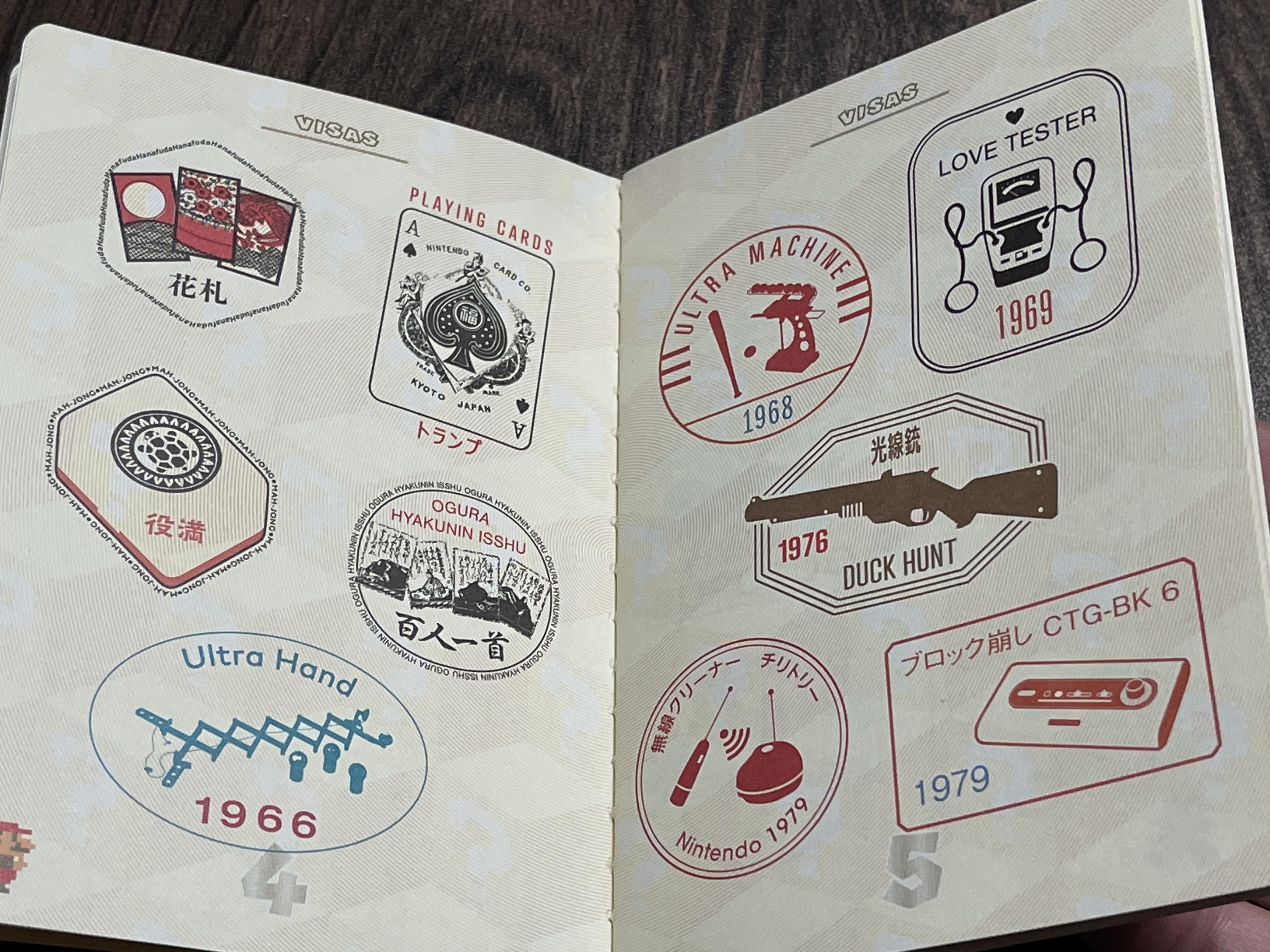 사증란에는 화투 제작부터 시작된 닌텐도의 역사를 스탬프 형태로 보여주는데