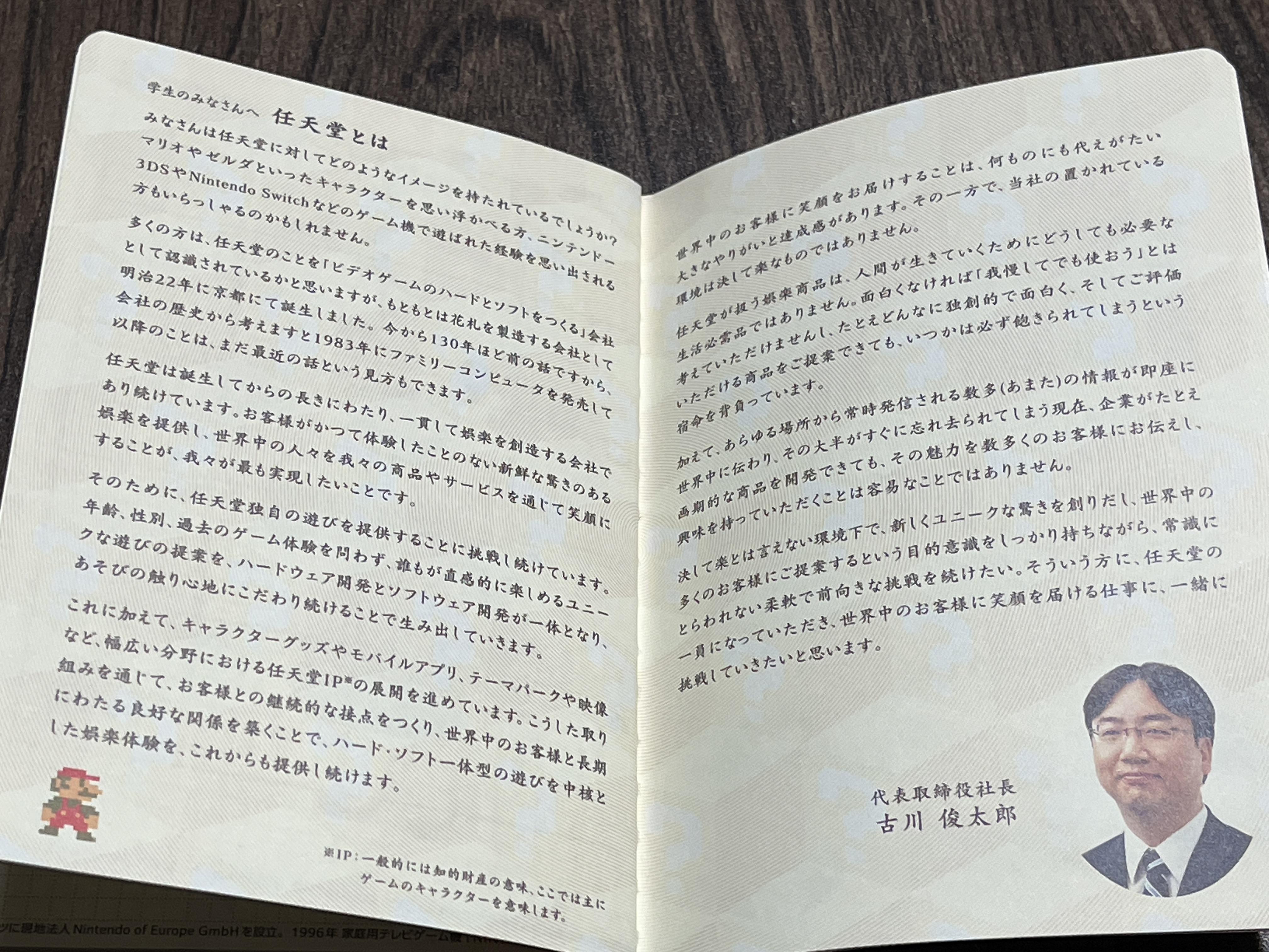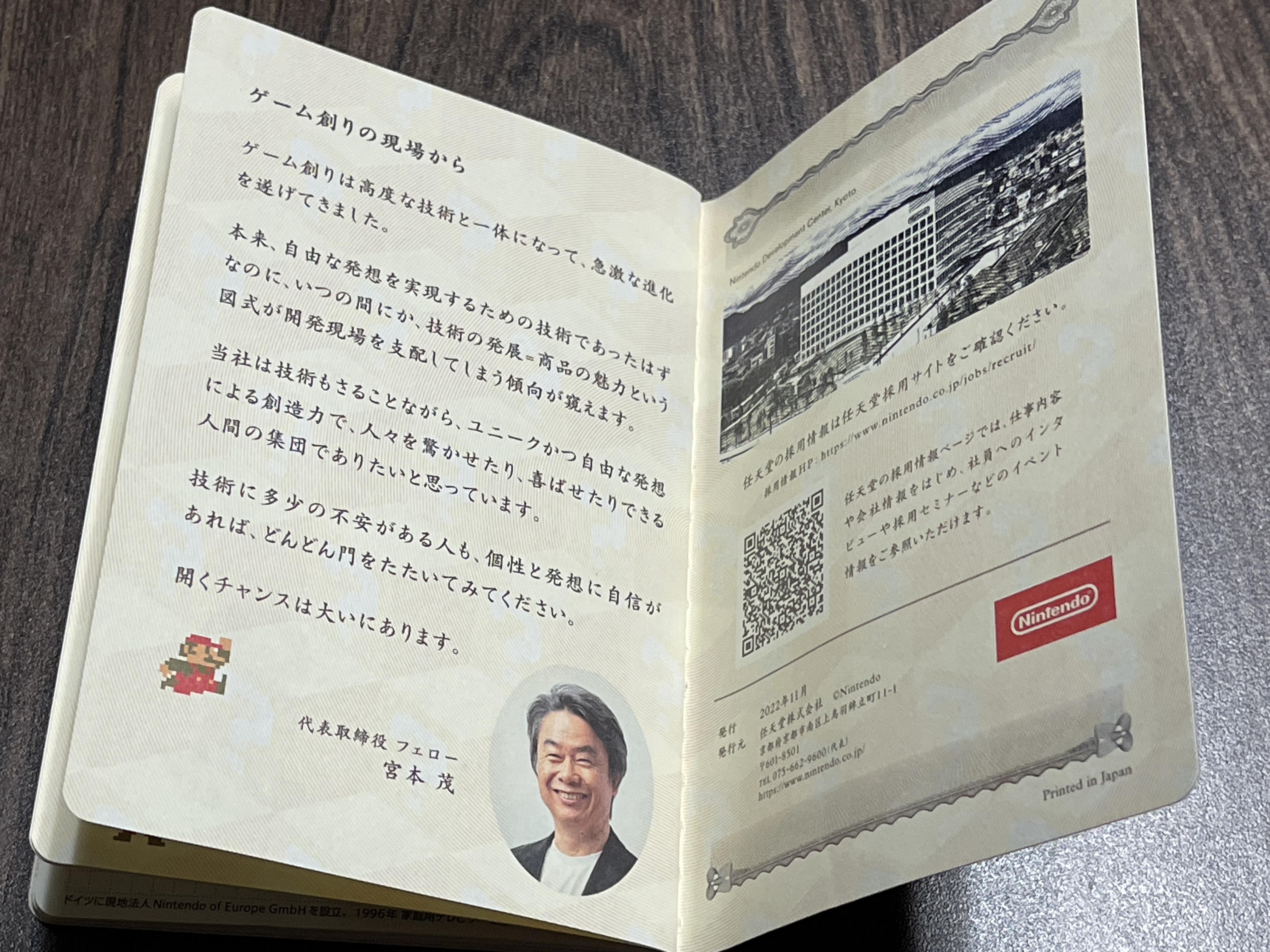 닌텐도의 대표이사 펠로우, 게임의 신 미야모토 시게루의 인사말이 담겨 있네요.