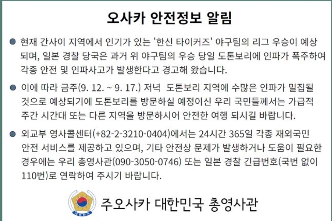 주 오사카 총영사관에서 한신 타이'커'즈라는 오타까지 내며 주의사항을 올릴 정도로