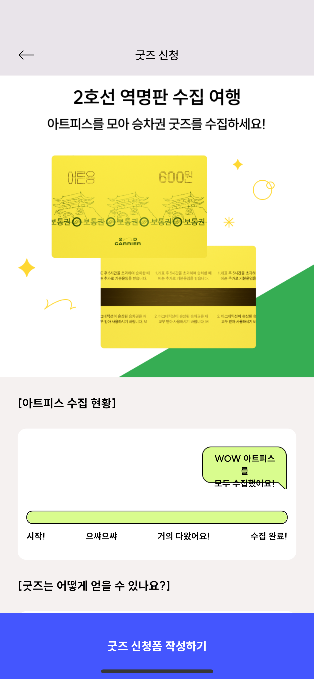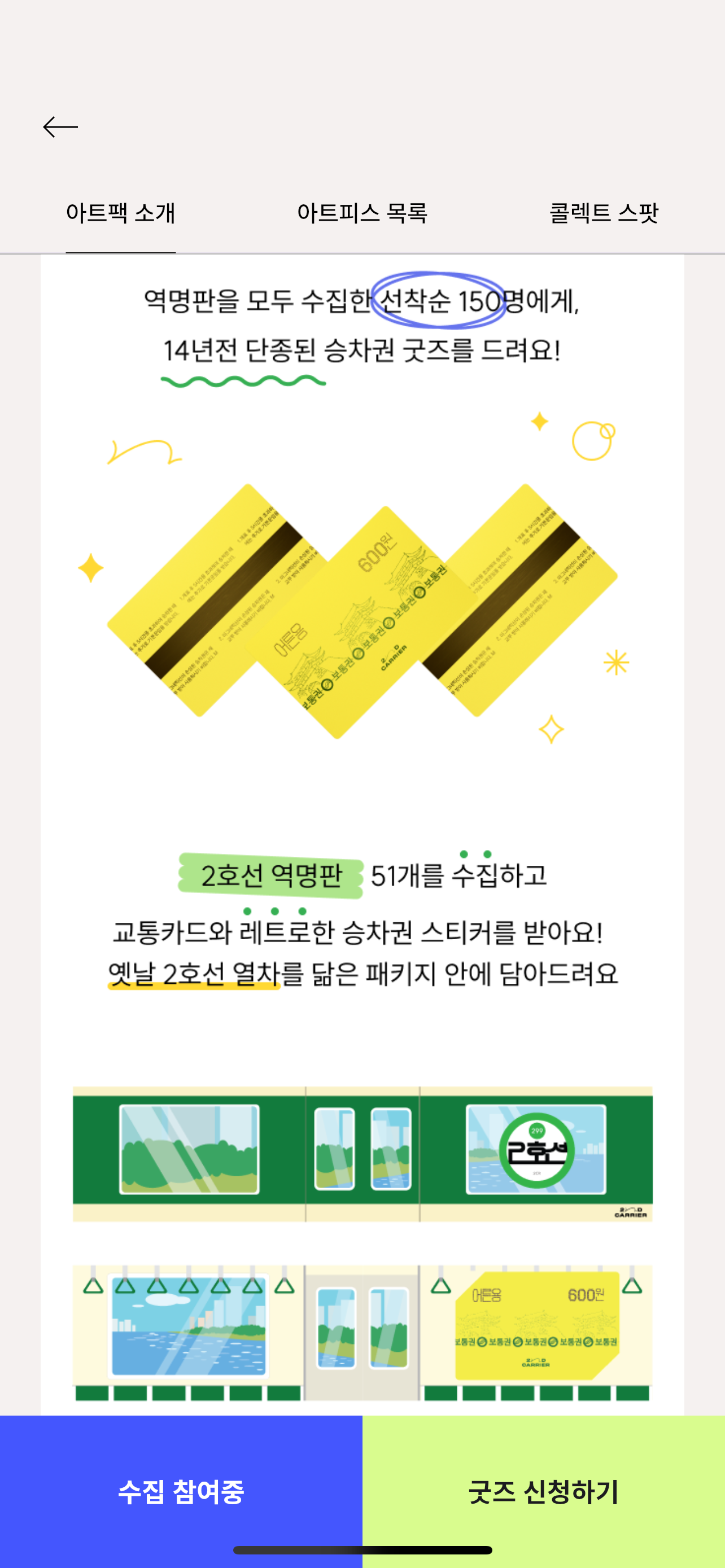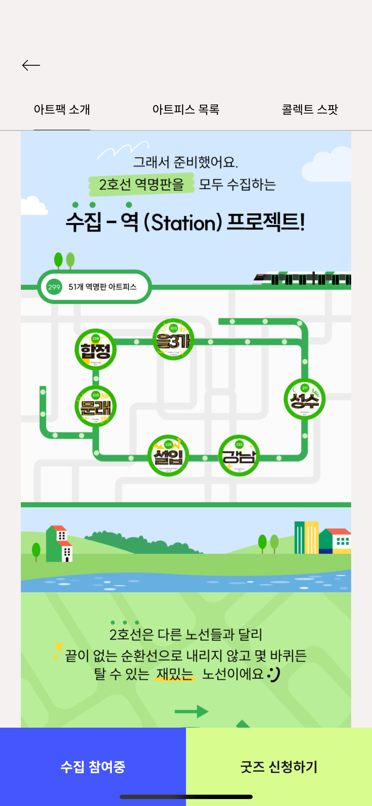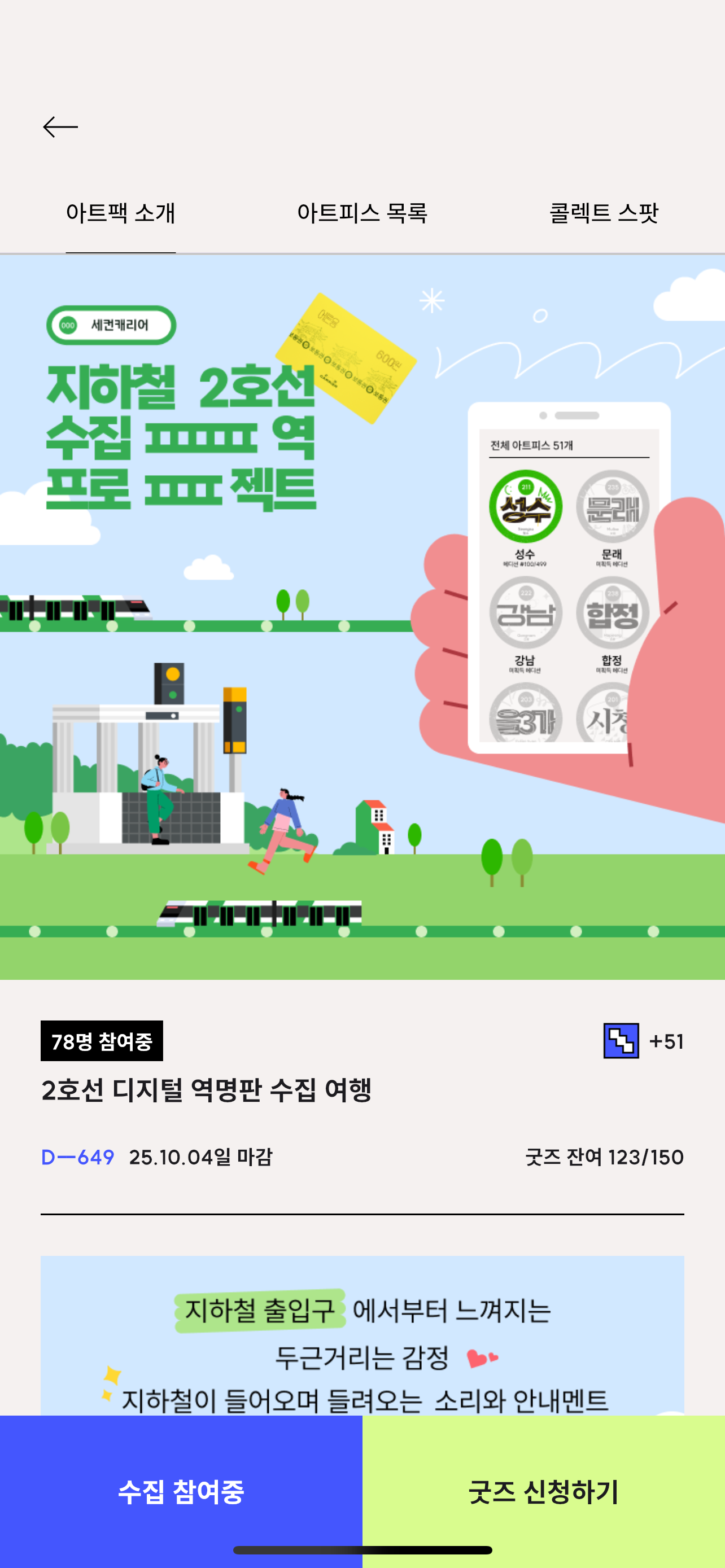 서울 2호선에 있는 51개 역을 모두 방문해 역명판 모양의 아트피스를 모은 뒤 굿즈를 신청하면