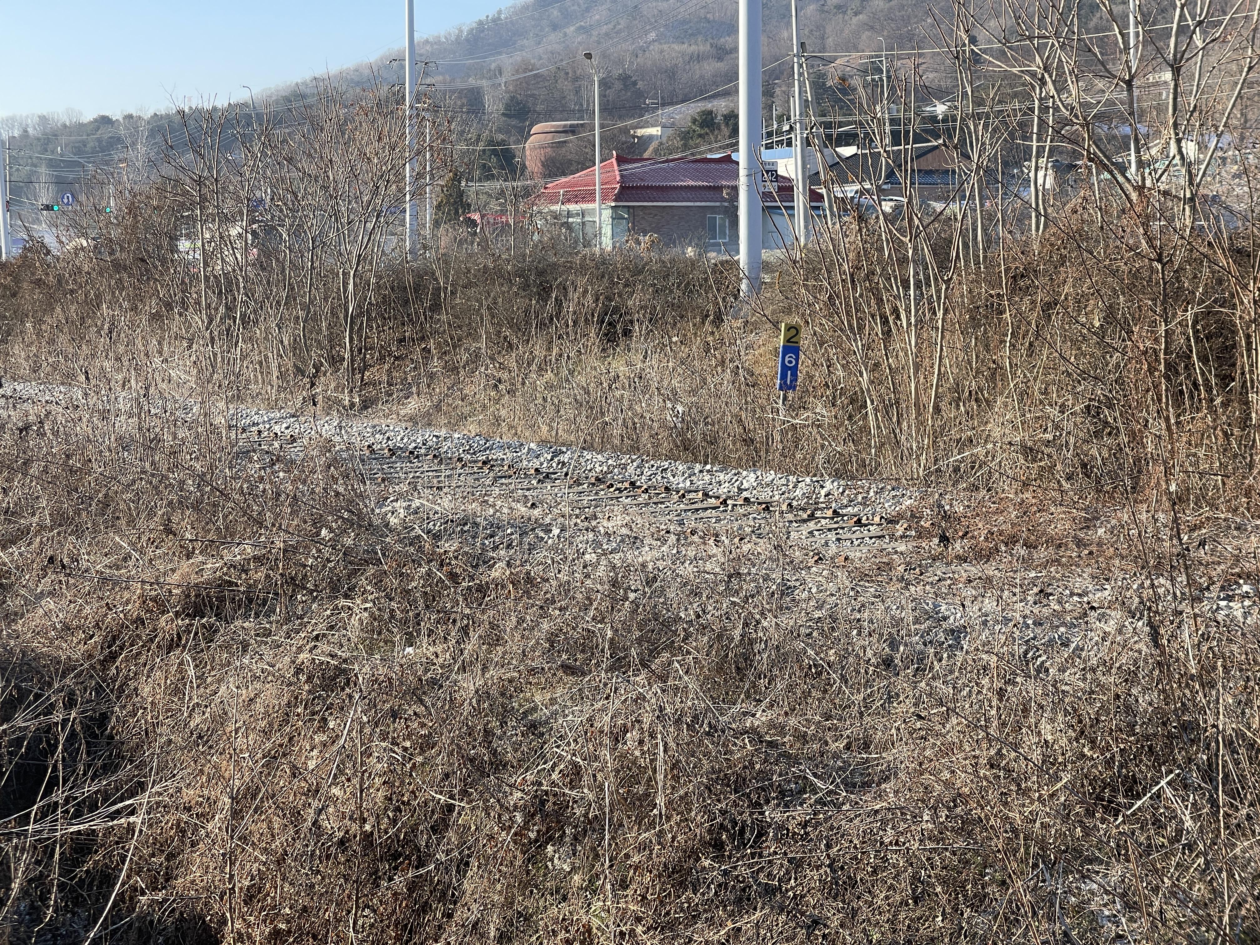 여기가 철길이라는 것을 보여주는 표시라곤 바닥에 깔린 침목과 거리표(선로제표)뿐인데