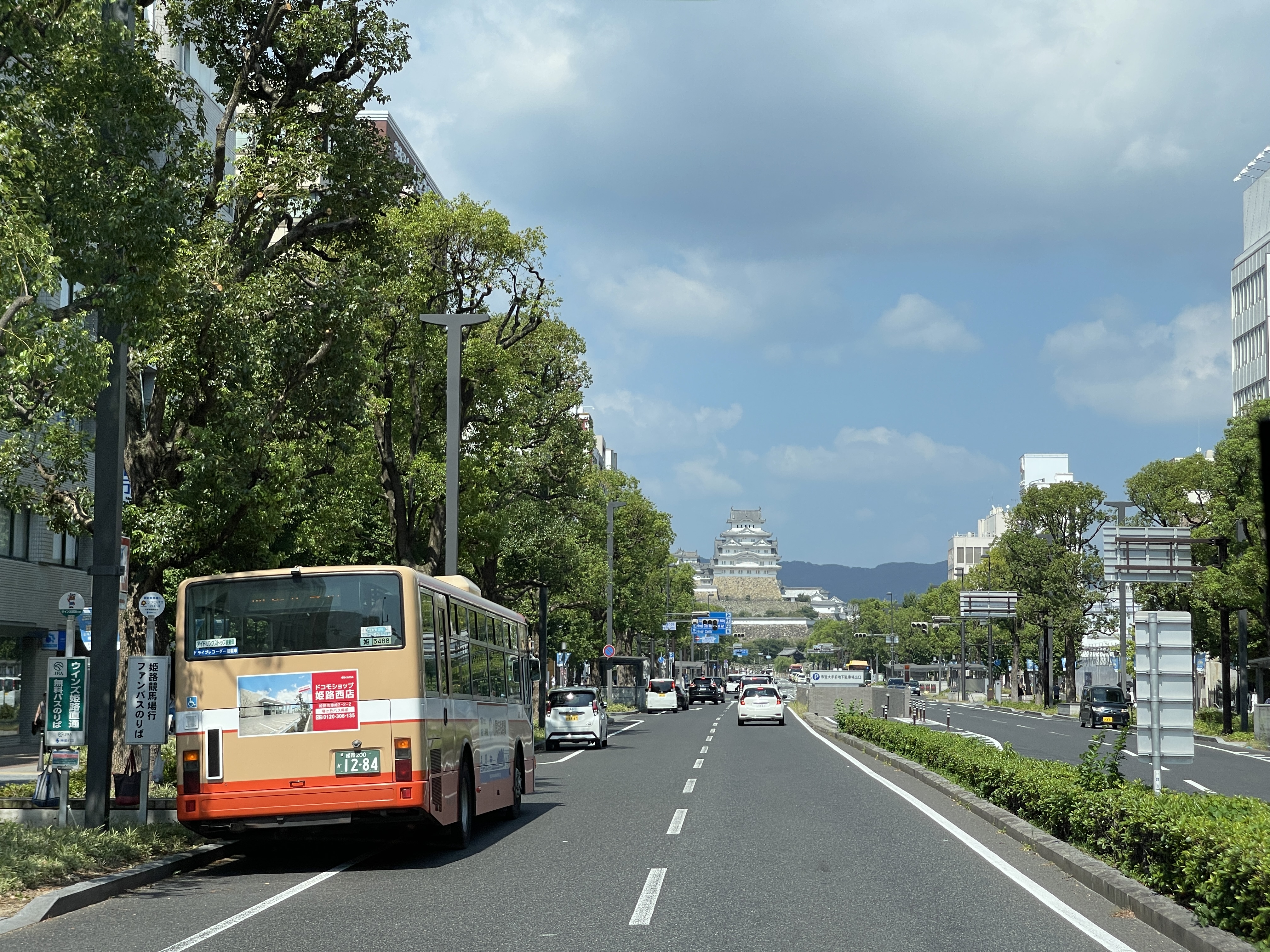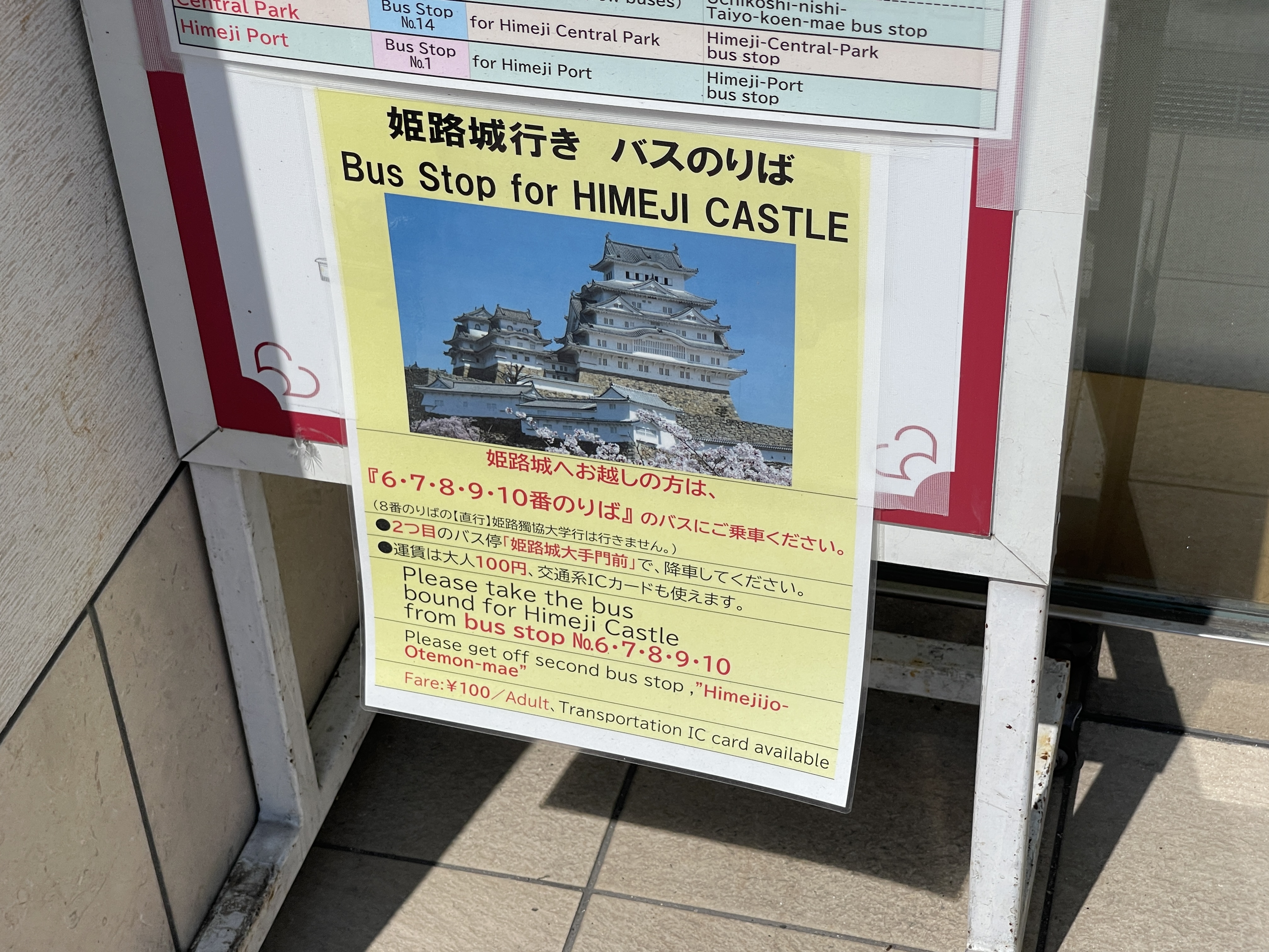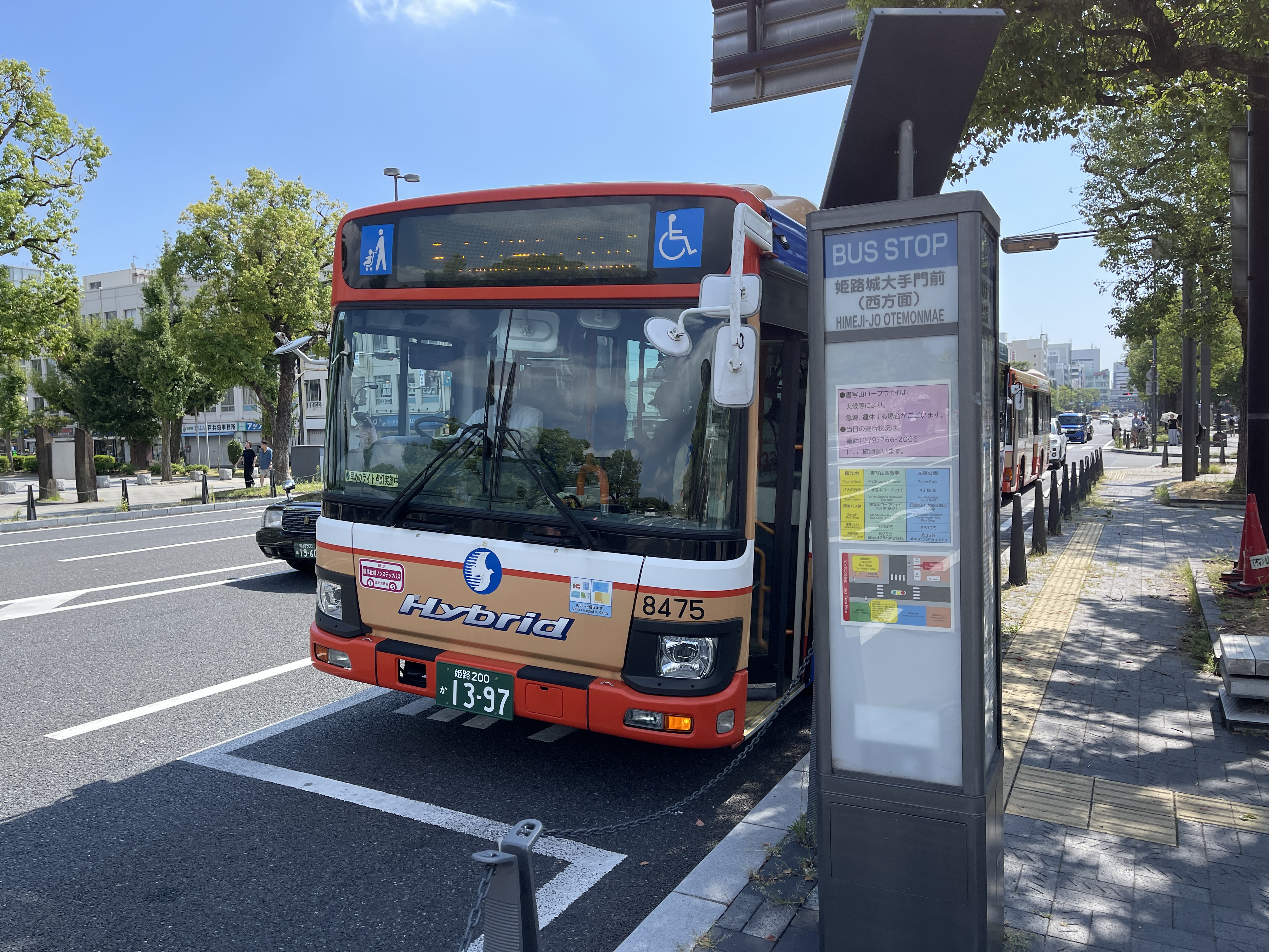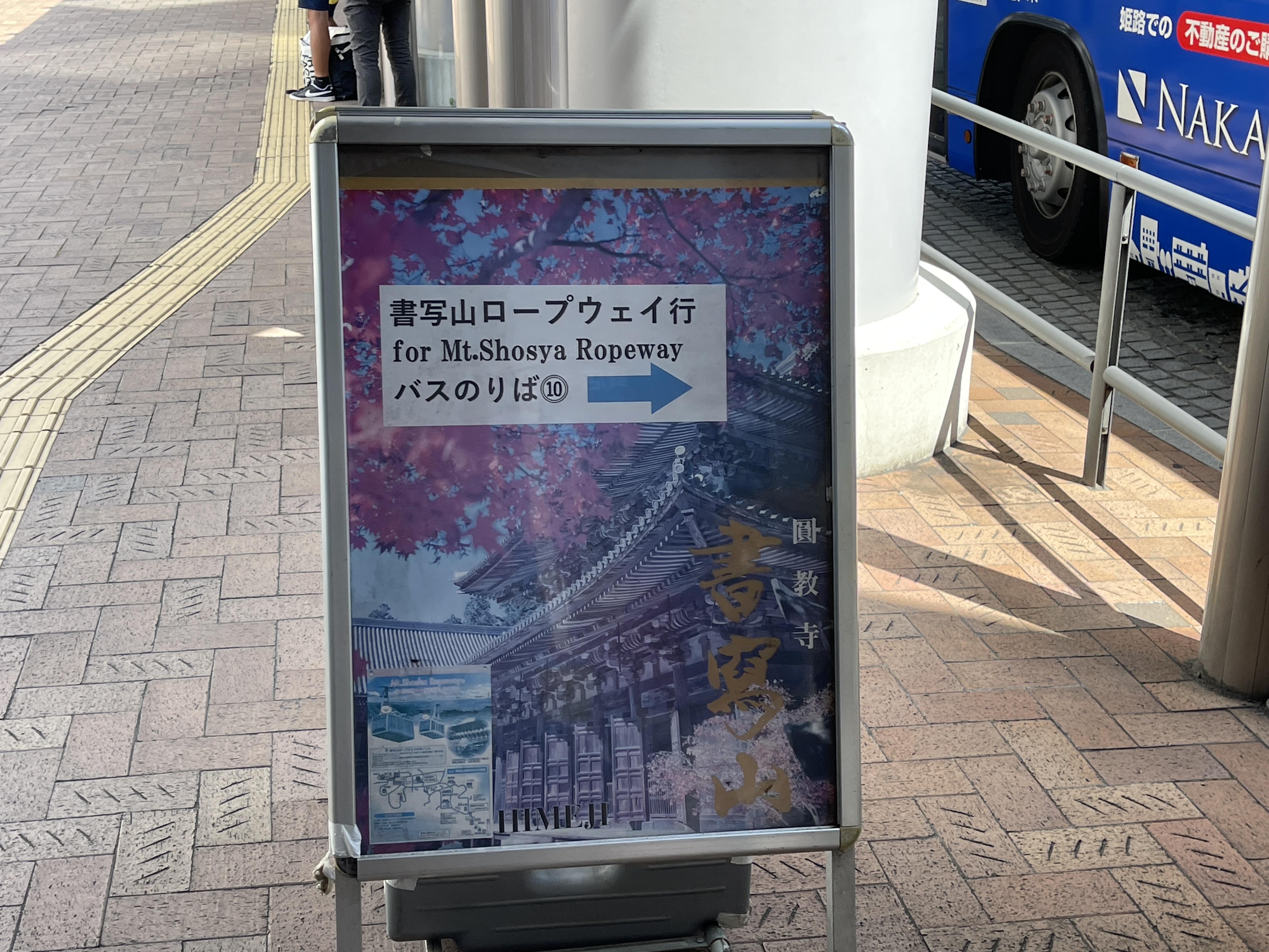 히메지성 마크가 붙은 버스 정류장에 선 버스는 아무 버스나 히메지성에 가니