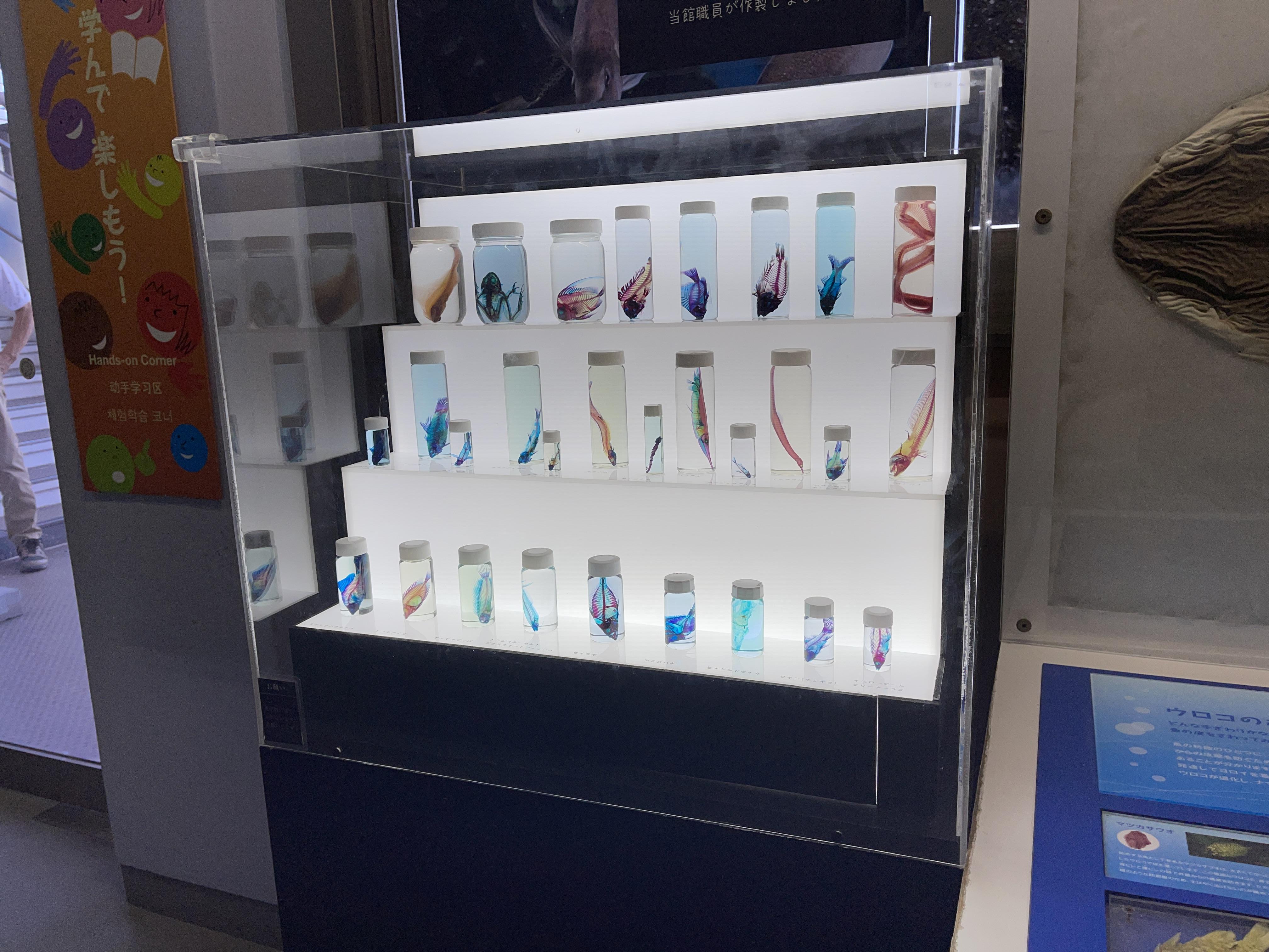 살과 뼈가 구분되게 염색한 물고기 표본을 비롯해서