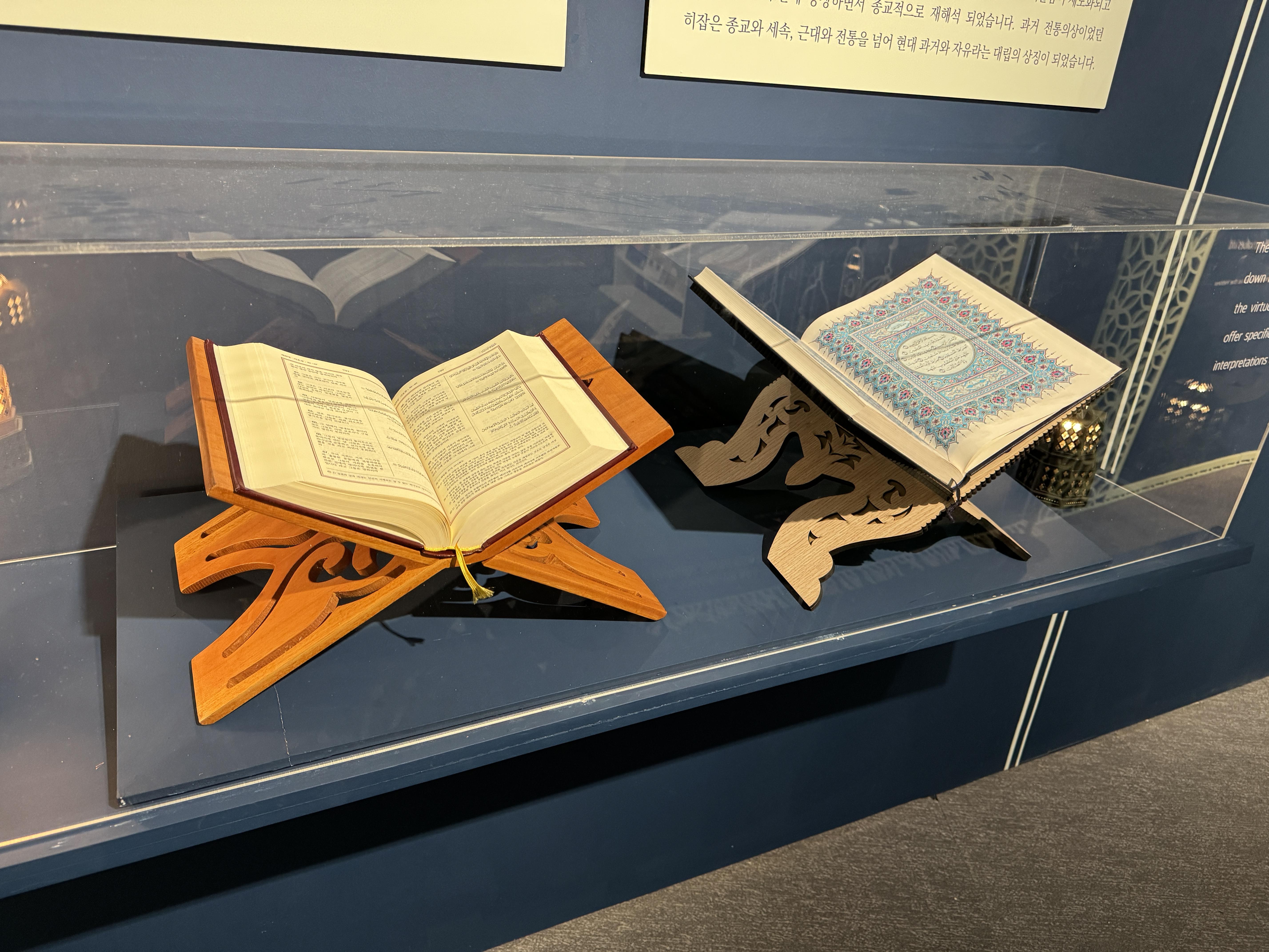 먼저 책 받침대에 놓인 이슬람교의 경전 쿠란을 통해