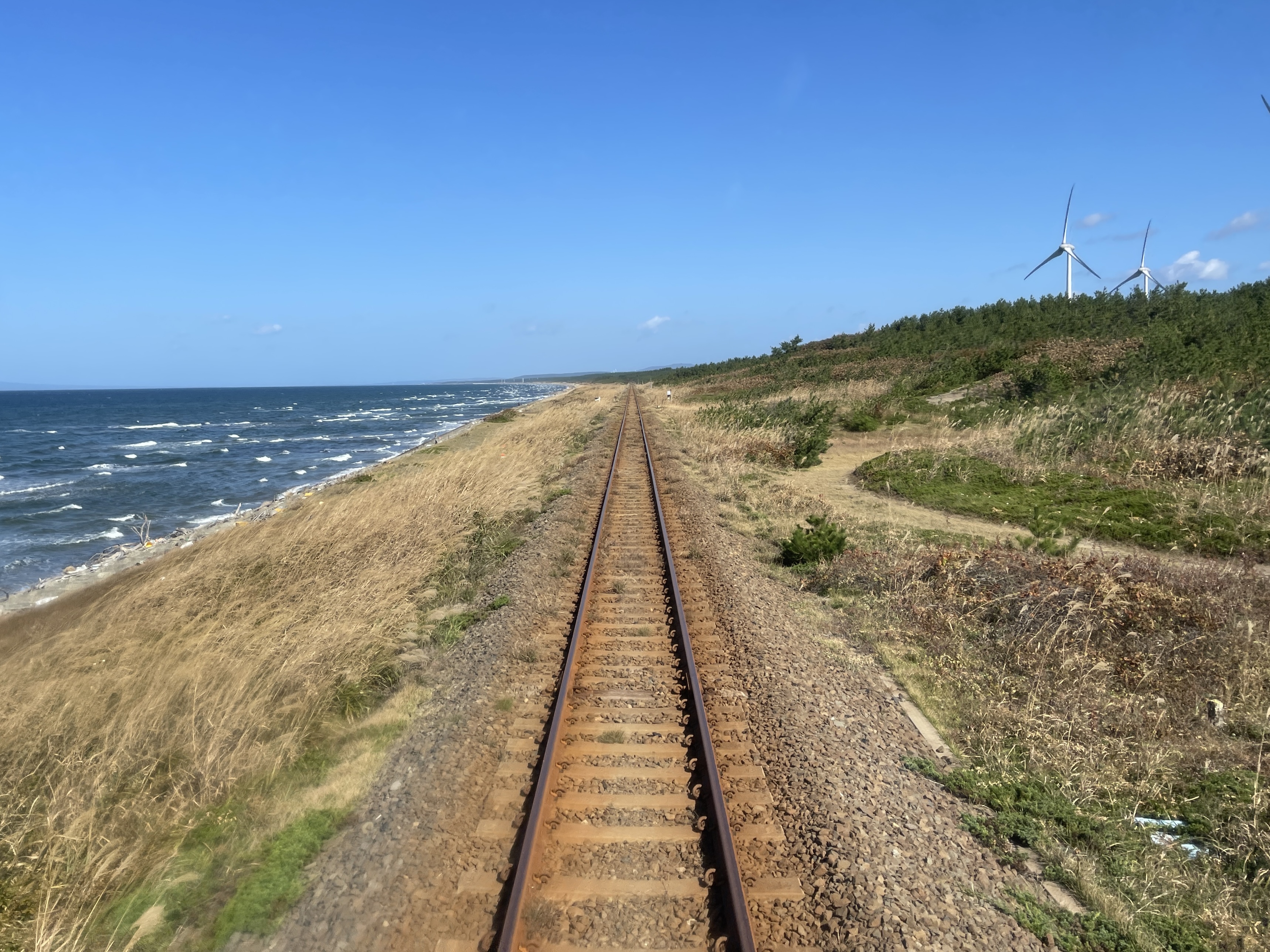 시모키타 반도 서쪽 무츠만을 따라 오미나토역을 향하는 열차는