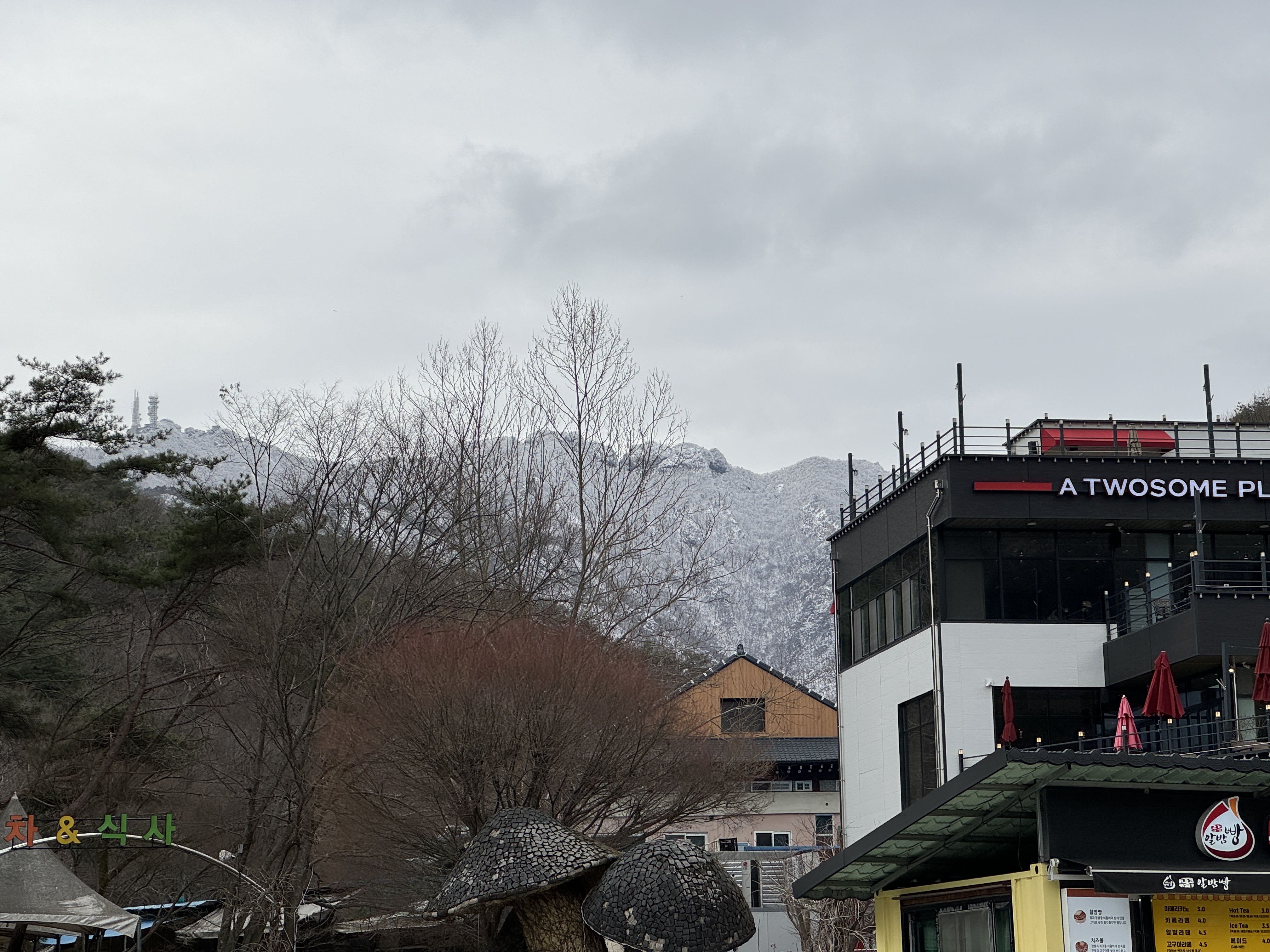 별의별 가게와 나무에 가려 하얀 자태가 사진에 잘 안 담기는 것을 아쉬워하며