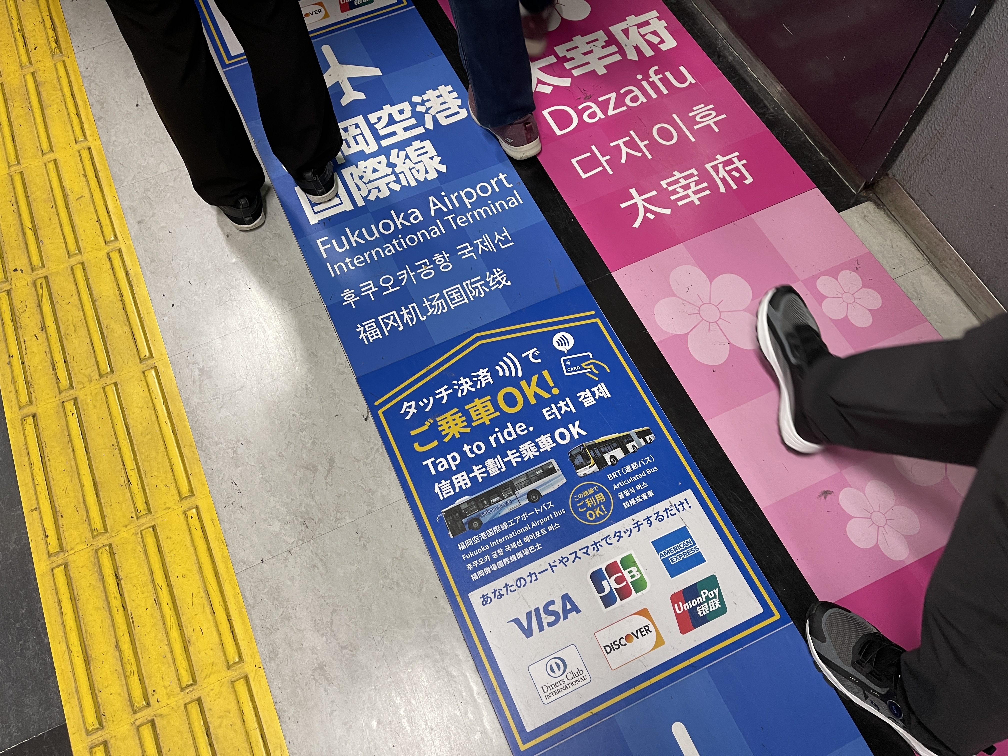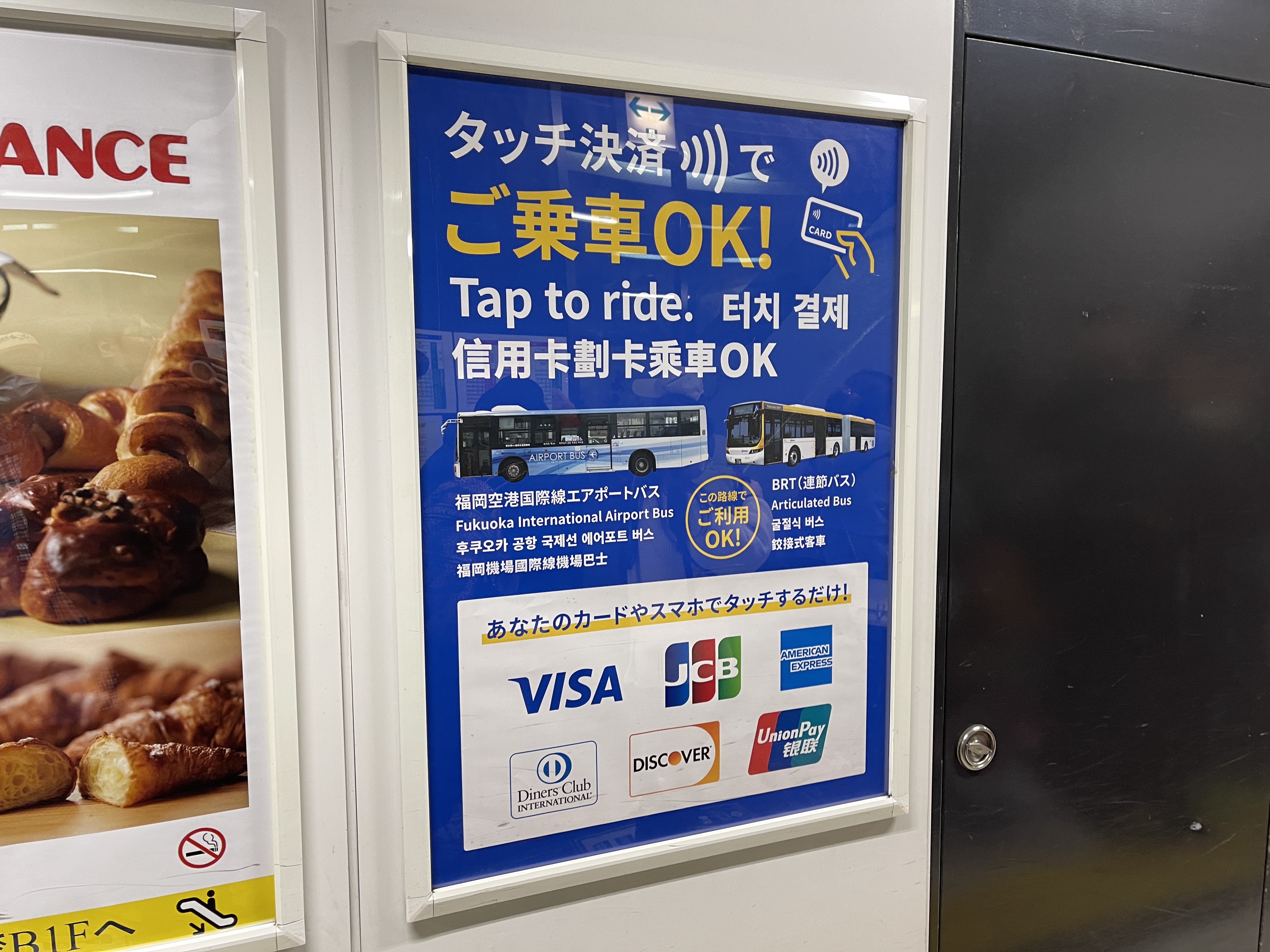 사방에 터치 결제에 대한 안내문이 여러 언어로 적혀 있네요.