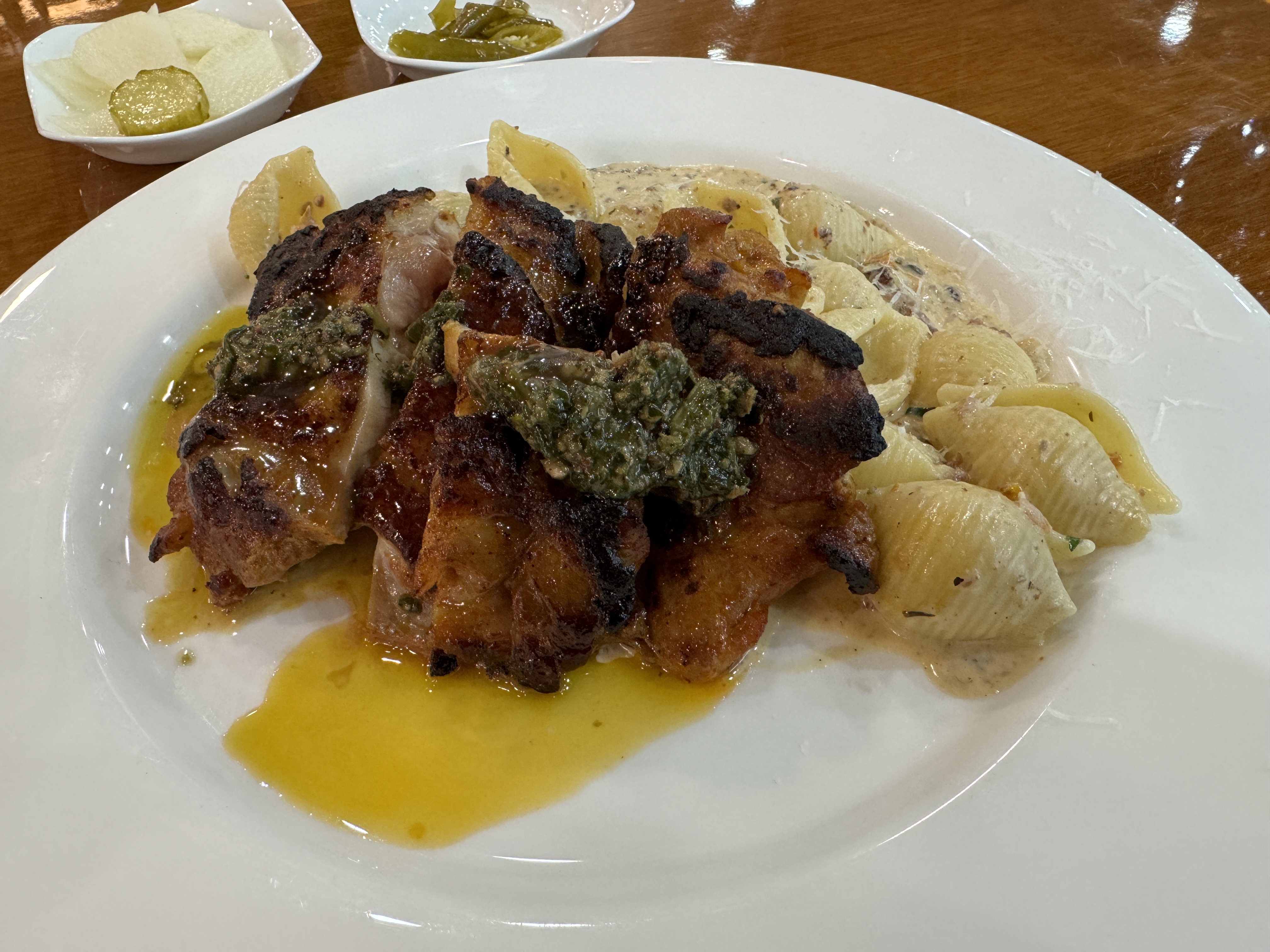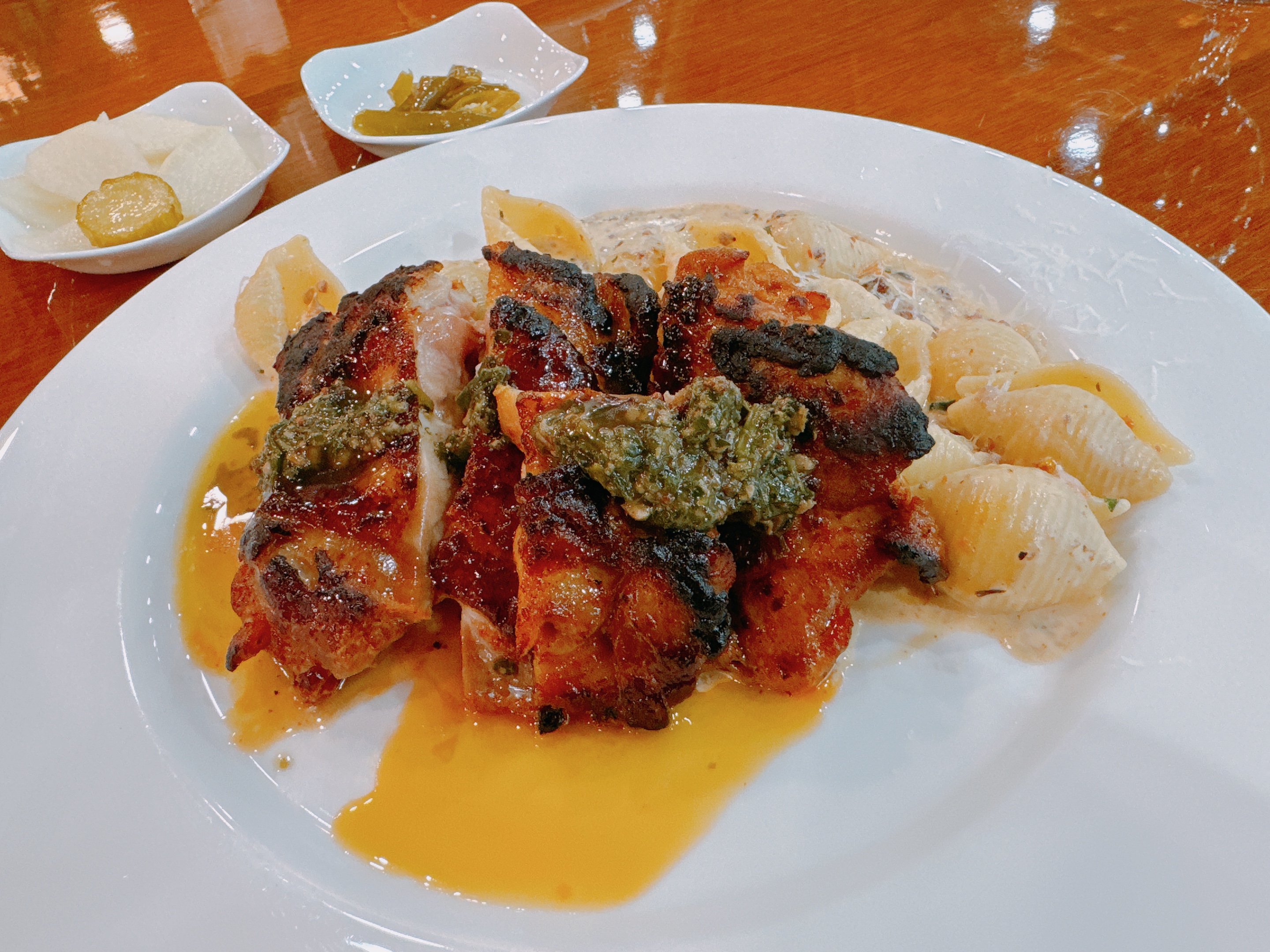 야채 살사를 올린 치킨 스테이크와 콘킬리에로 조리한 크림 파스타를 주문했는데