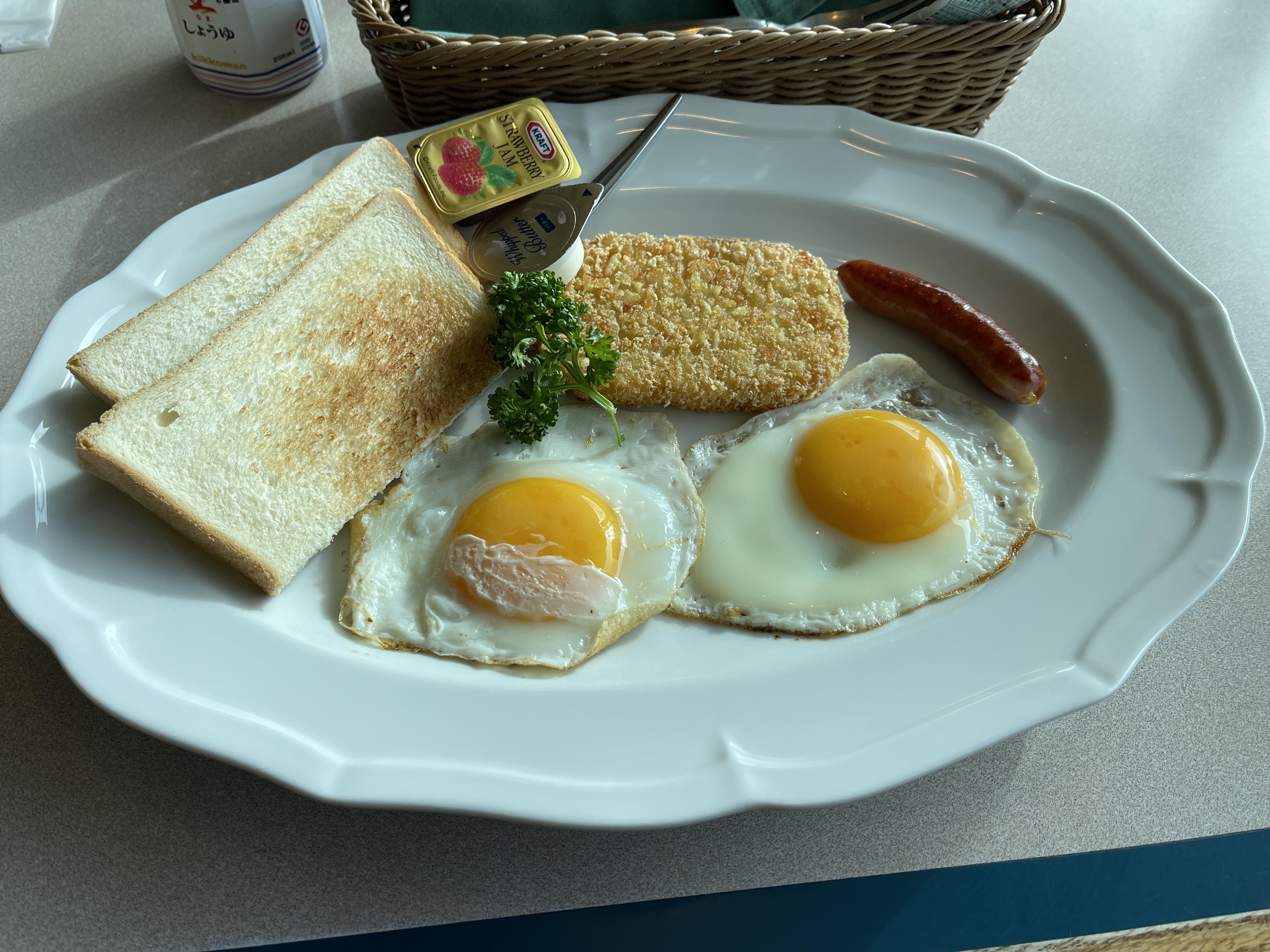 토스트와 계란, 소시지, 해시 브라운으로 가볍게 아침을 먹습니다.