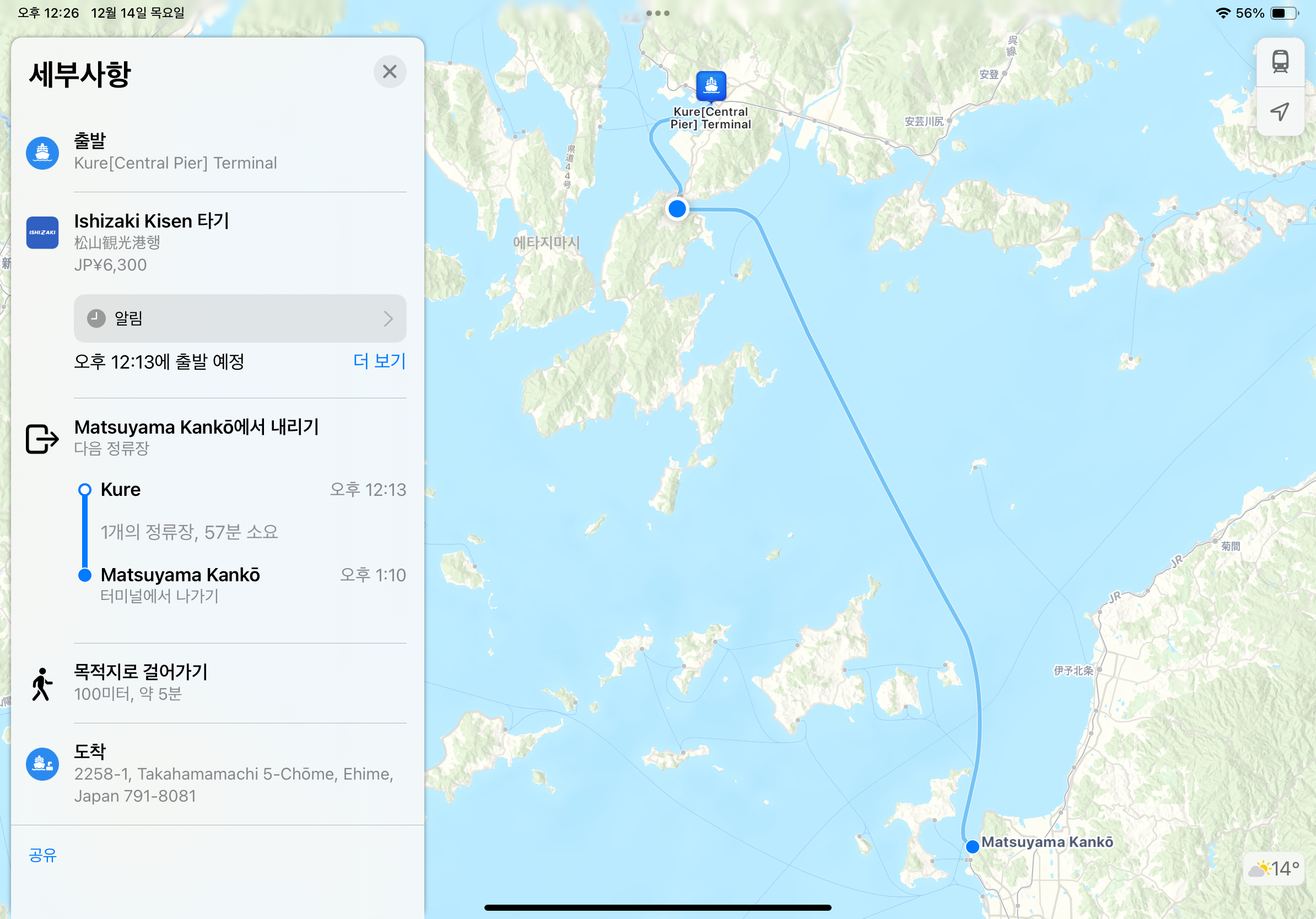 여기서는 히로시마에서 쿠레를 거쳐 마츠야마로 가는 배를 탈 수 있는데