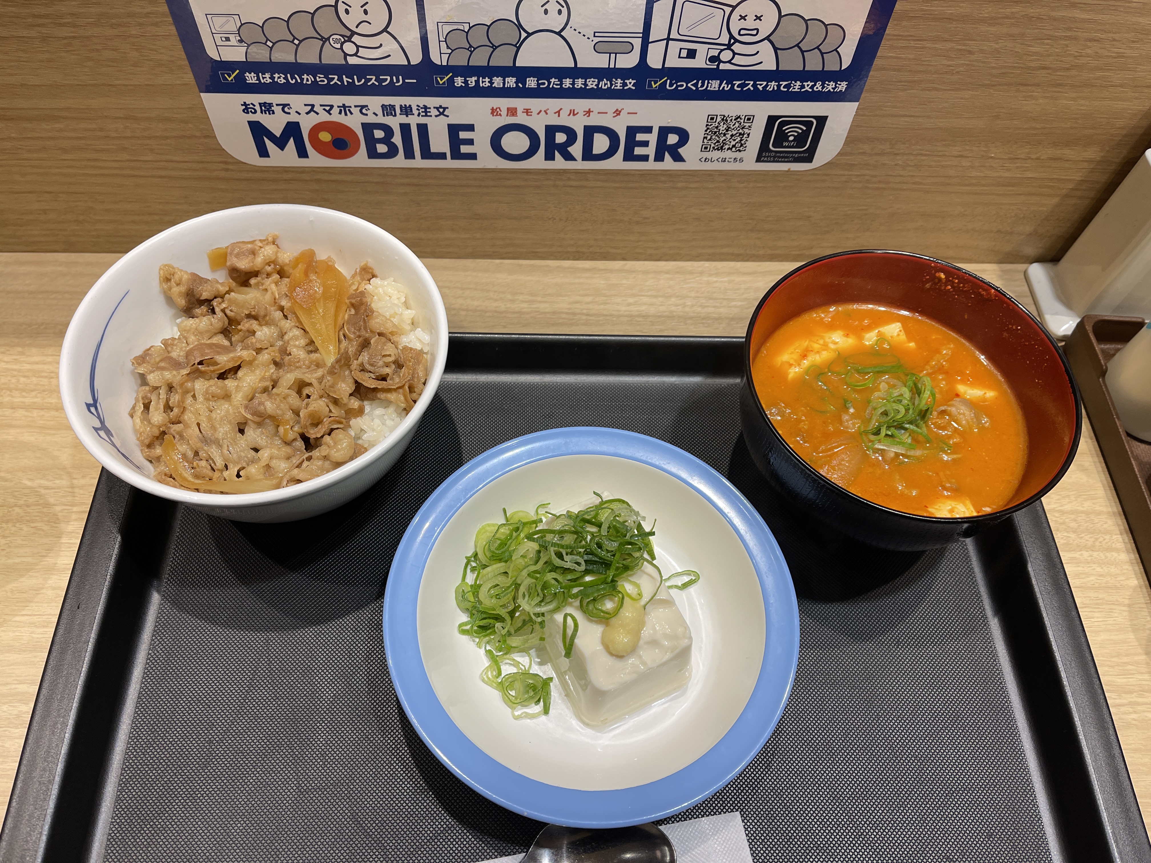 마츠야에 들르니 규동에 미소시루를 미니 김치찌개로 바꾼 세트를 팔고 있어