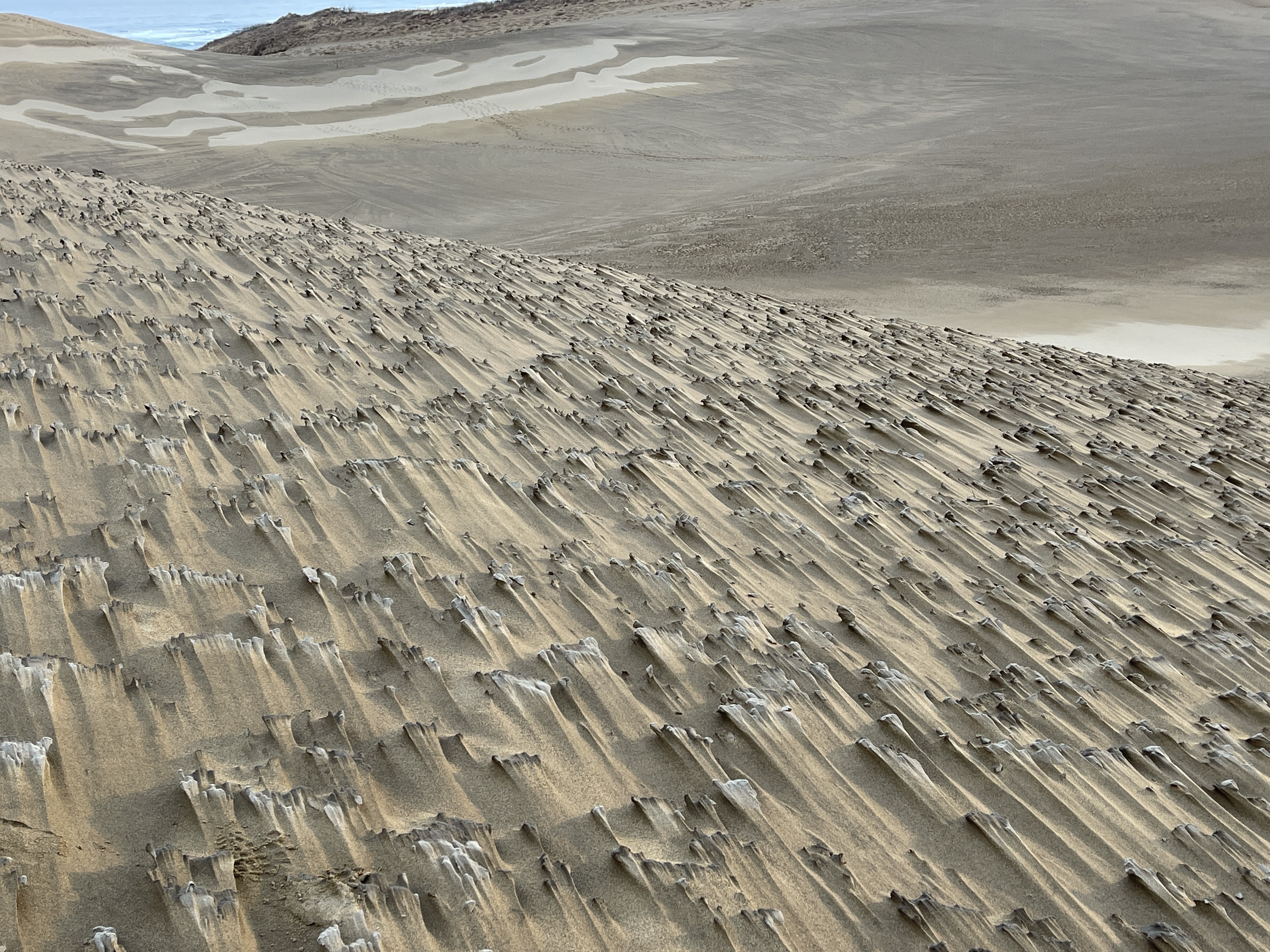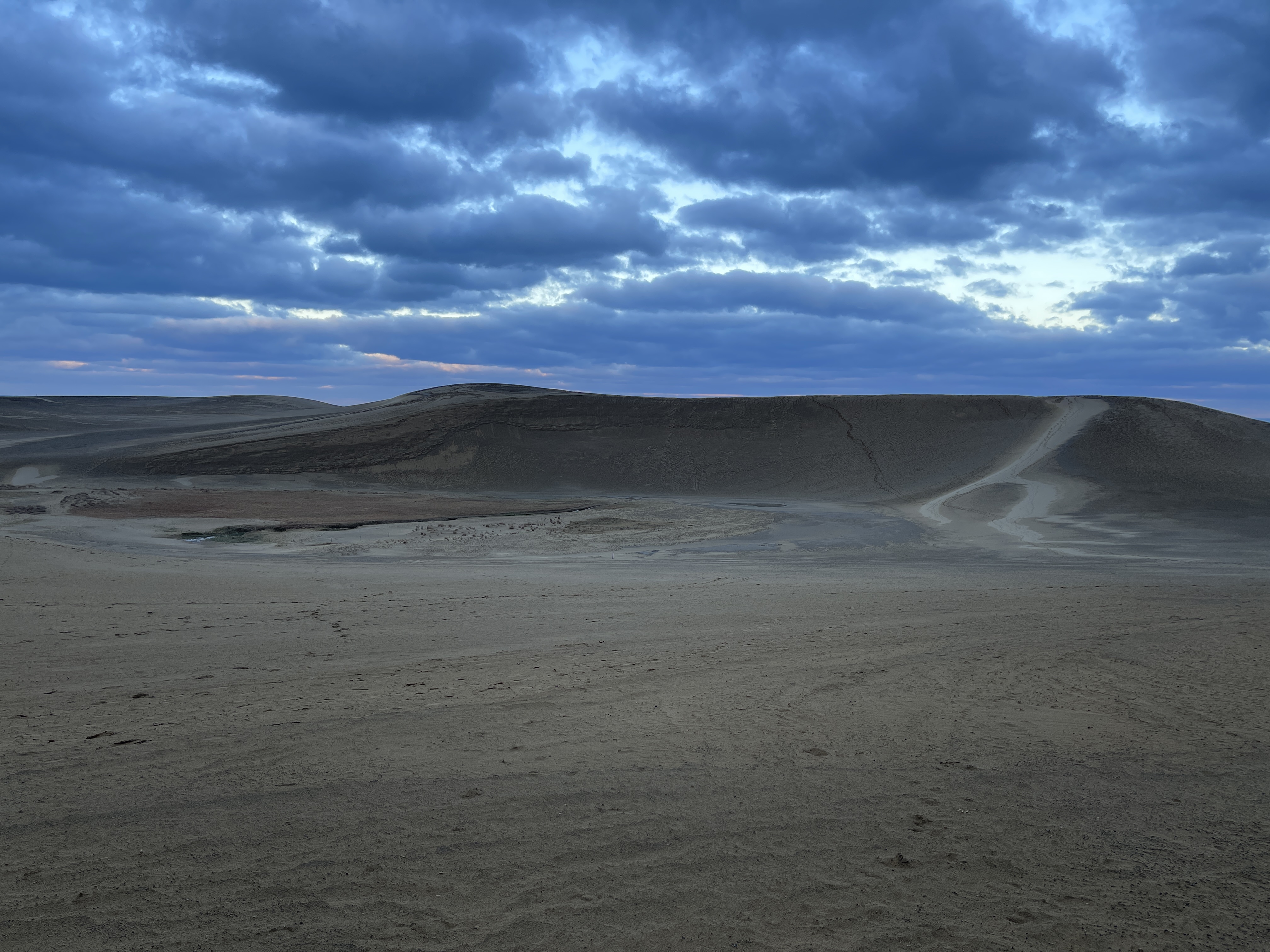 구름 사이로 난 햇빛을 받고 더욱 사막처럼 보이는 사구를 봅니다.