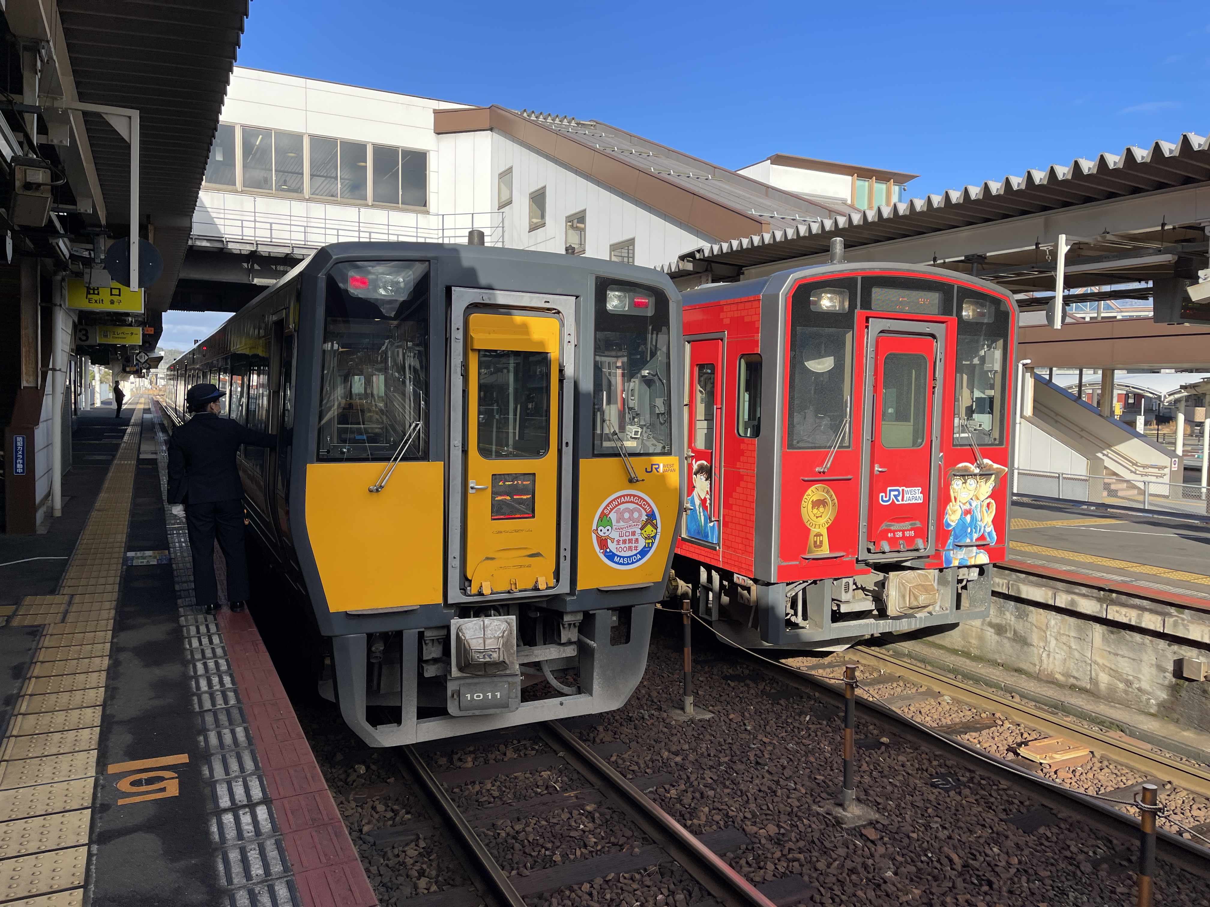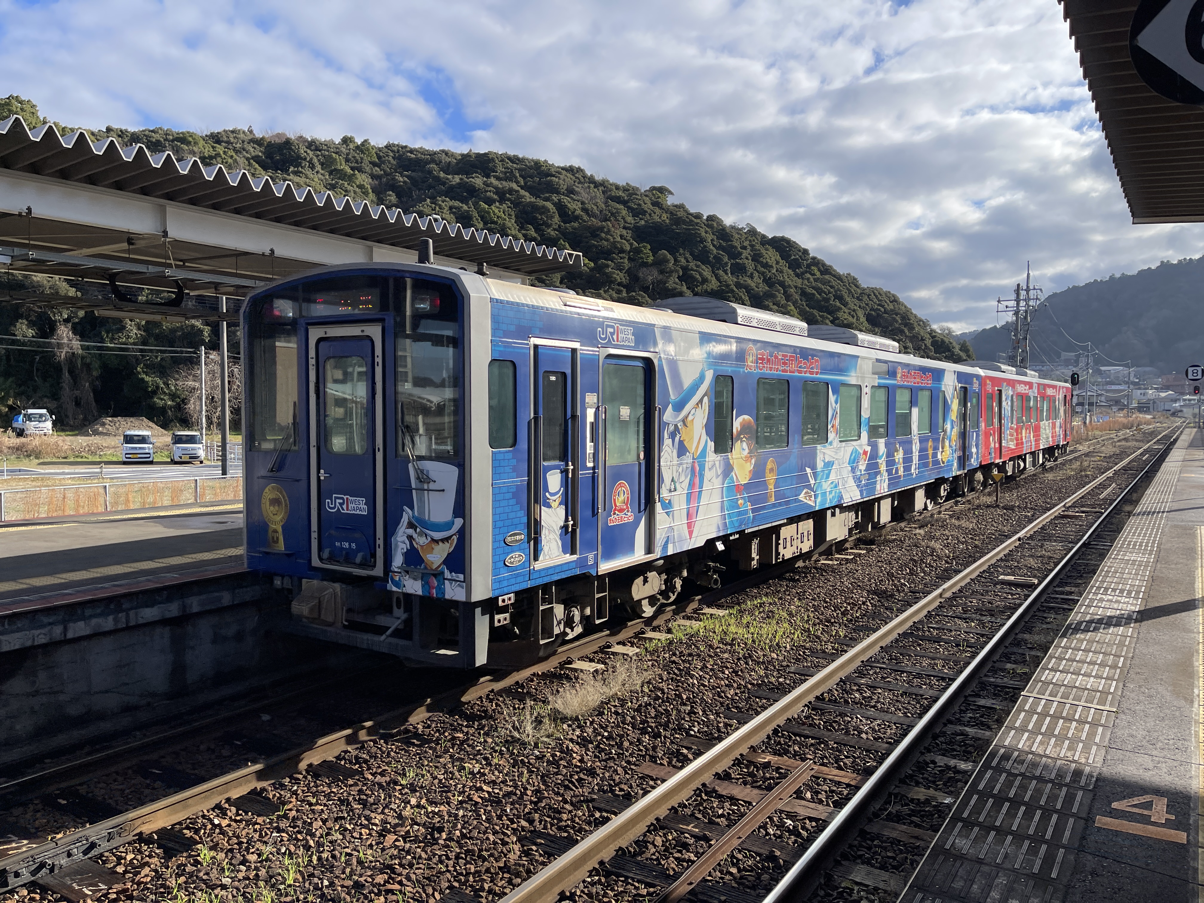 열차에 내리고 사진을 찍으려고 보니 반대편에 명탐정 코난 래핑을 한 열차가 있네요.