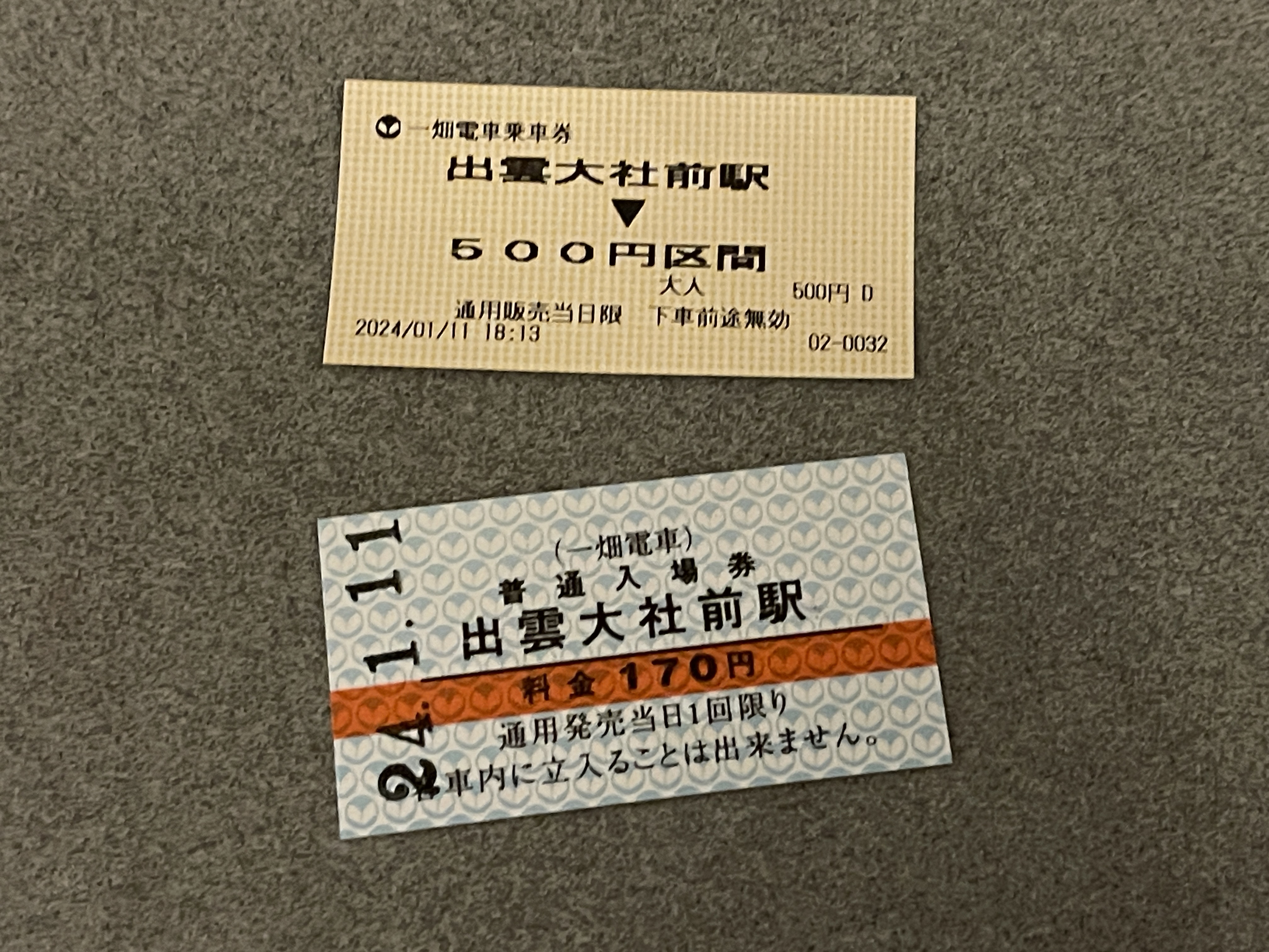 일본에서 경권(硬券, 코켄)이라고 부르는 두꺼운 마분지에 인쇄한 이즈모타이샤마에역 입장권입니다.