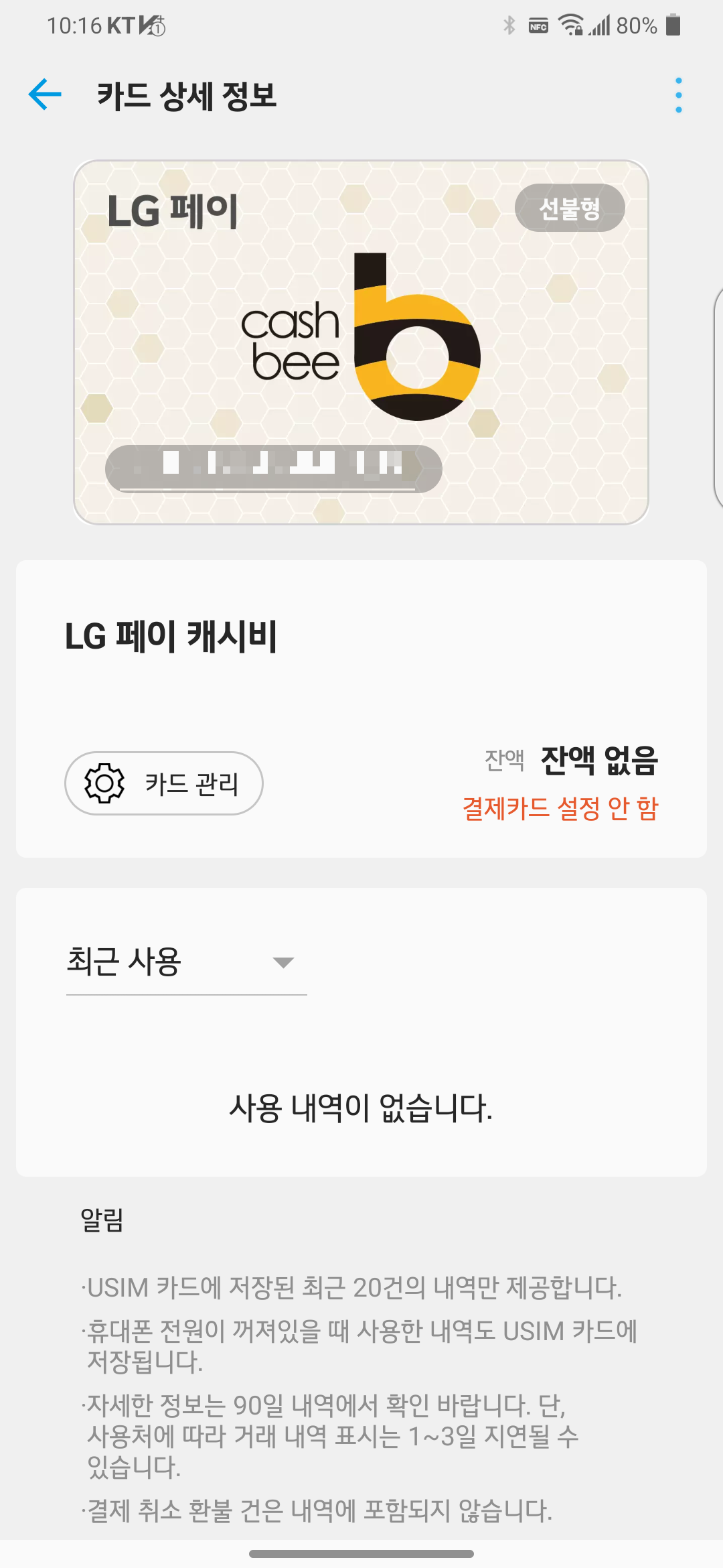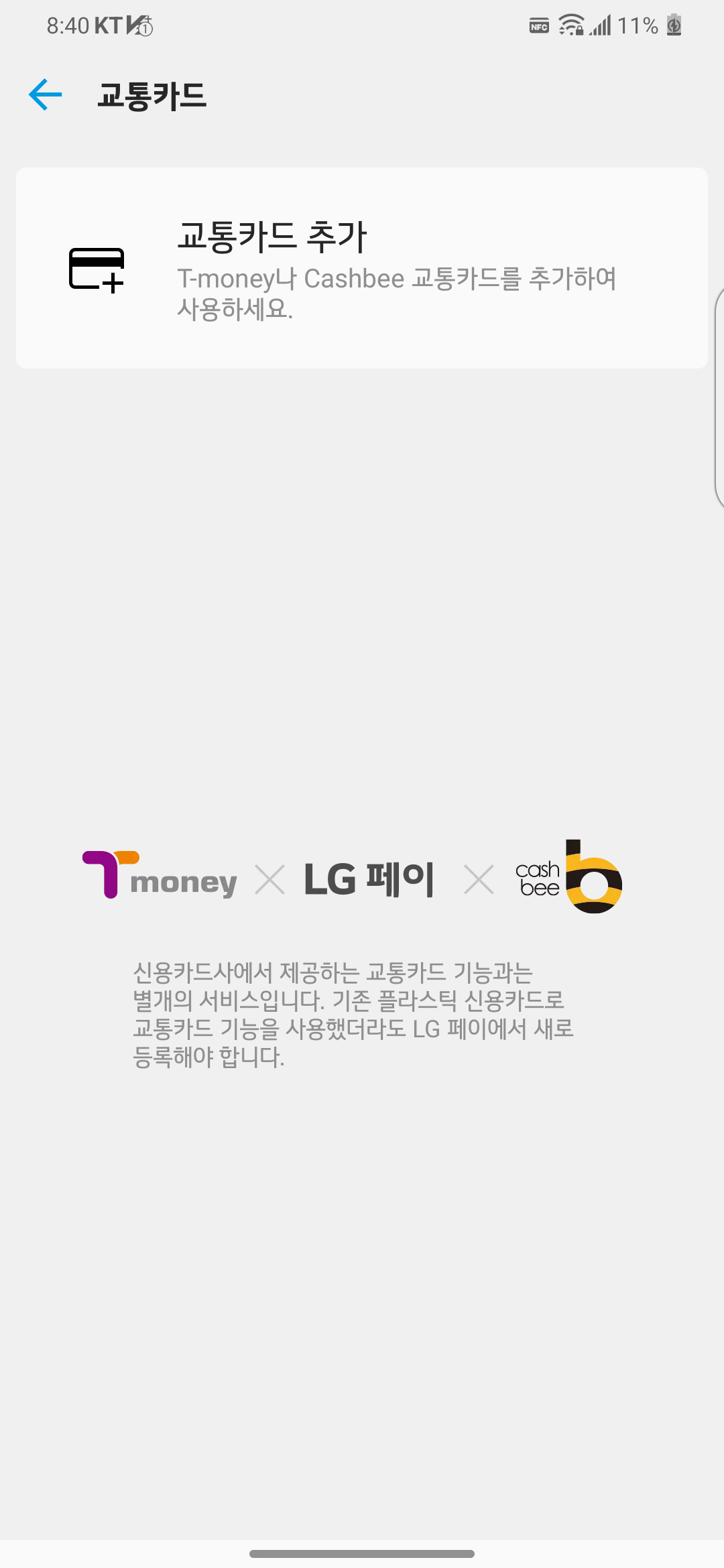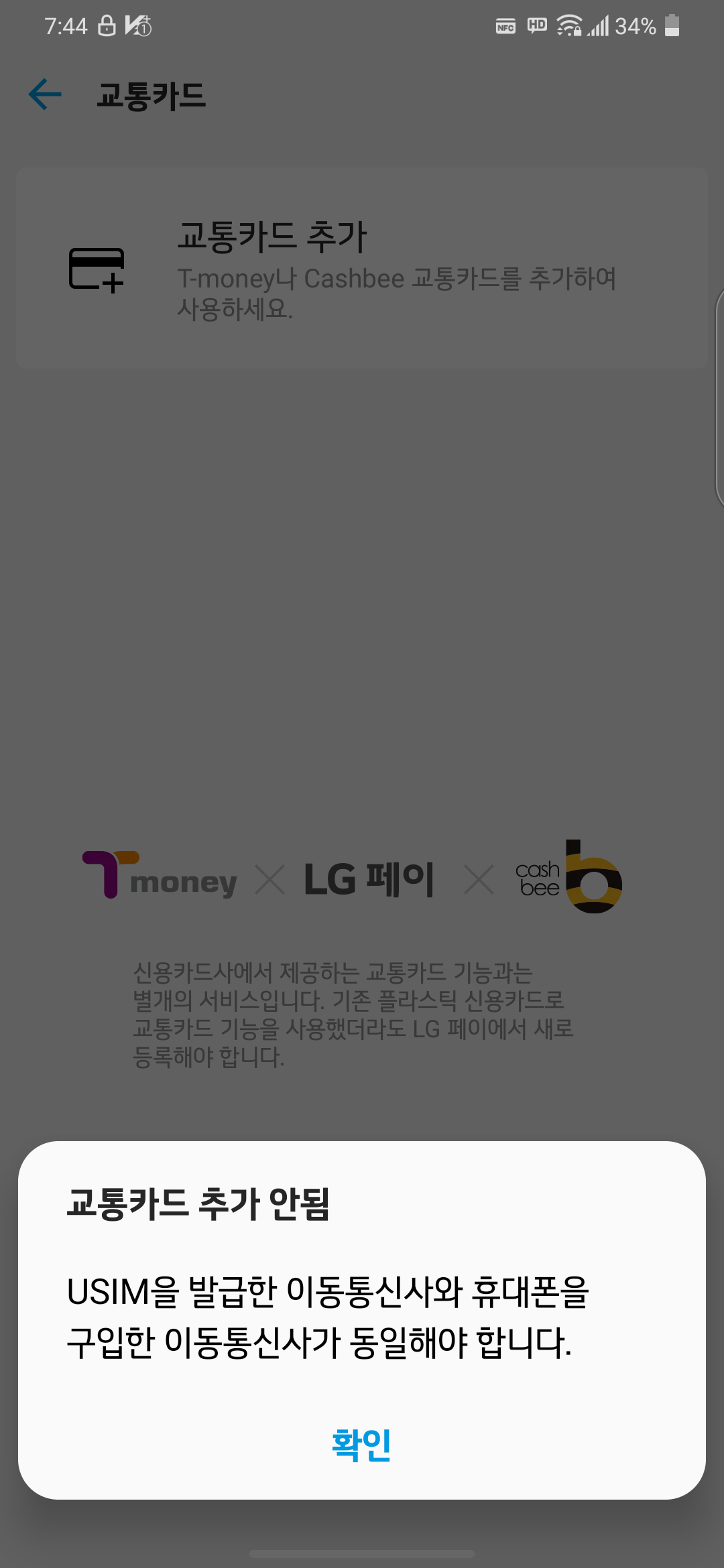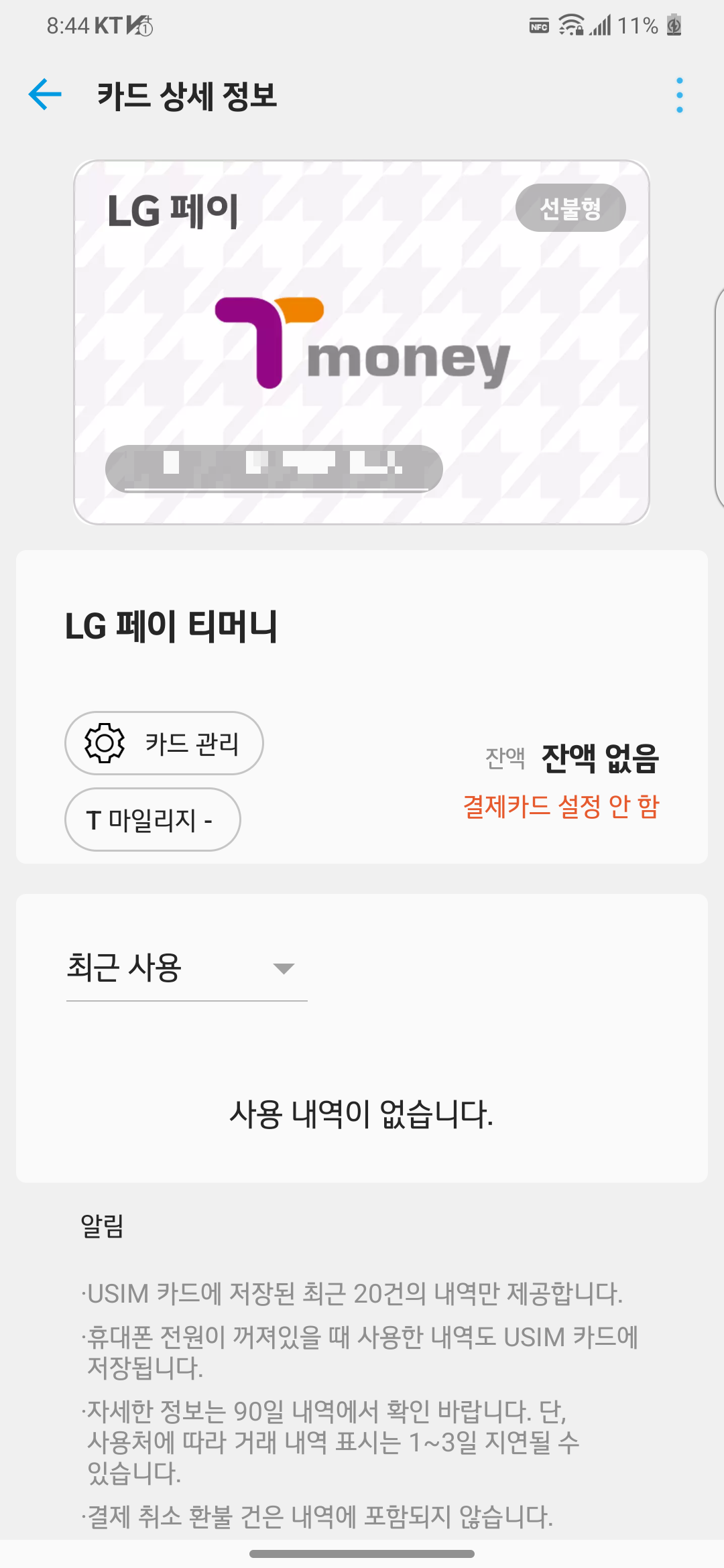 LG V50S가 옛날 폰이다 보니 V50 통신사와 USIM 통신사가 일치해야 교통카드를 만들 수 있네요.