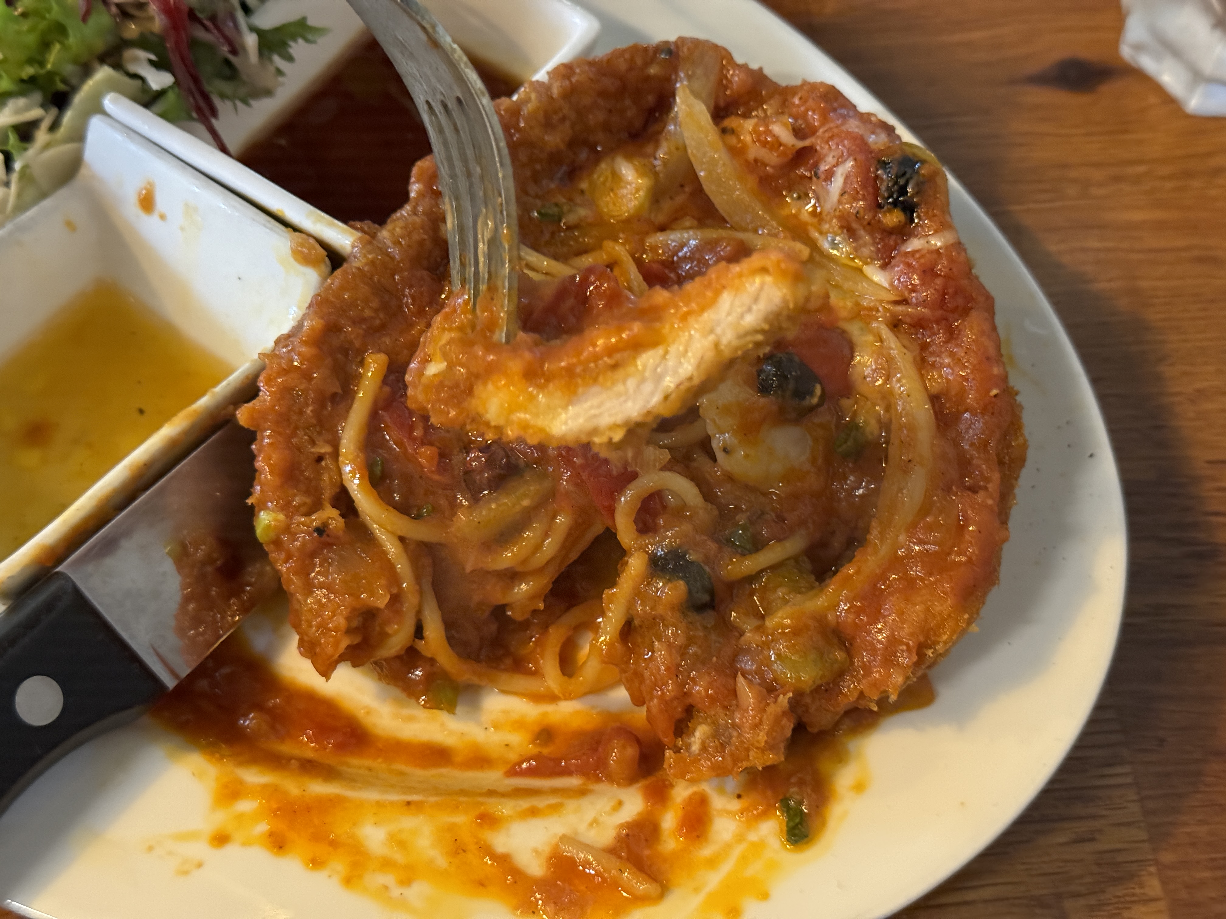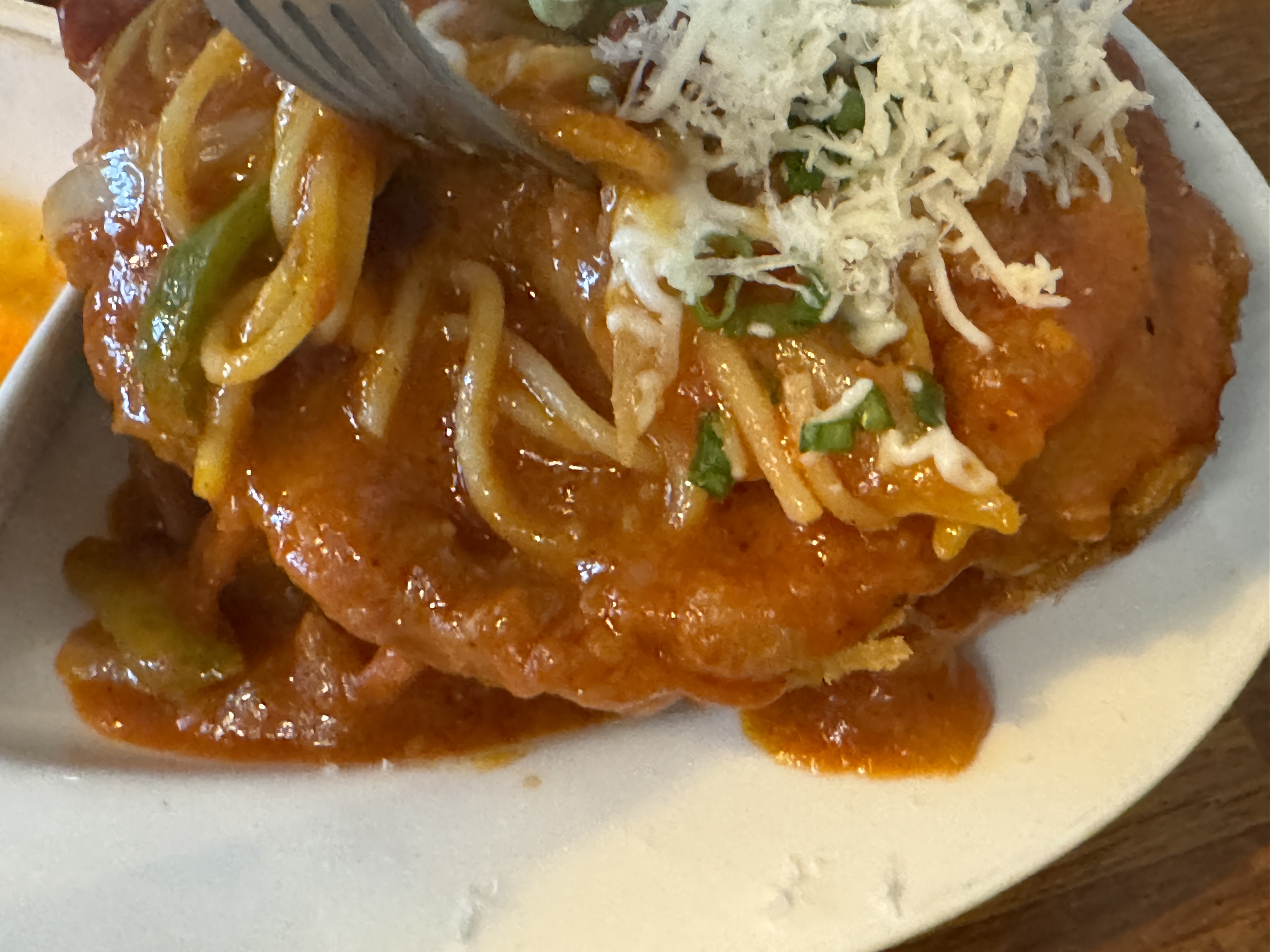 위에서 볼 때에는 스파게티에 돈가스가 가려져서 잘 안 보였는데