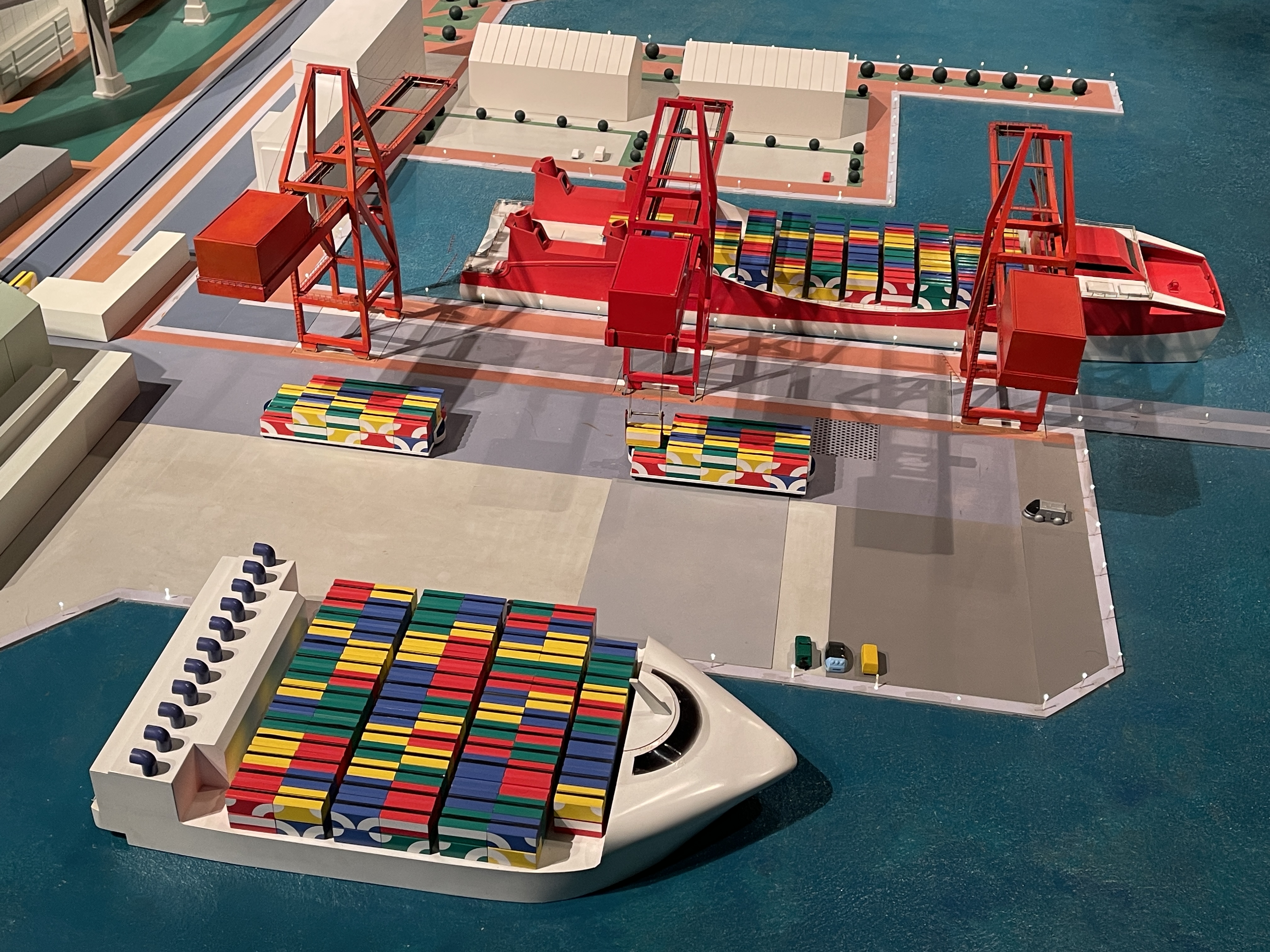 그리고 너무나도 비현실적인 모습의 컨테이너선이 정박 중인 부두가 보입니다.