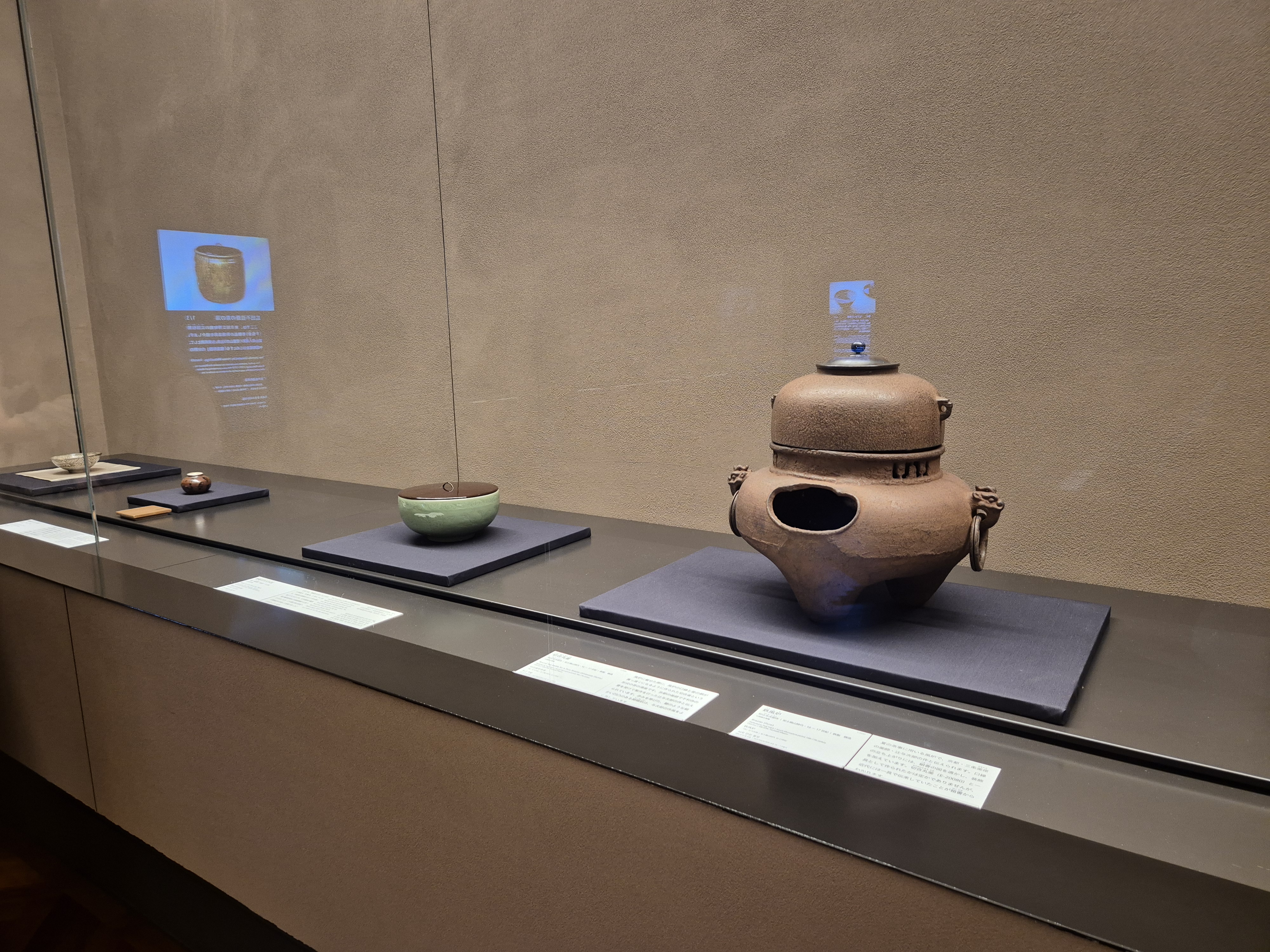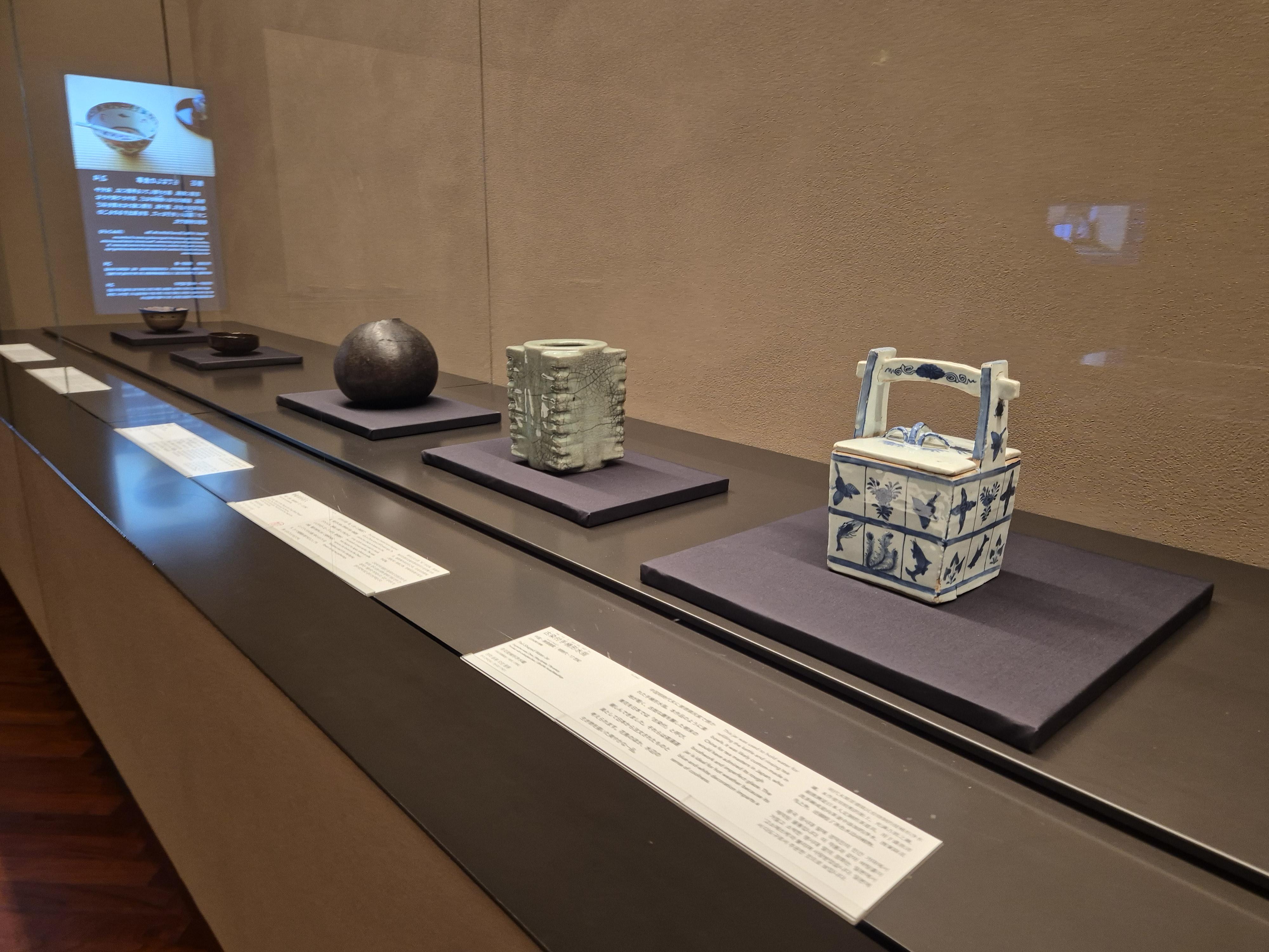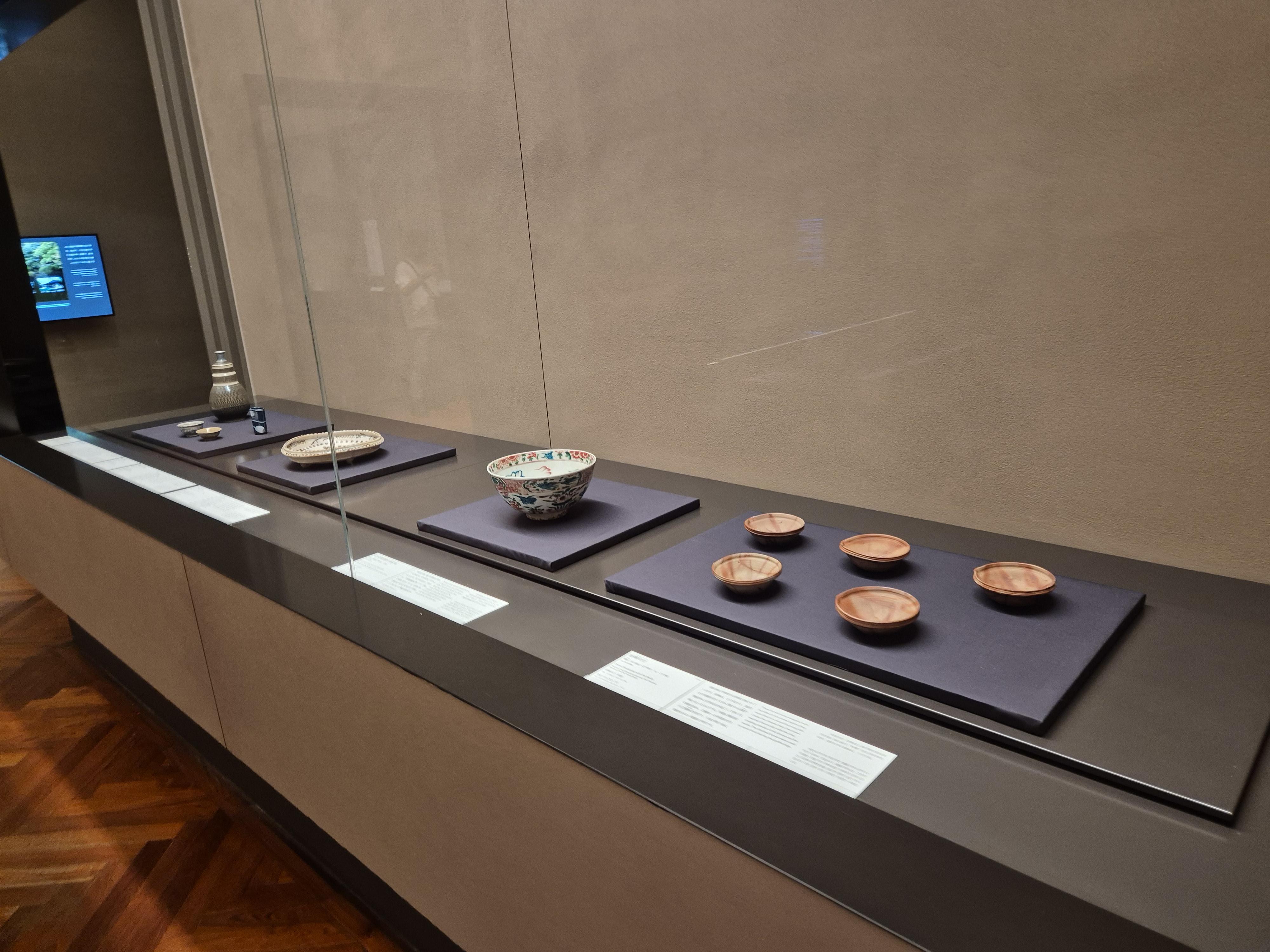 찻잔과 그릇 등 유물과 여러 언어로 적은 안내문을 통해 알리고 있네요.