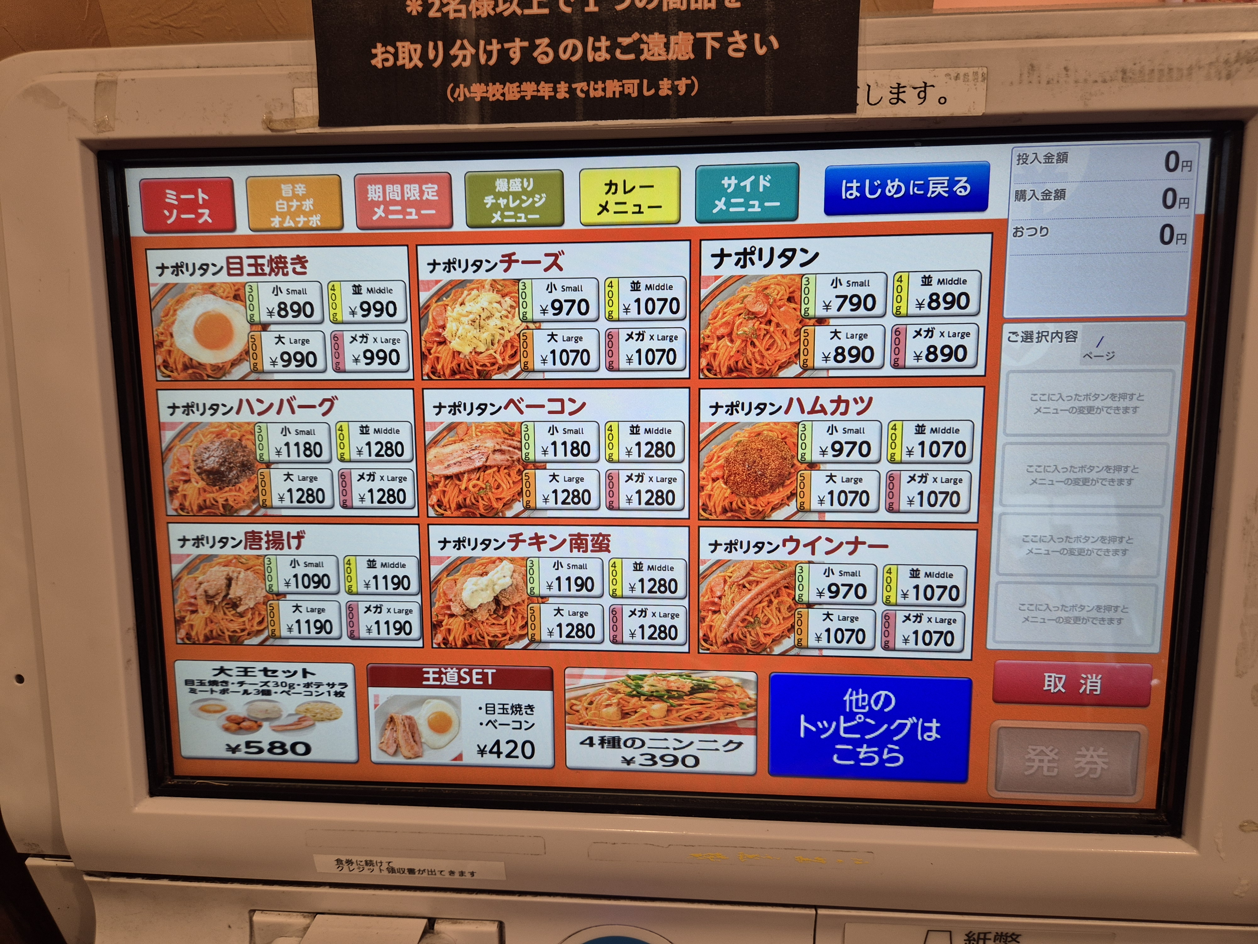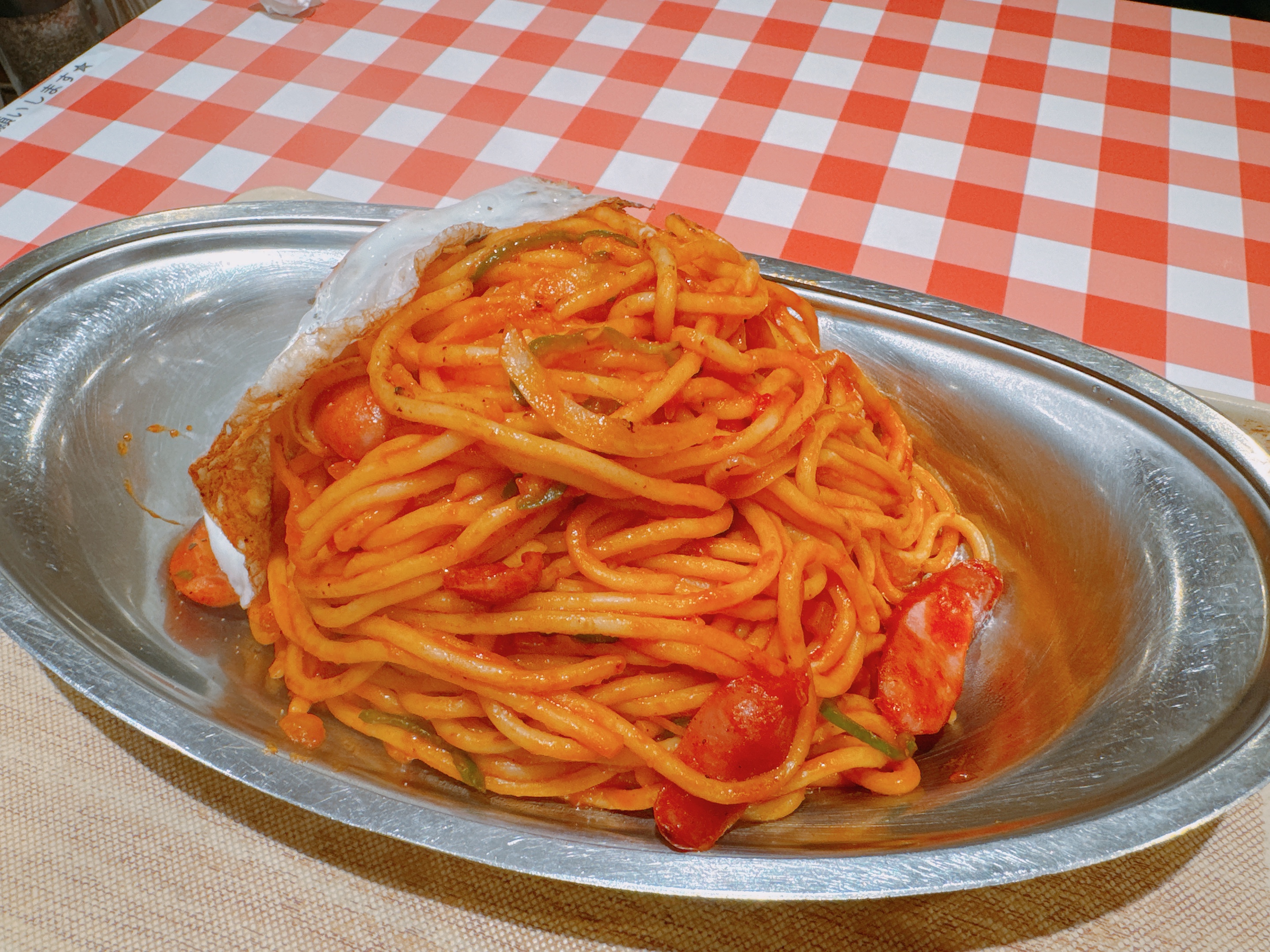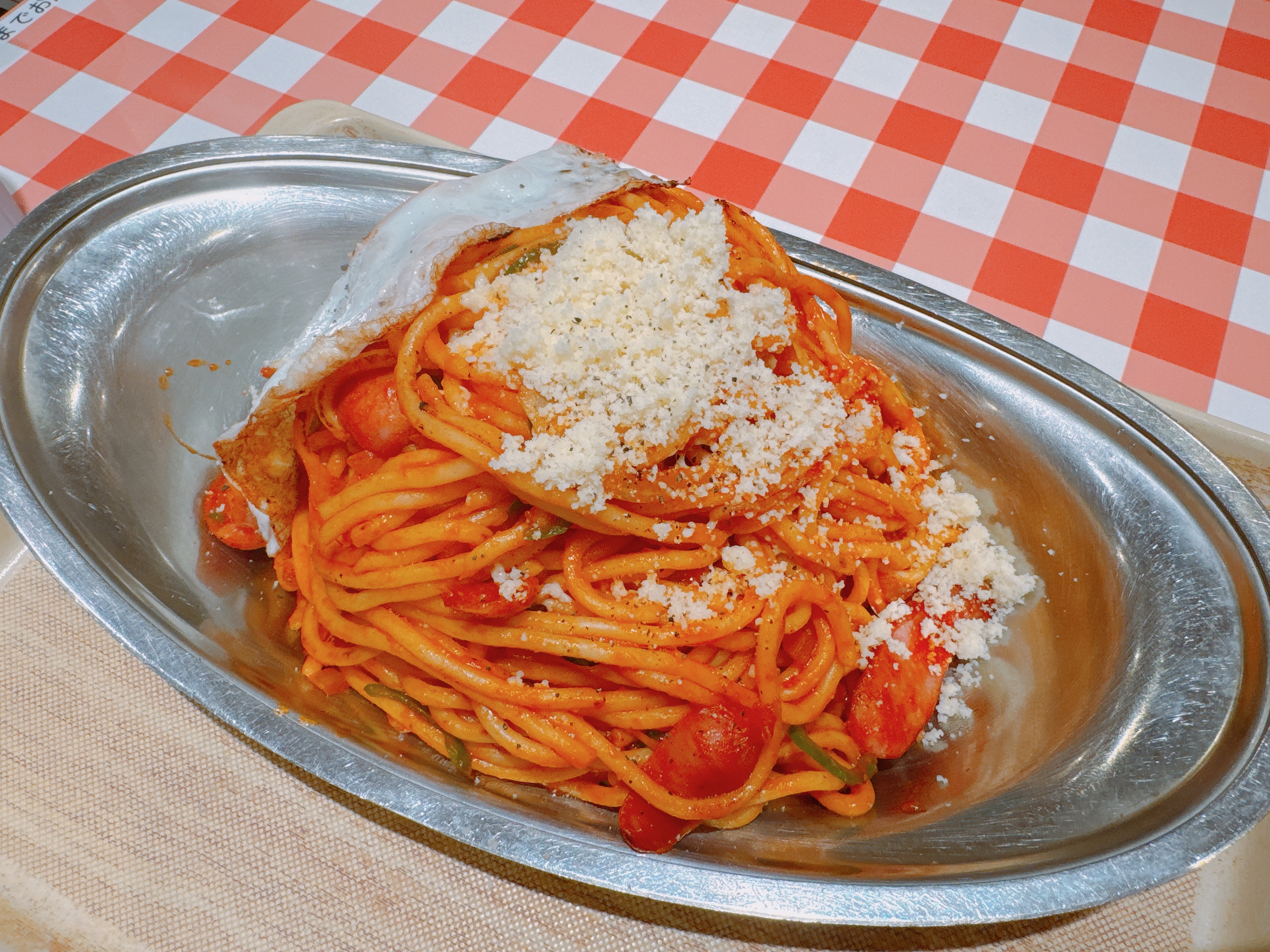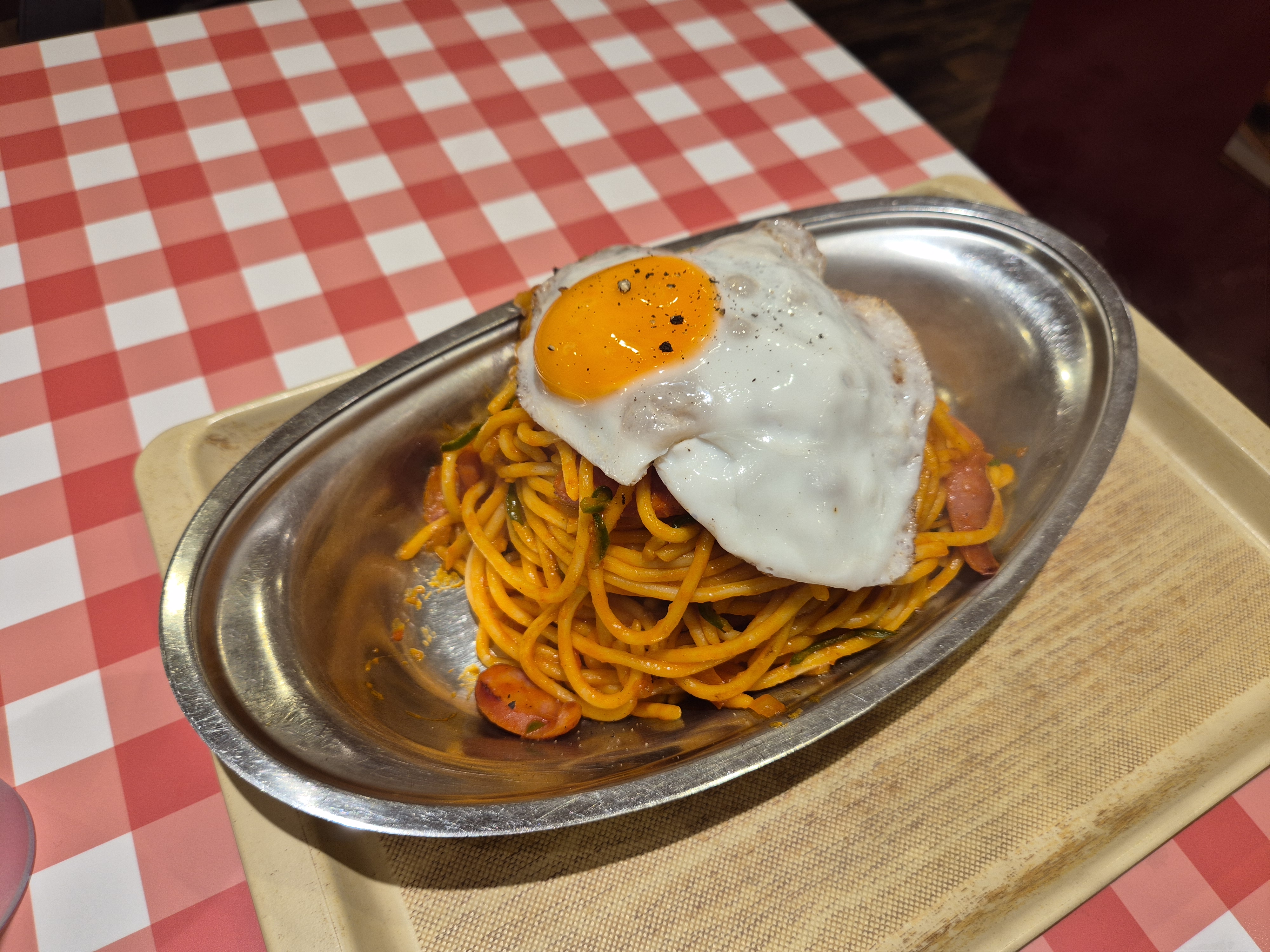 나폴리탄에 계란프라이(目玉焼き, 메다마야키)가 올라간 나포메다마 메가를 주문.