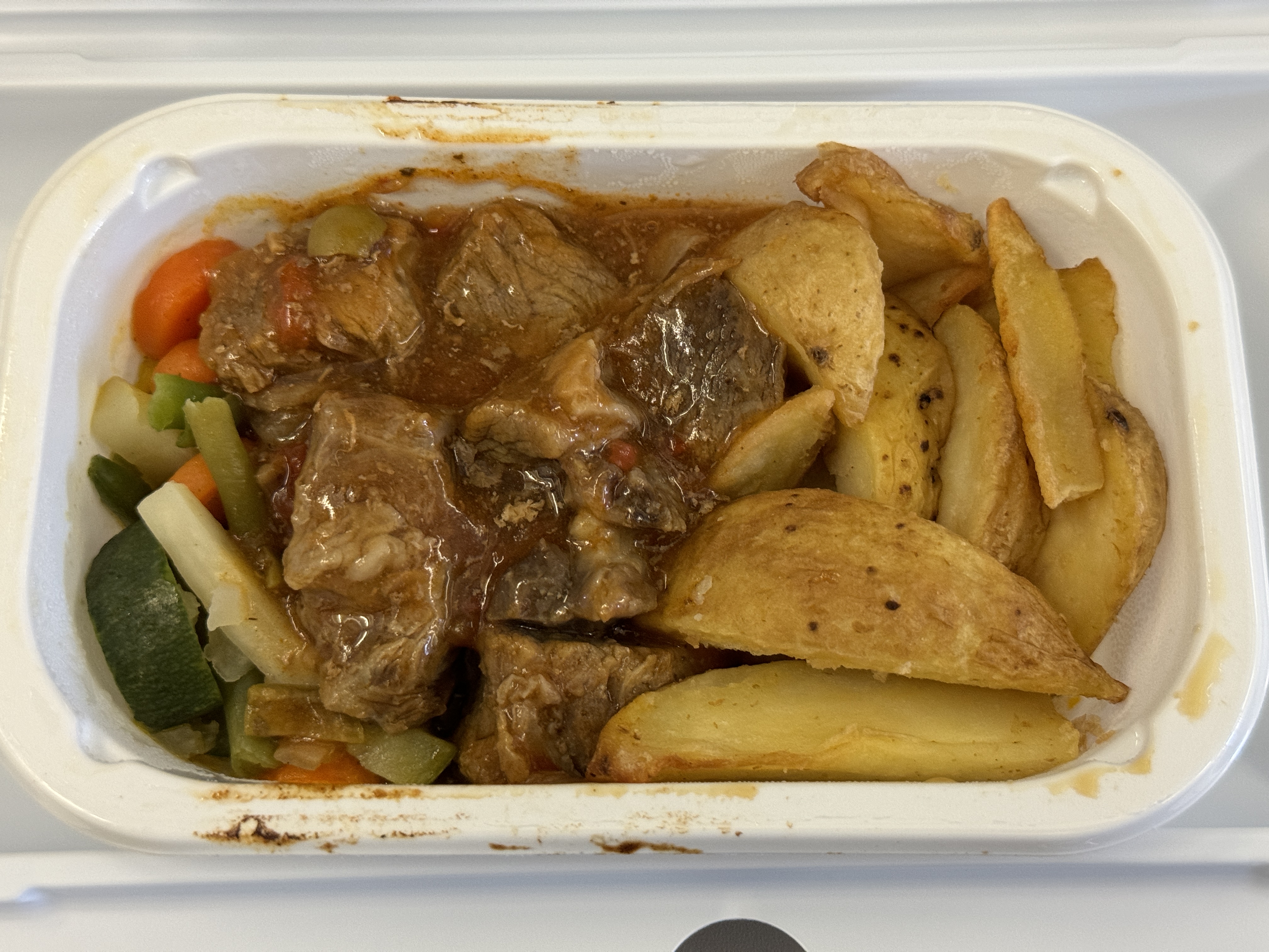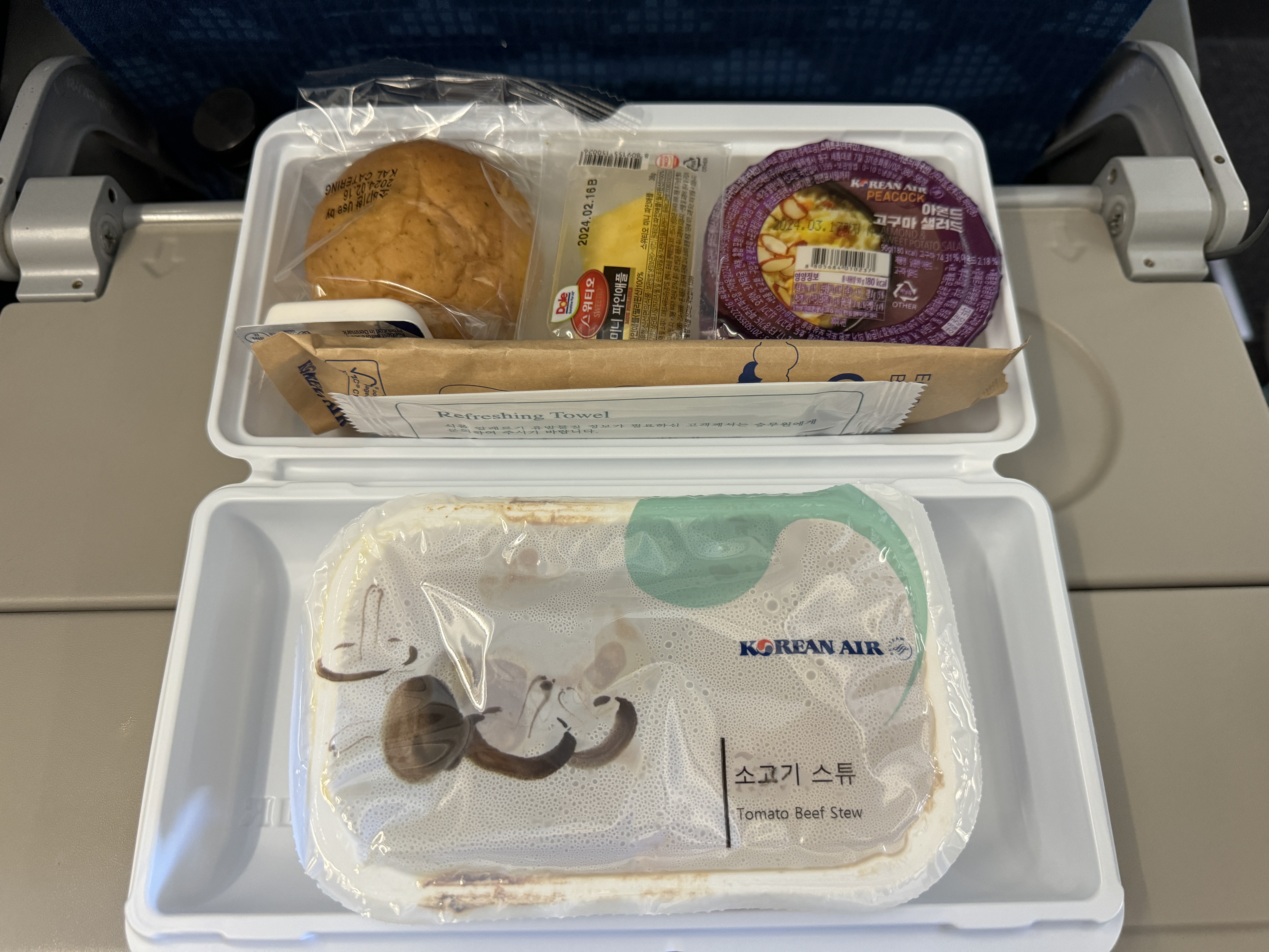 기내식으로 나온 소고기 스튜를 받아 먹습니다.