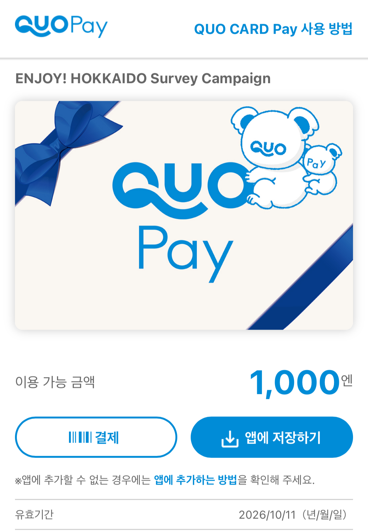 전날 홋카이도 레일 패스를 교환하면서 앙케트 이벤트로 받은 QUO Pay로 야식거리를 사고