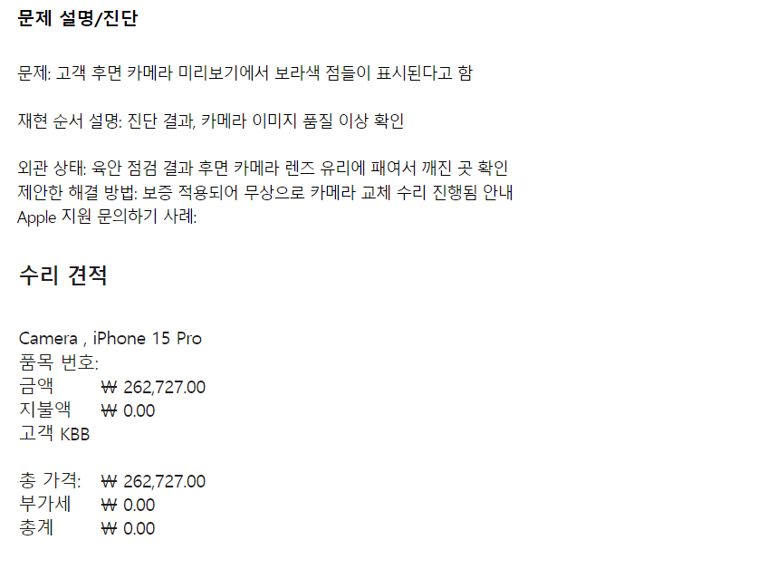 의외로 카메라 모듈 부품만 교체하면 된다는 안내를 받았습니다.