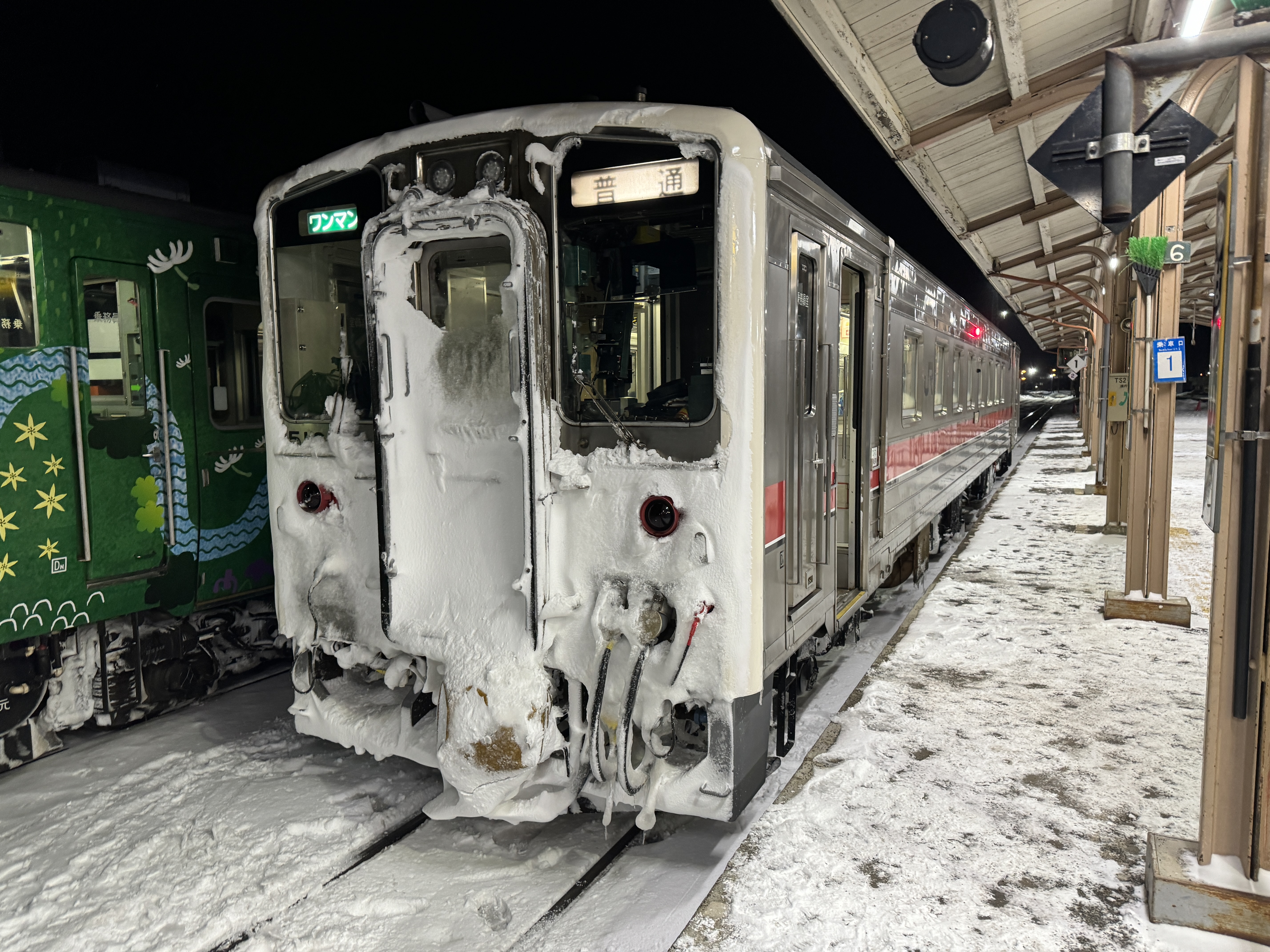 눈을 잔뜩 맞아 처참해진 몰골의 열차에 탑니다.