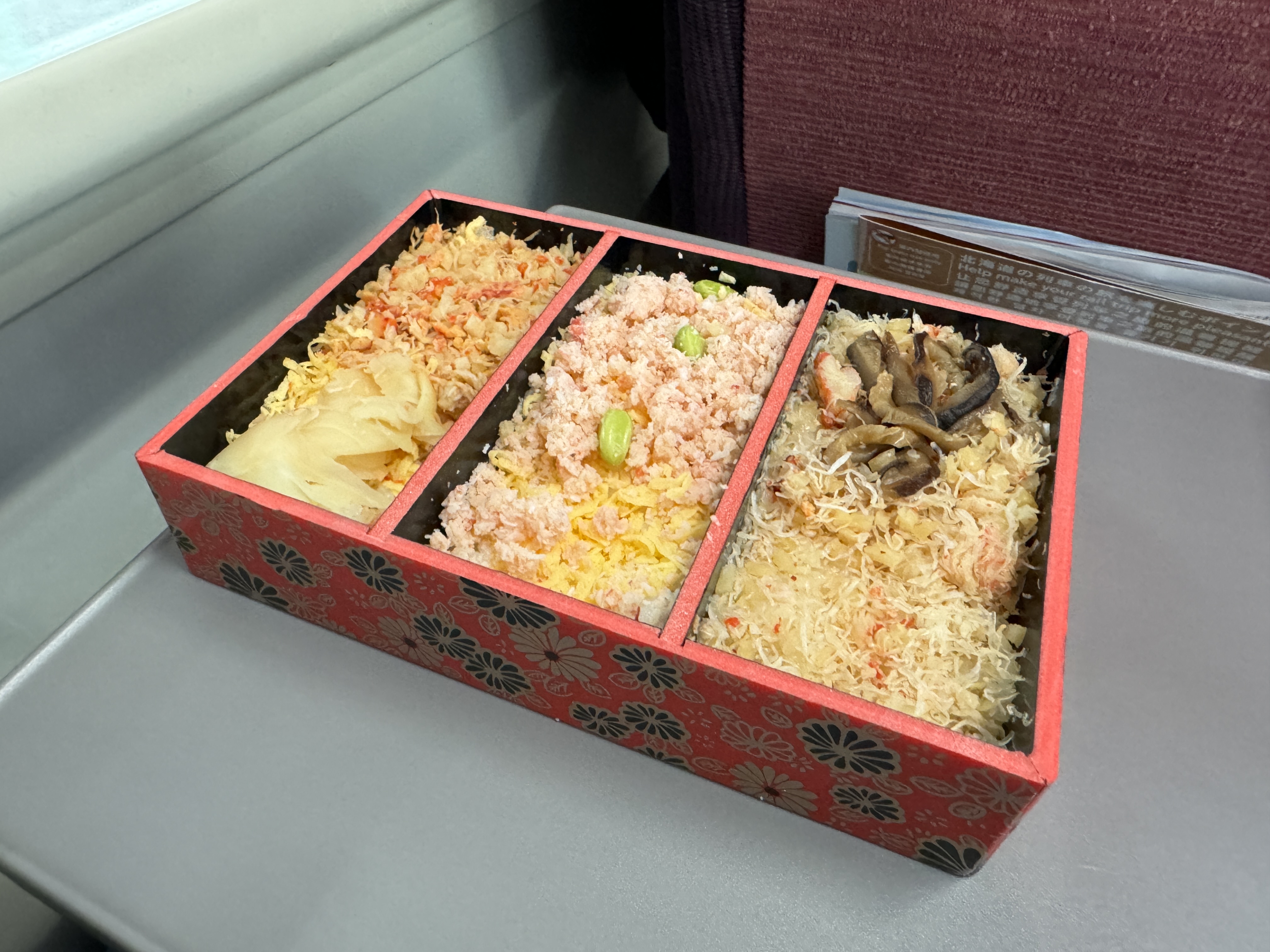 하나사키 게(花咲かに), 홍게(紅すわいがに), 털게(毛がに) 이렇게 3가지 게살을 밥 위에 얹은 도시락이네요.