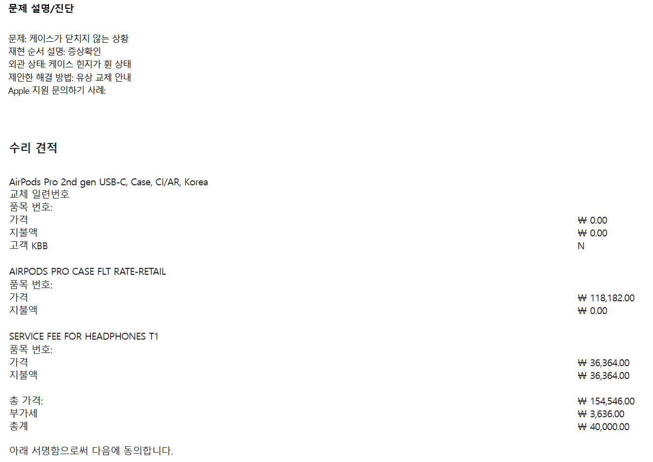 진단 결과는 힌지가 휘어서 그러니 케이스를 교체해야 한다.